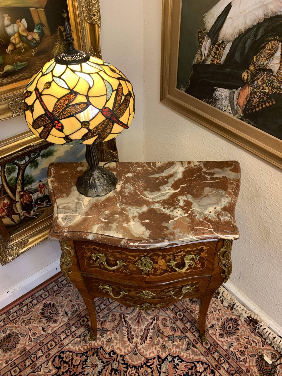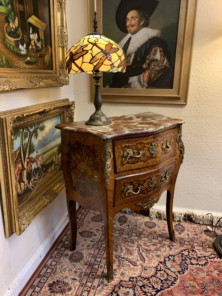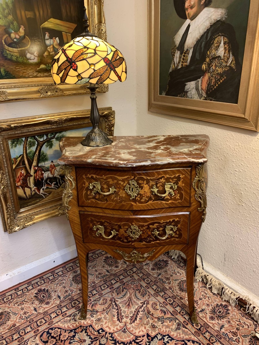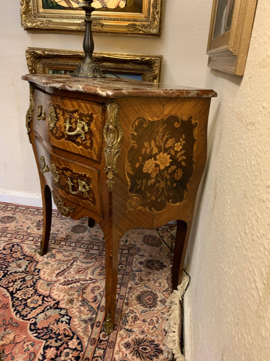 This fabulous French chest is in excellent condition. The shaped marble top sits above a pair of shaped marquetry inlaid drawers, each drawer having gilt handles and escutcheon with a gilt decoration below. The sides of the drawers also have gilt mounts. Shaped marquetry inlaid sides – this stunning commode sits on two out swept legs to the front each with decorative gilt mounts.