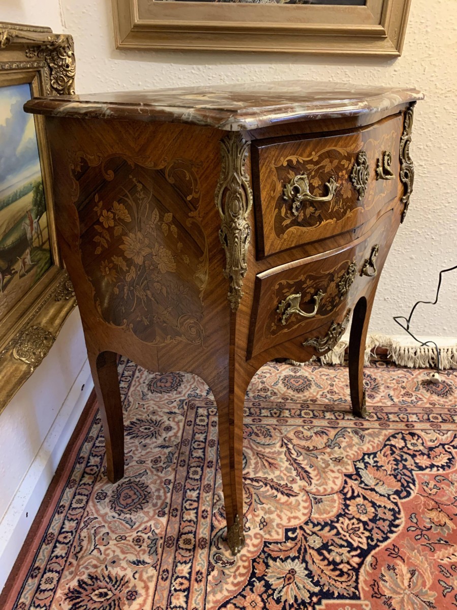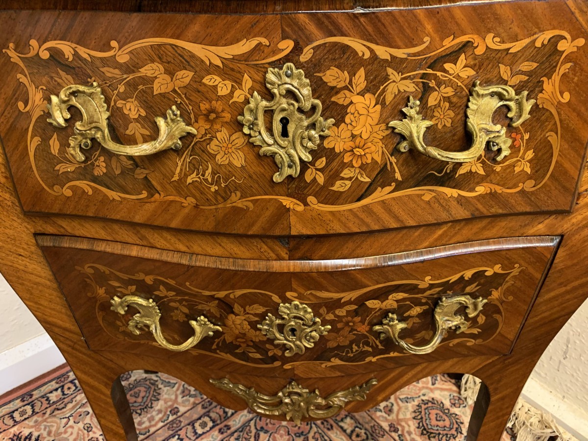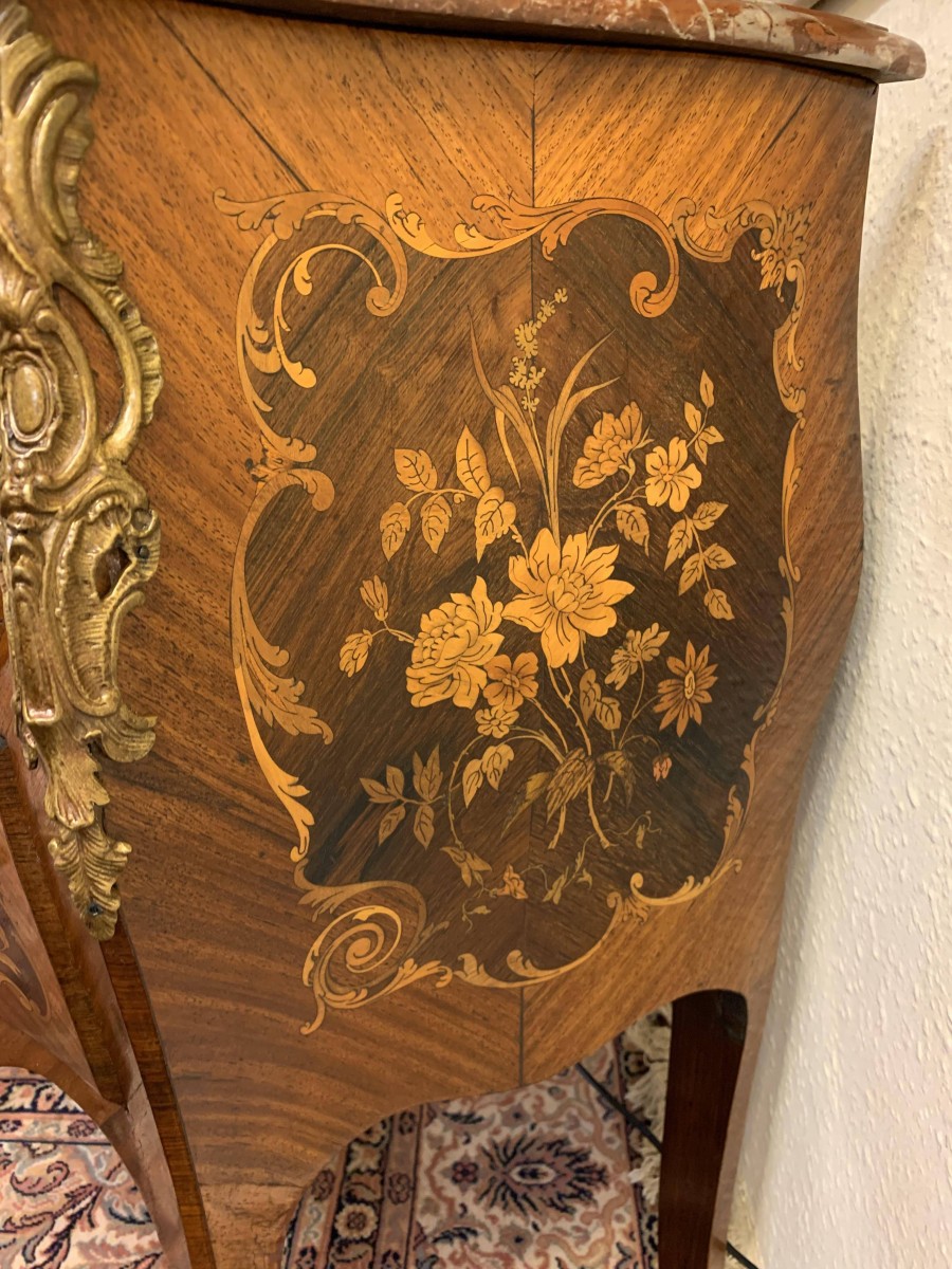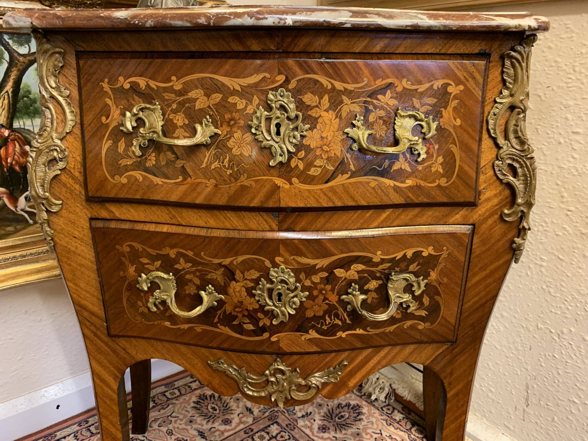 - French Shaped Kingwood Marquetry Inlaid Gilt And Marble Top Commode/chest – Now Sold