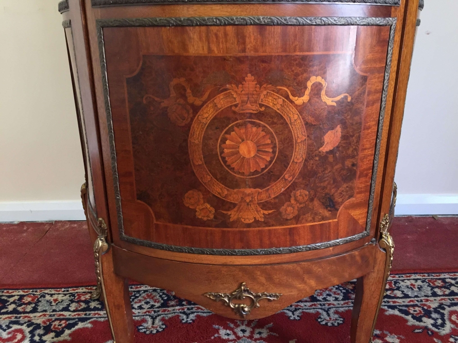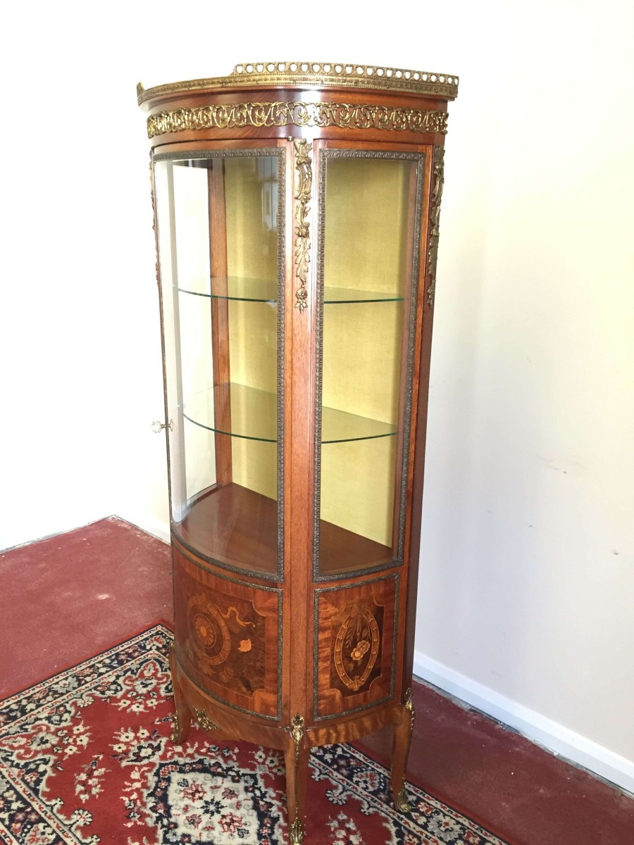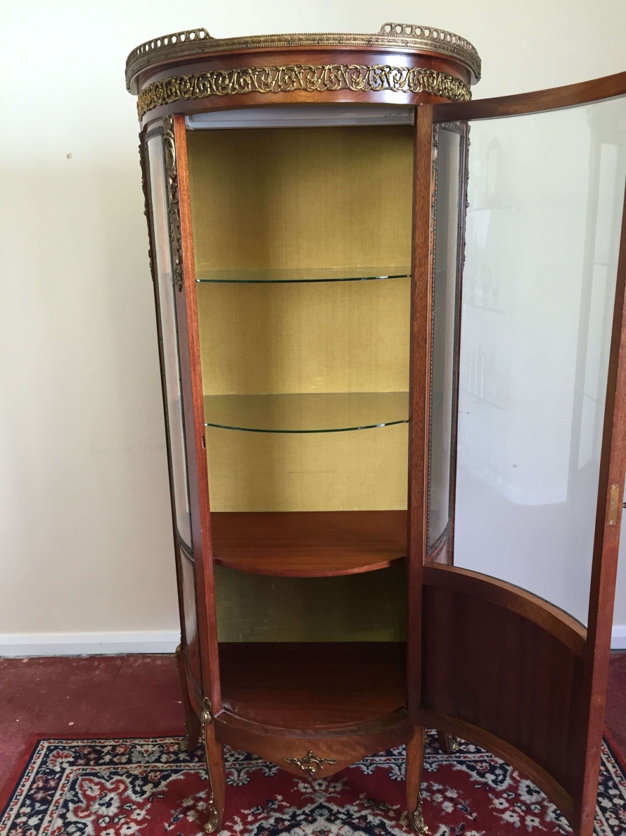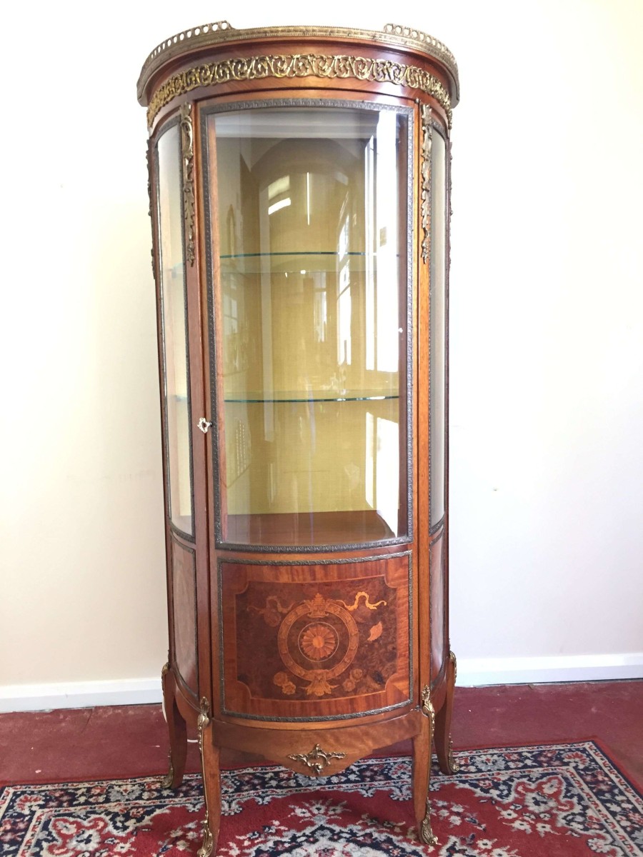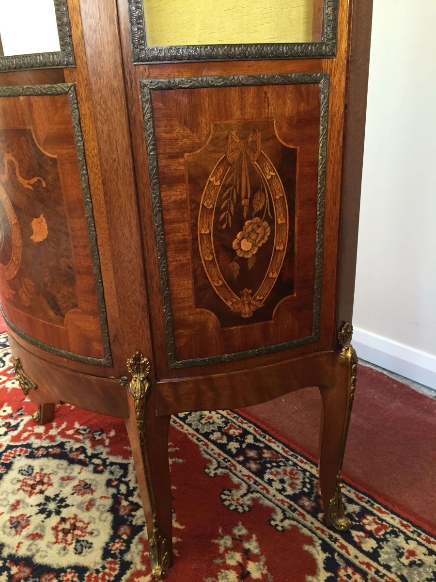 Fantastic French style cabinet with marquetry inlaid panels and brass decoration throughout. Three removable shelves two of which are glass.