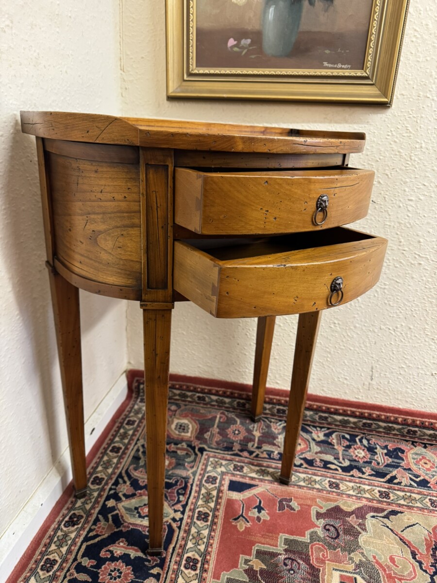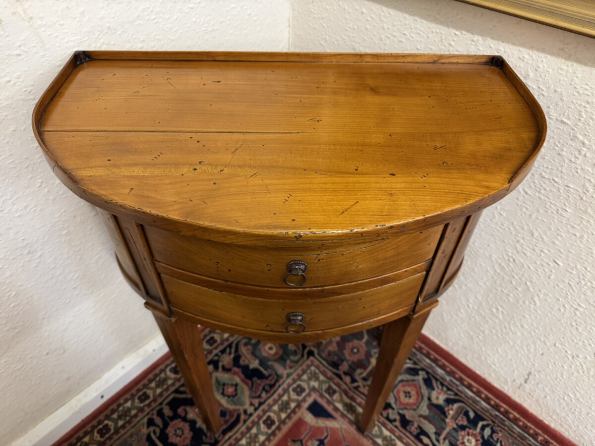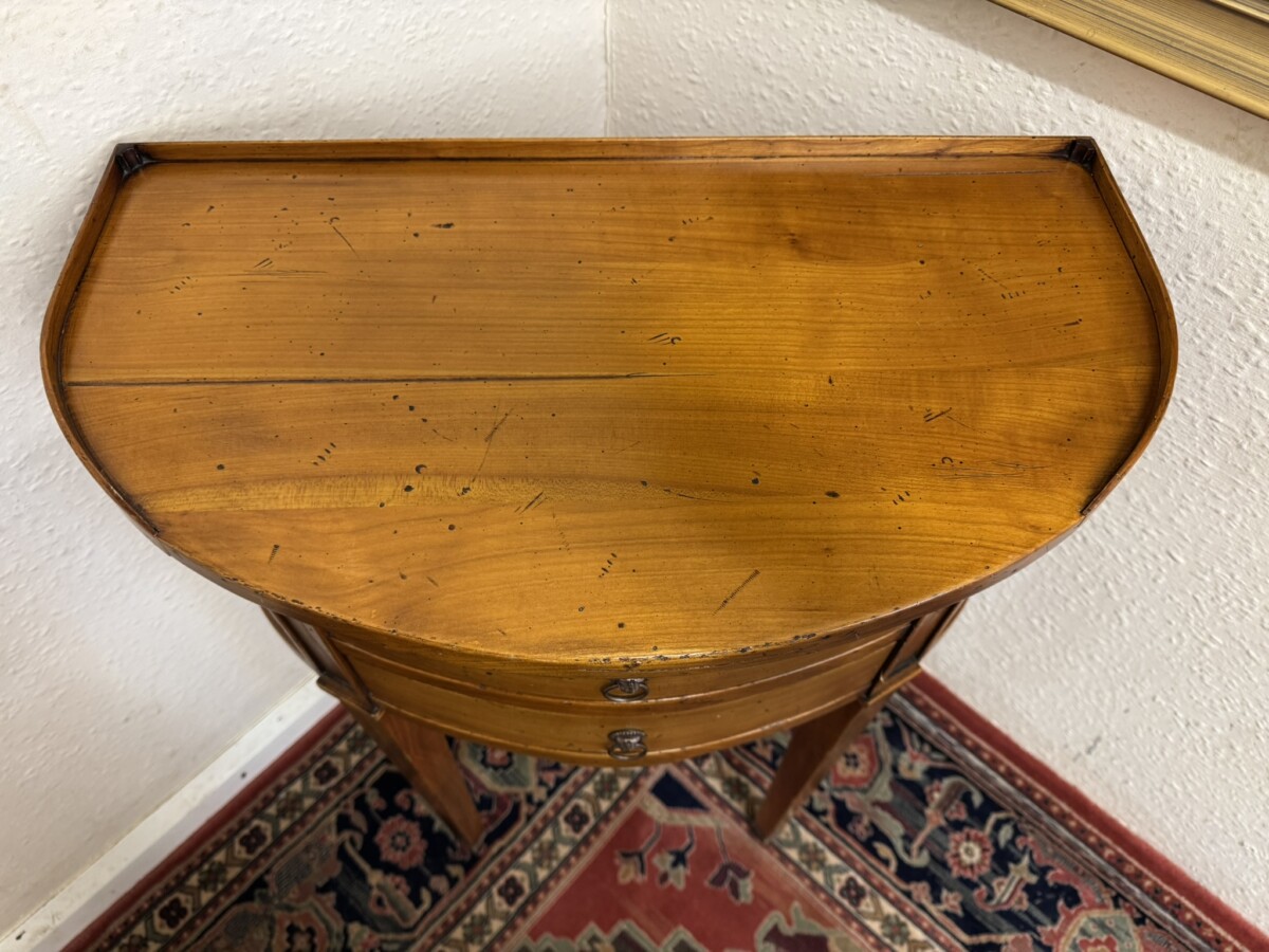 This neat sized demi lune side table is in excellent condition. Raised in gallery back and sides, two curved drawers each with brass handle and standing on four tapered legs with brass capped feet.