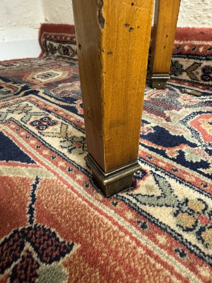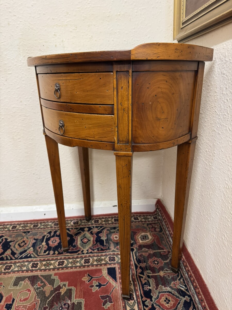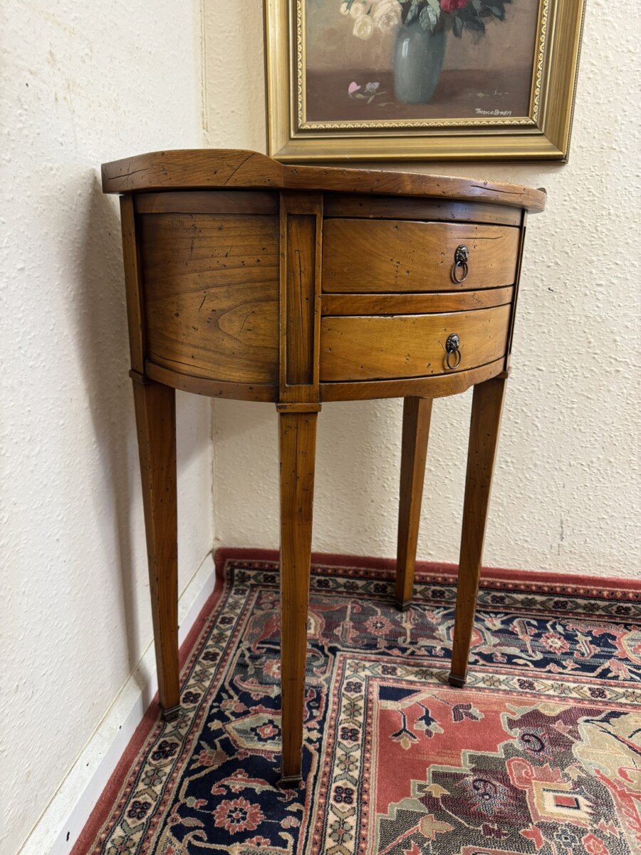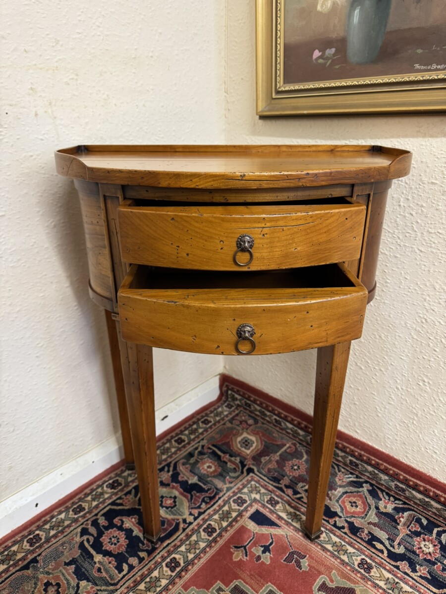 This neat sized demi lune side table is in excellent condition. Raised in gallery back and sides, two curved drawers each with brass handle and standing on four tapered legs with brass capped feet.