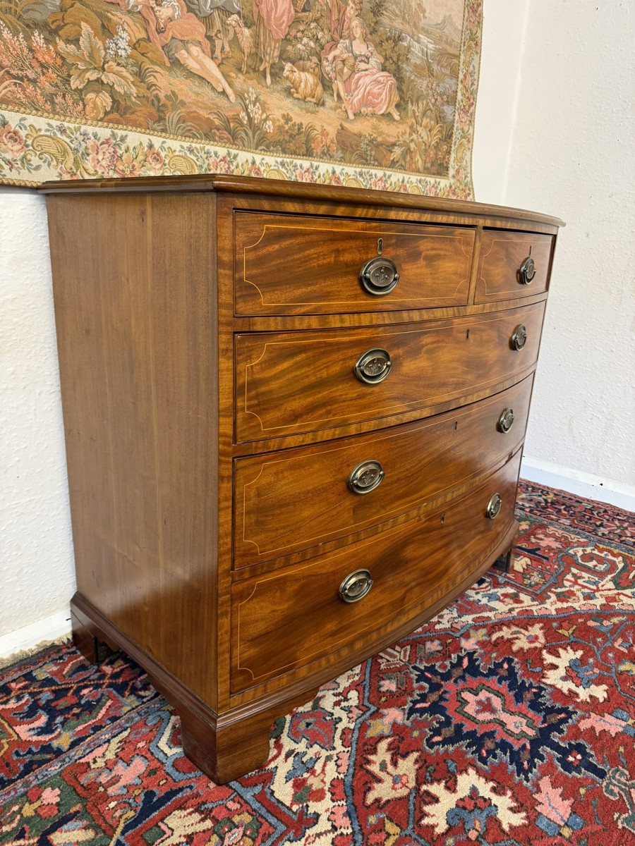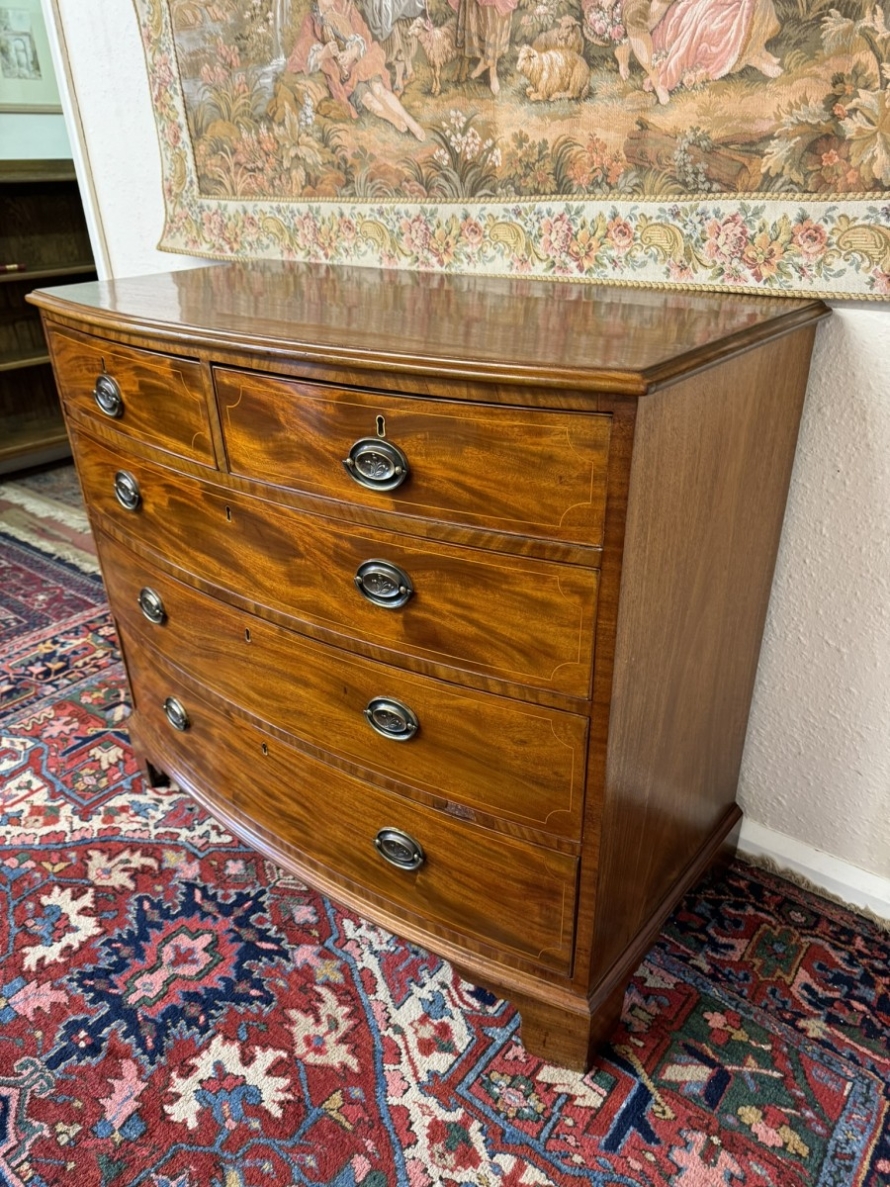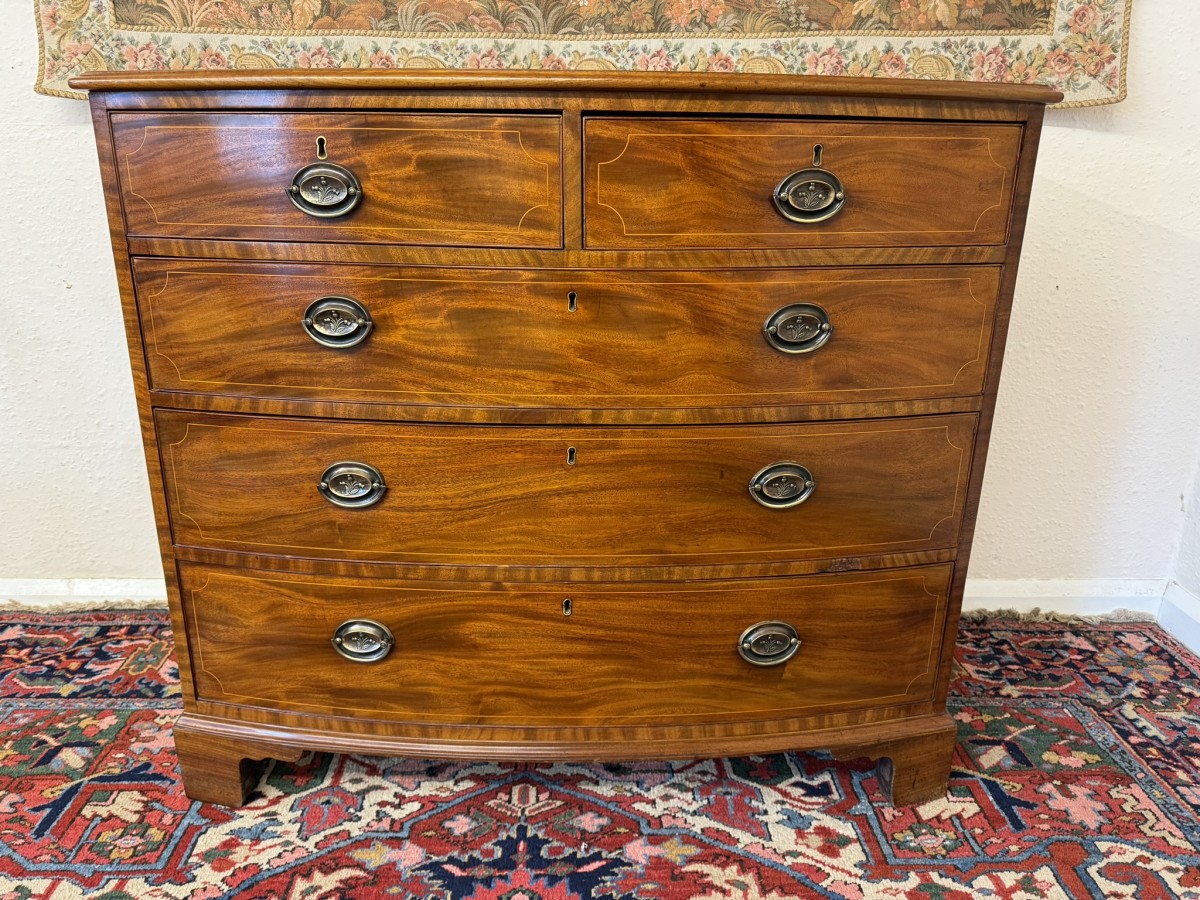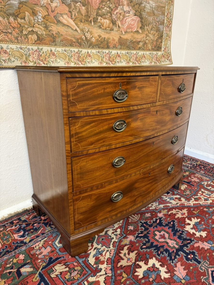 - GEORGIAN ANTIQUE INLAID MAHOGANY BOW FRONT CHEST OF DRAWERS CIRCA 1830