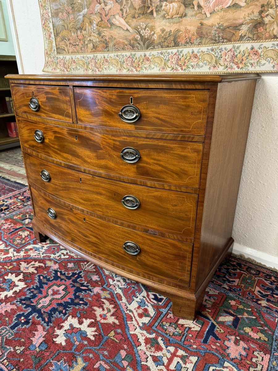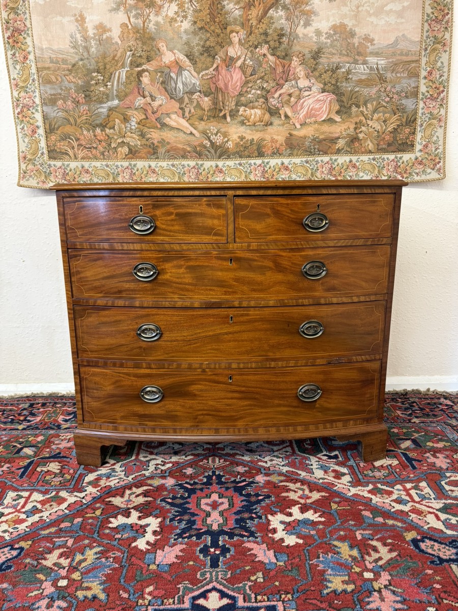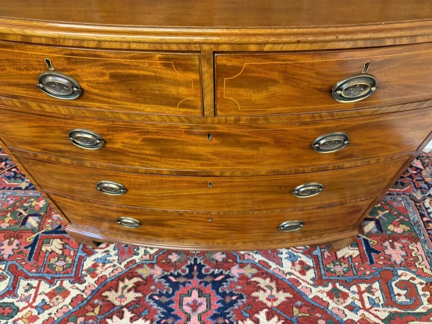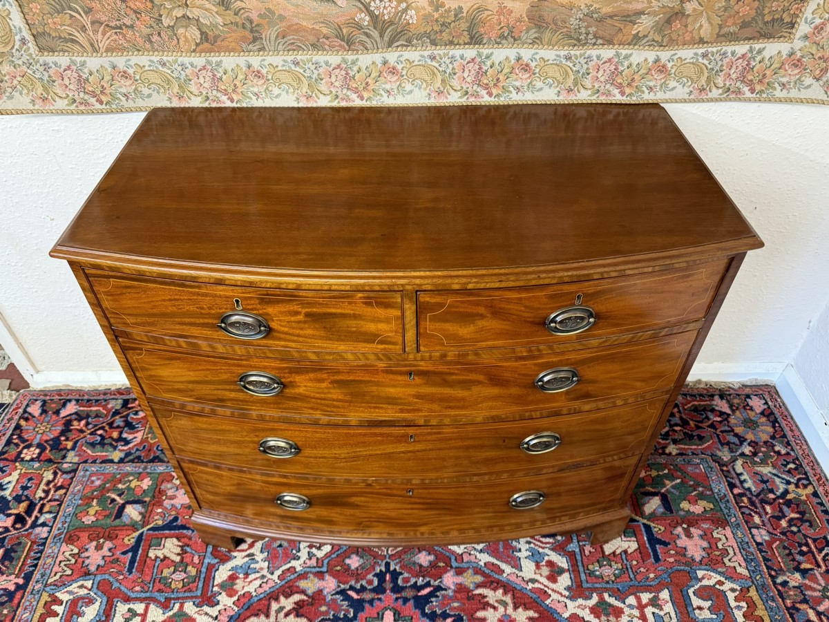 - GEORGIAN ANTIQUE INLAID MAHOGANY BOW FRONT CHEST OF DRAWERS CIRCA 1830