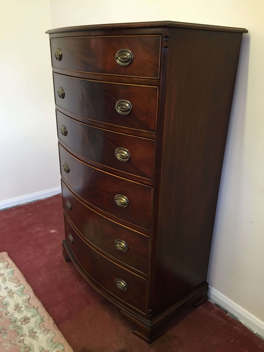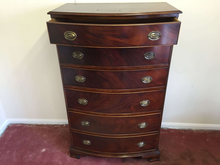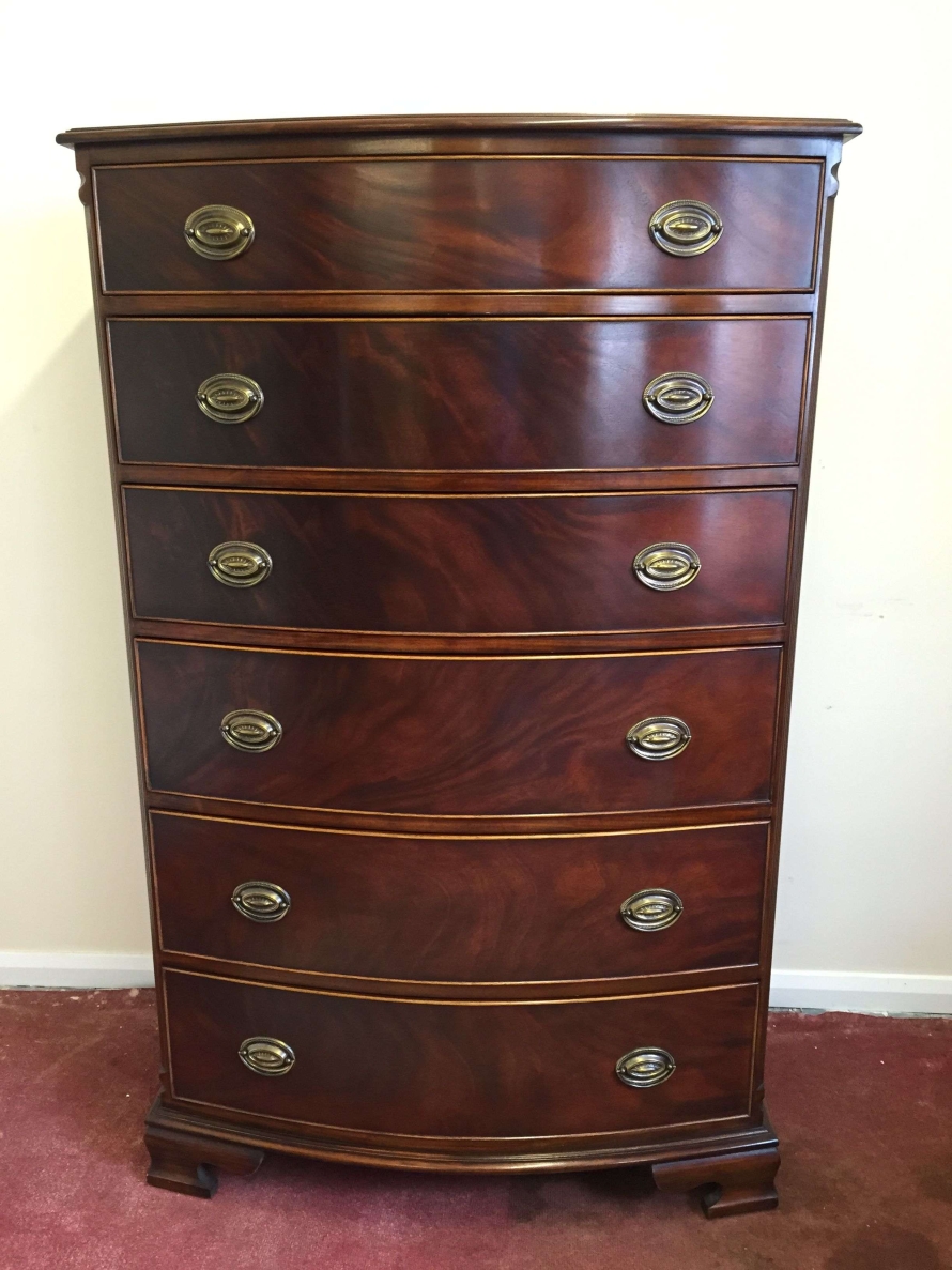 Bow fronted lovely mahogany six drawer chest. Each drawer has a pair of brass handles, standing on bracket feet.