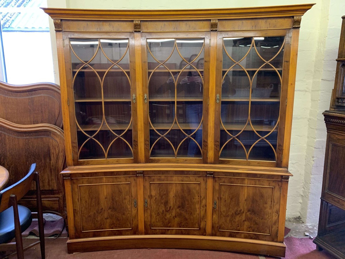 We are delighted to offer this top quality Yew Wood bookcase made in the manner of the Georgian period and produced by the renowned Bevan Funnell furniture company. Concave in shape the bookcase has three lockable glazed doors, each door having decorative wood barring. The doors open to reveal nine adjustable and removable shelves. Below are three lockable cupboard doors, each cupboard offering ample storage. A top quality item of furniture.