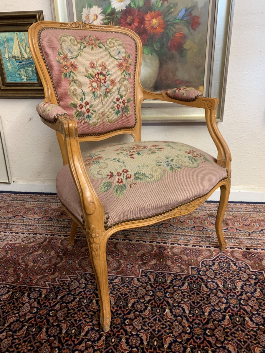 This beautiful French chair has a shaped needlepoint upholstered back with carved decoration above. Two shaped arms with needlepoint cushioned armrests, cushioned needlepoint seat, shaped skirt with central carving and standing on two carved cabriole shaped legs to the front.