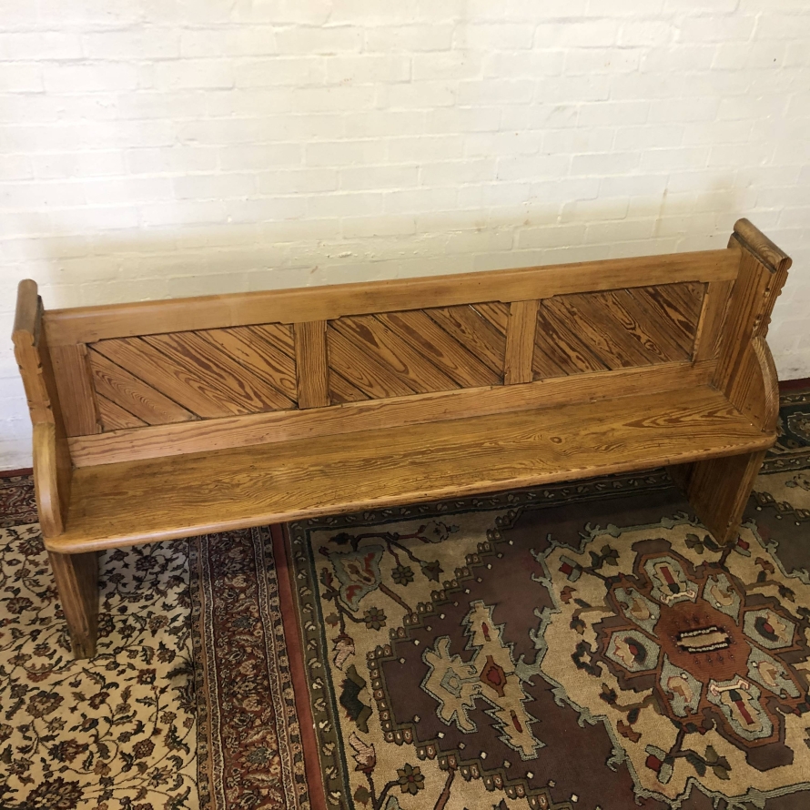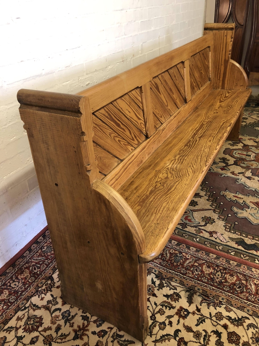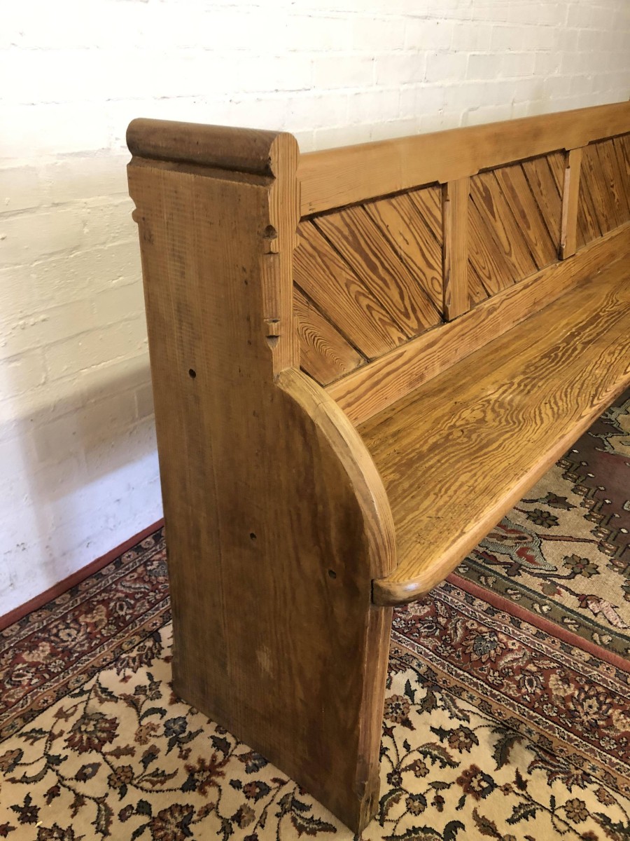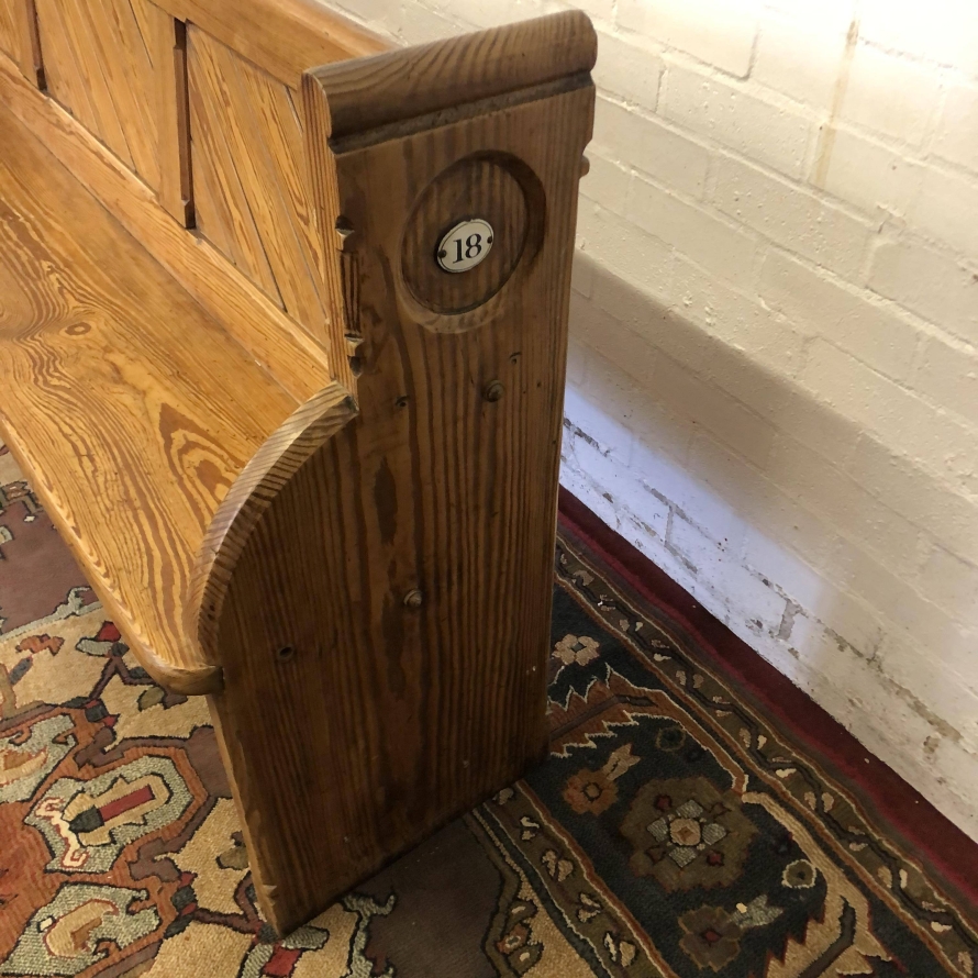 This gorgeous Victorian pew is made entirely from vibrant pitch pine. Having shaped ends, original number 18 plaque, recessed panelled back and with a shelf to the back. Offering good seating space.