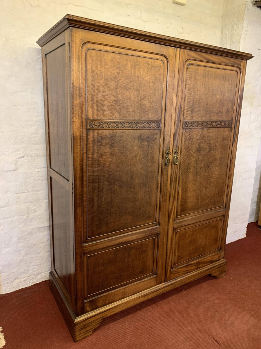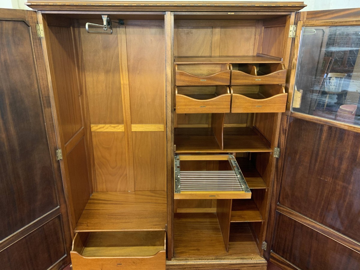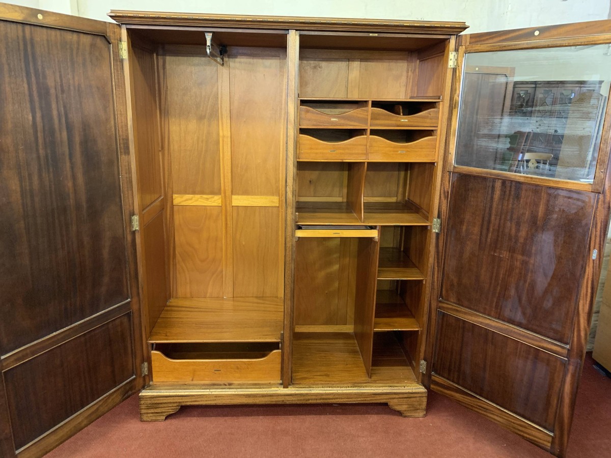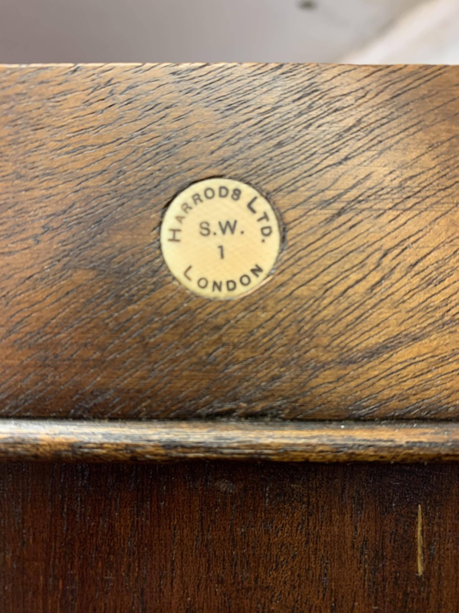 This handsome gentleman's wardrobe dates Circa 1920 and is in excellent condition. It was sold in the iconic Harrods Ltd department store S.W 1 London. The oversailing top has a carved edge. Below are a pair of panelled doors, each door having decorative carving to the top panel and a brass ornate drop handle. The doors open to offer an array of storage space featuring a chrome sliding hanging rail, labelled sliding storage drawers, shelving and a retractable chrome trouser rail. To the top of each door on the inside is a Harrods Ltd SW1 of London button, behind the right-hand door is a mirror. Sitting on a base with bracket feet.