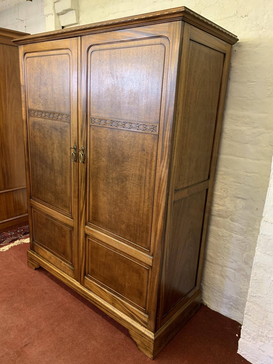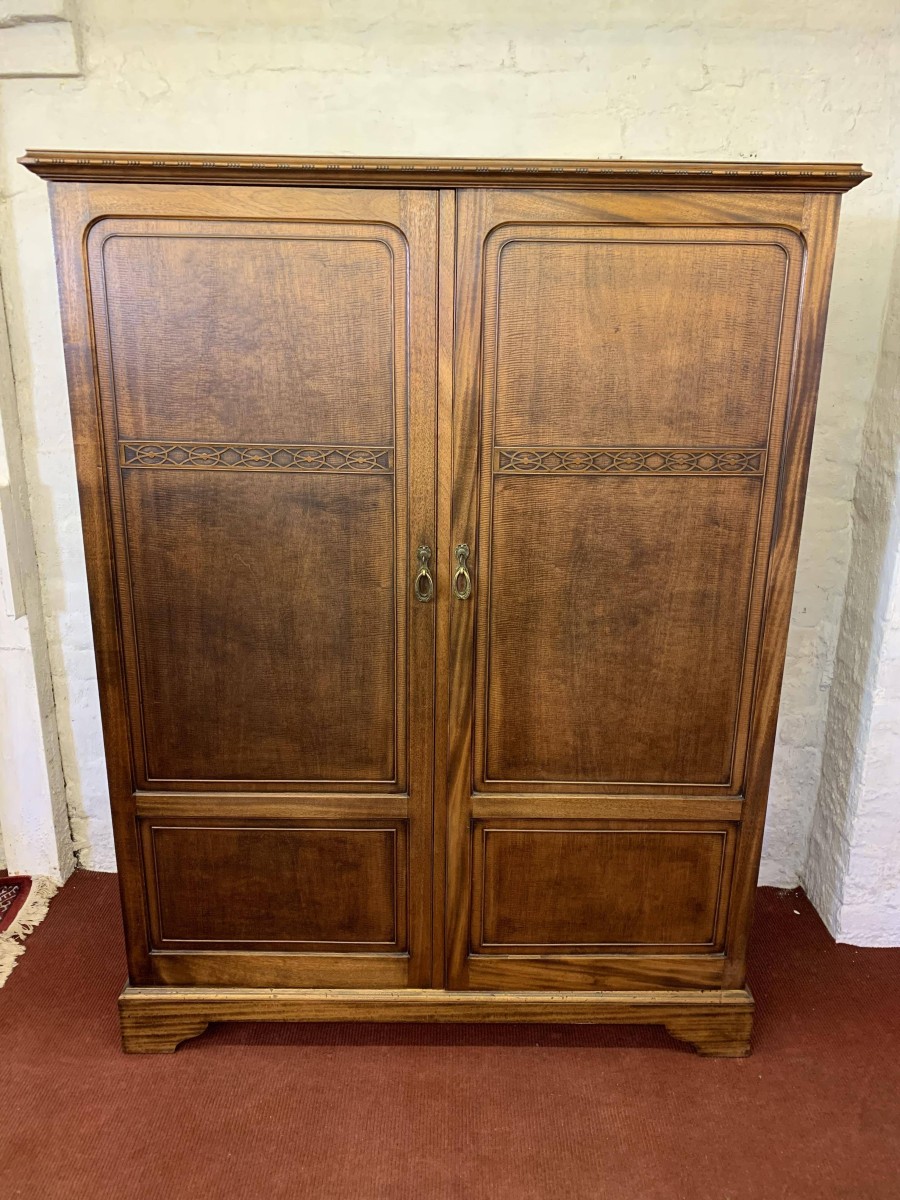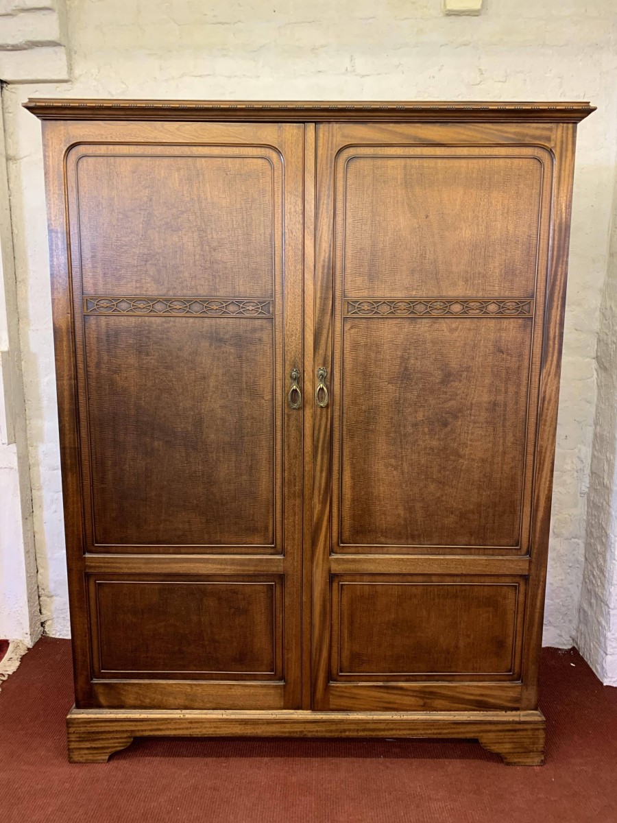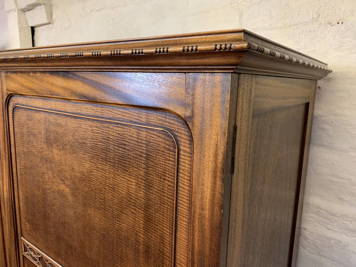 This handsome gentleman's wardrobe dates Circa 1920 and is in excellent condition. It was sold in the iconic Harrods Ltd department store S.W 1 London. The oversailing top has a carved edge. Below are a pair of panelled doors, each door having decorative carving to the top panel and a brass ornate drop handle. The doors open to offer an array of storage space featuring a chrome sliding hanging rail, labelled sliding storage drawers, shelving and a retractable chrome trouser rail. To the top of each door on the inside is a Harrods Ltd SW1 of London button, behind the right-hand door is a mirror. Sitting on a base with bracket feet.