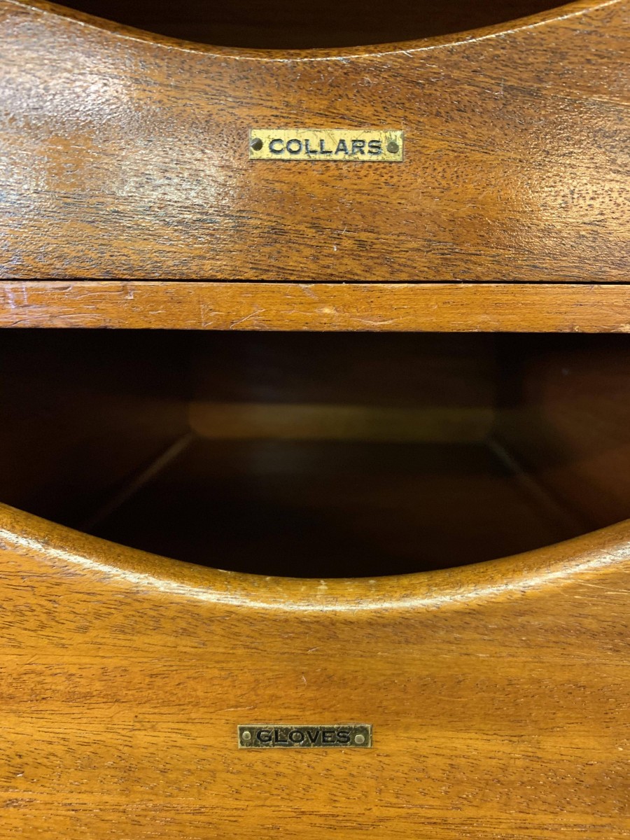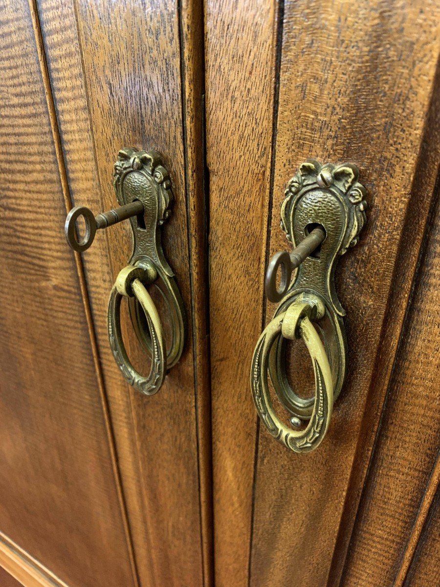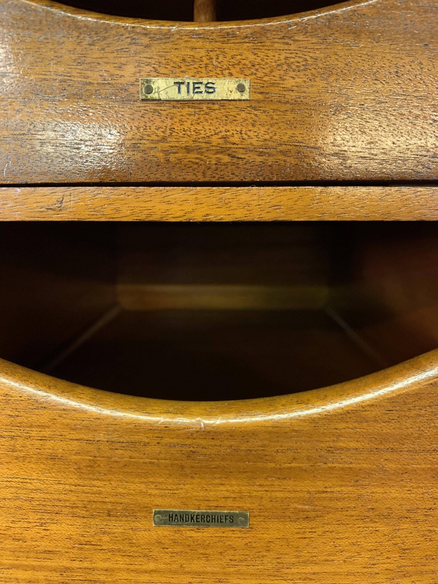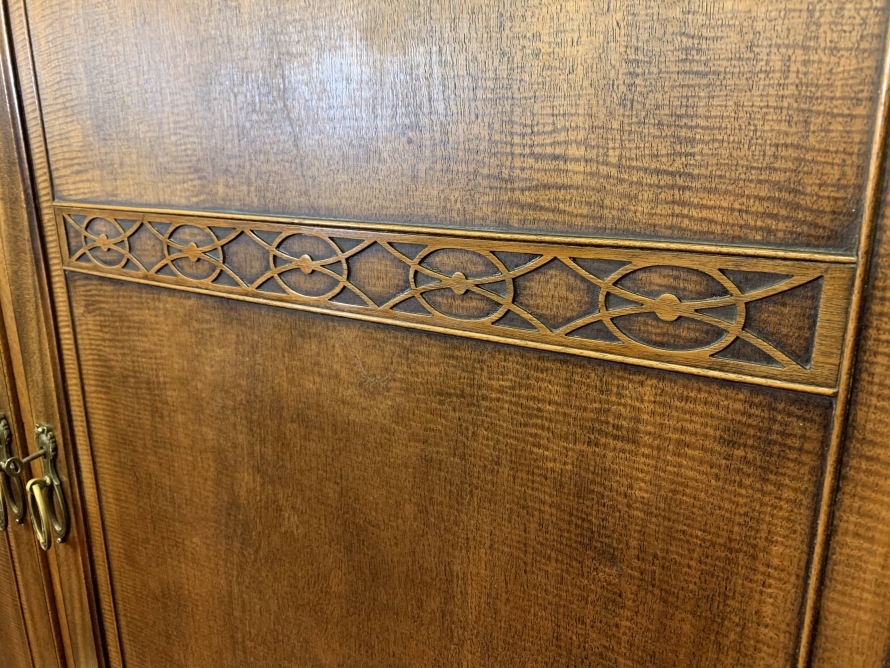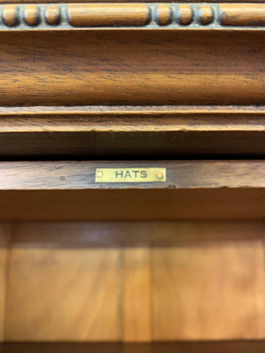 This handsome gentleman's wardrobe dates Circa 1920 and is in excellent condition. It was sold in the iconic Harrods Ltd department store S.W 1 London. The oversailing top has a carved edge. Below are a pair of panelled doors, each door having decorative carving to the top panel and a brass ornate drop handle. The doors open to offer an array of storage space featuring a chrome sliding hanging rail, labelled sliding storage drawers, shelving and a retractable chrome trouser rail. To the top of each door on the inside is a Harrods Ltd SW1 of London button, behind the right-hand door is a mirror. Sitting on a base with bracket feet.