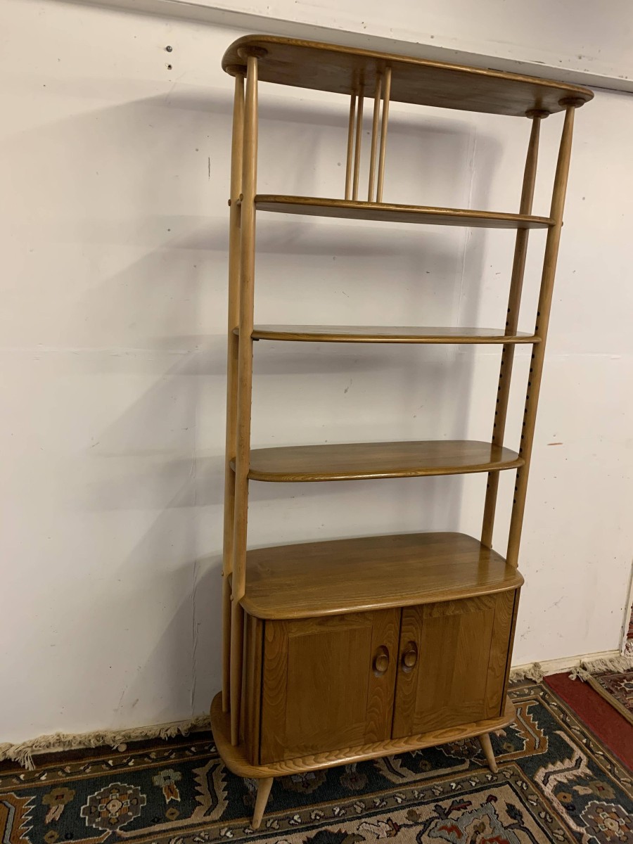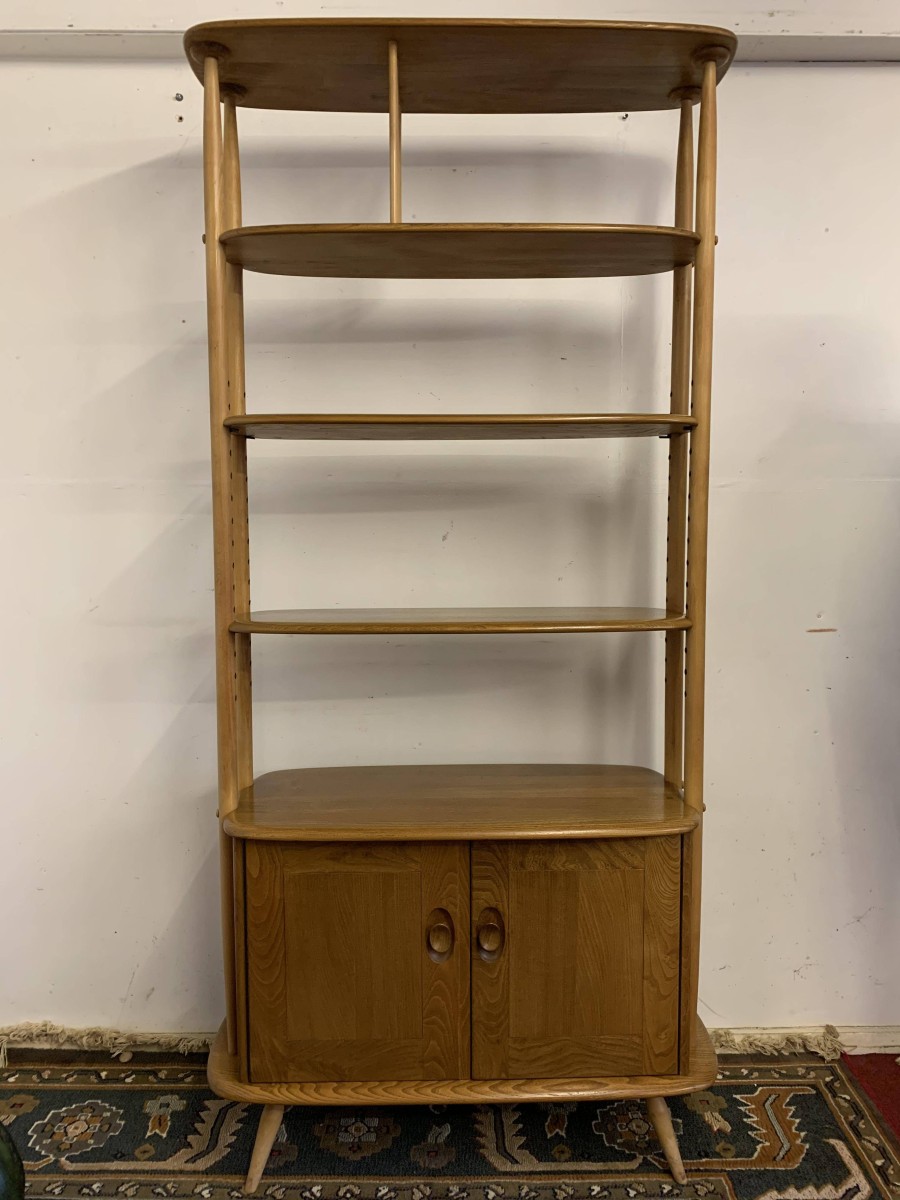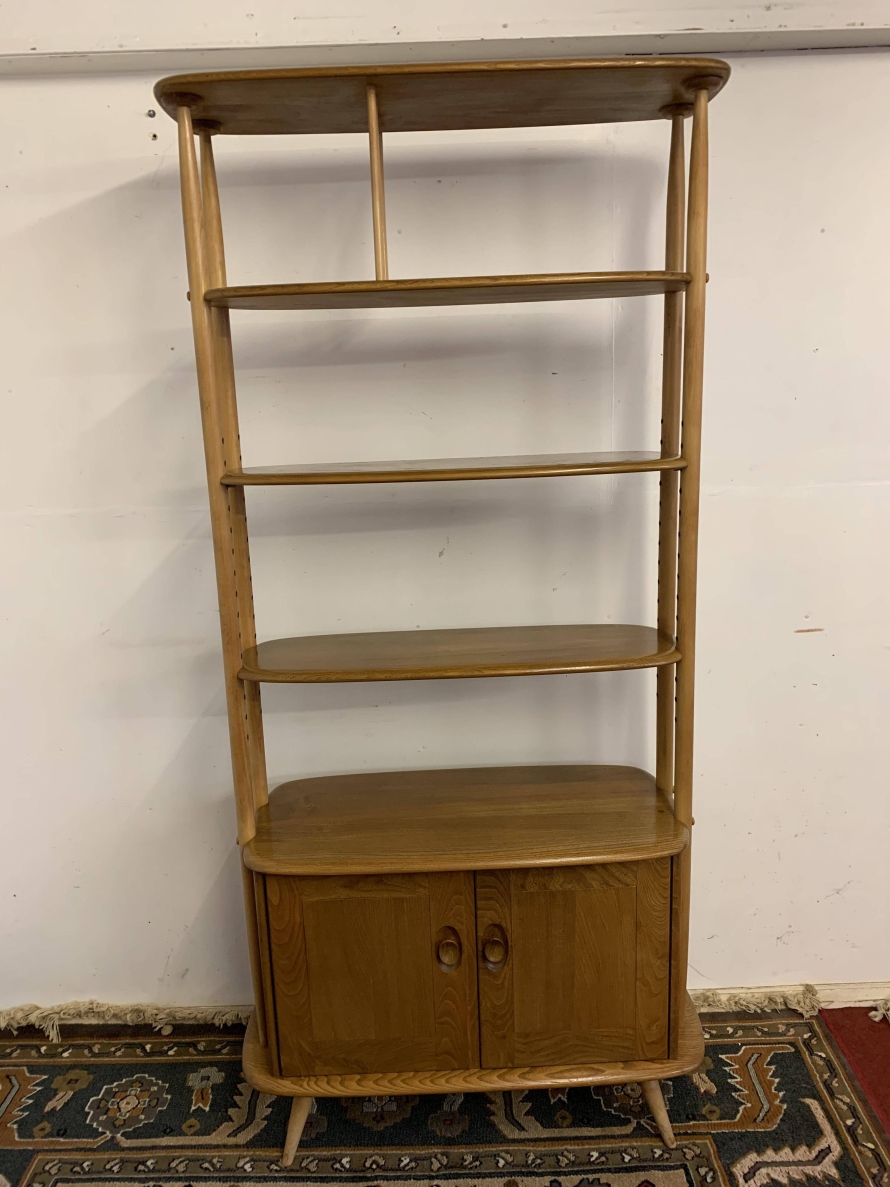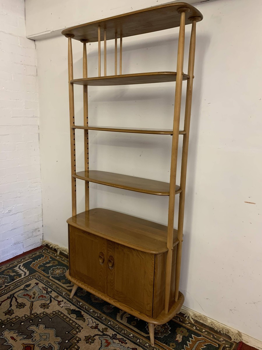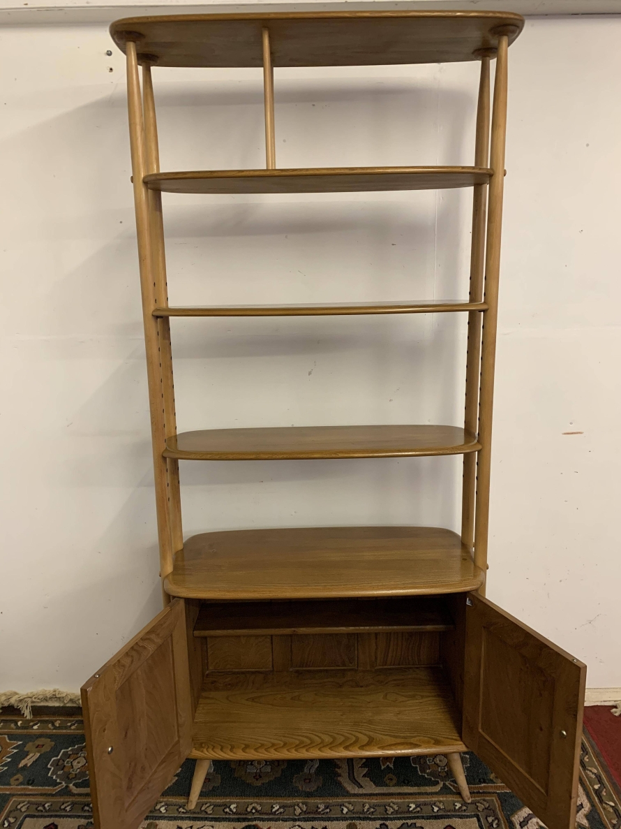 Made in elm and beech wood there are four tiers of adjustable open shelving. Below is a two door cupboard unit which opens to reveal a shelf. The grain of the elm is striking. Beautifully crafted with trademark Ercol detail including hammer shaft joints and beech spindle bars. A truly stylish iconic item of fantastic quality Ercol furniture.