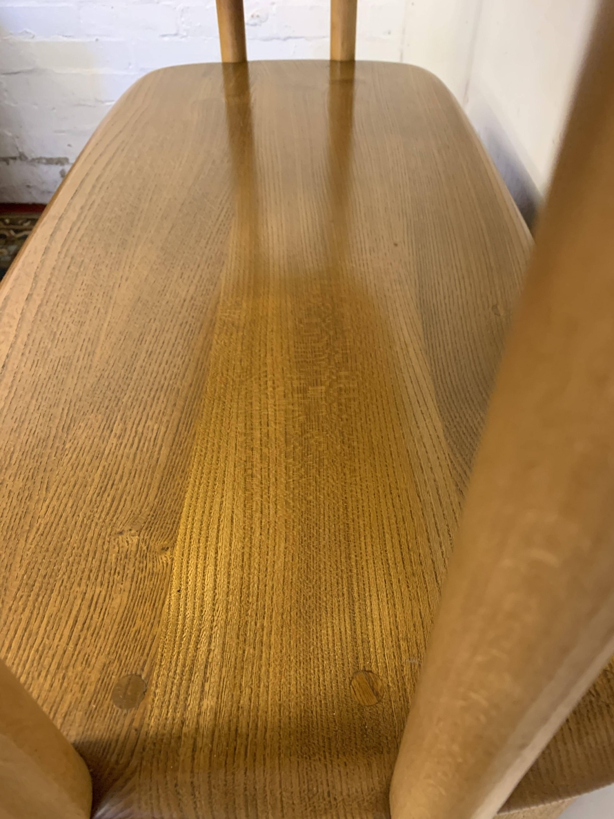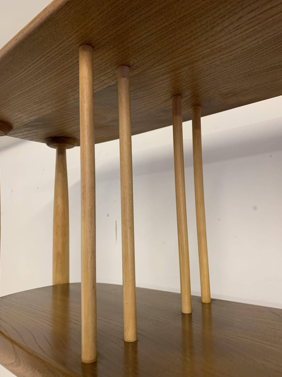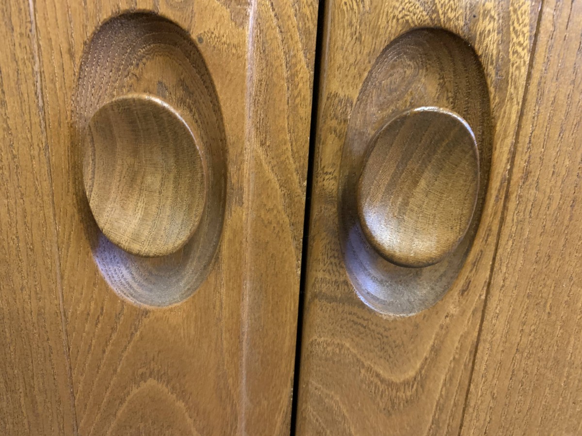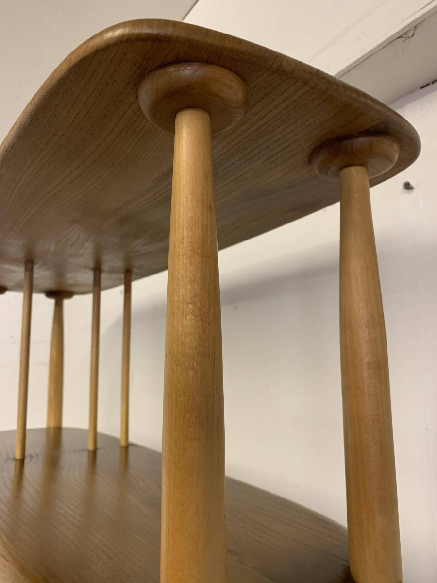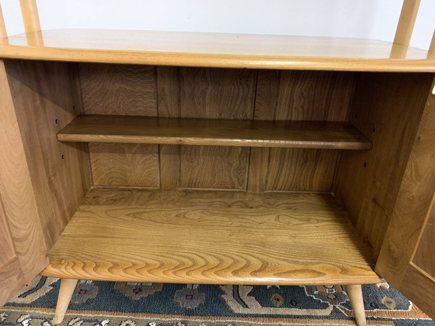 Made in elm and beech wood there are four tiers of adjustable open shelving. Below is a two door cupboard unit which opens to reveal a shelf. The grain of the elm is striking. Beautifully crafted with trademark Ercol detail including hammer shaft joints and beech spindle bars. A truly stylish iconic item of fantastic quality Ercol furniture.