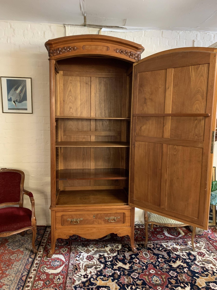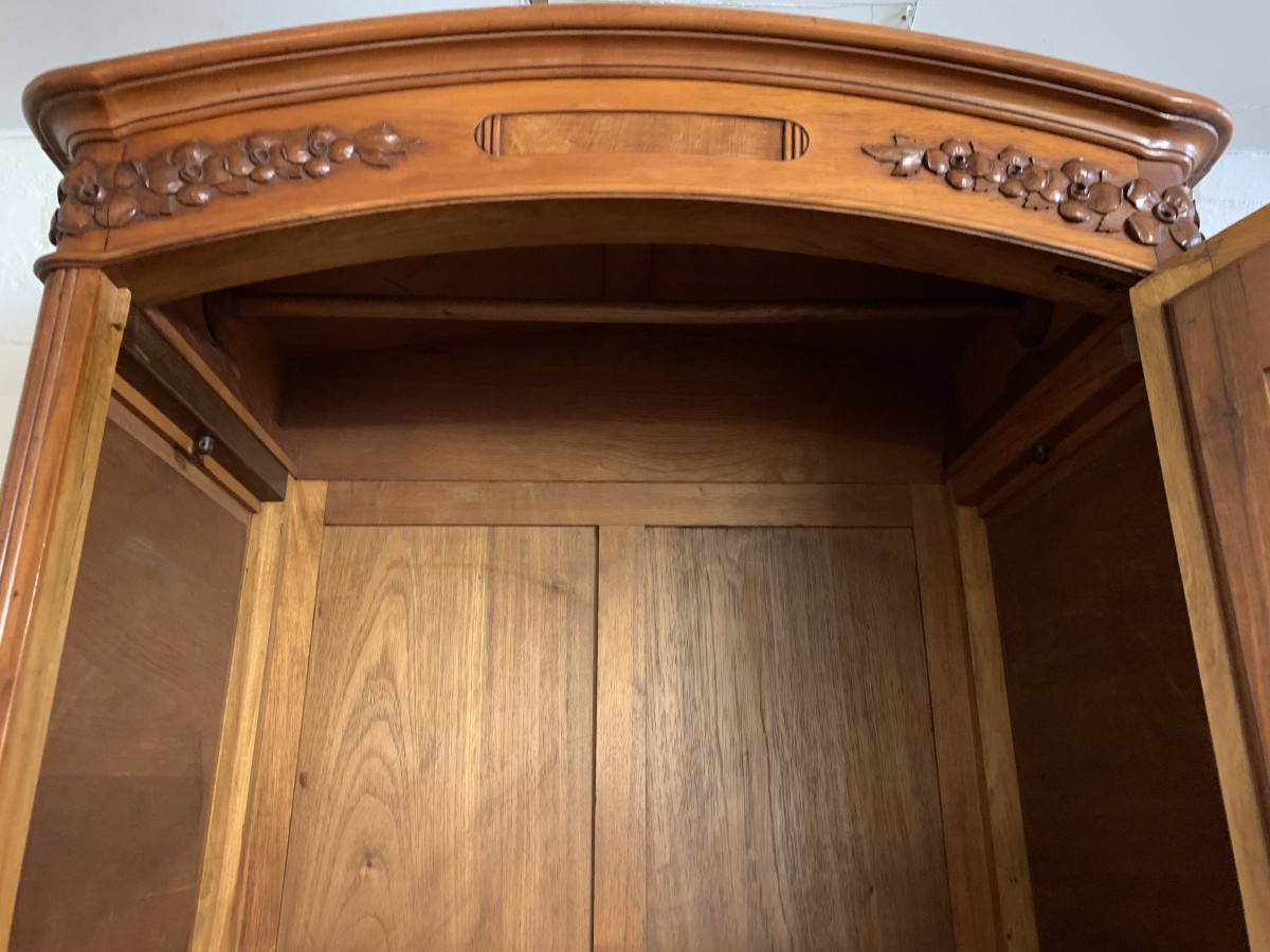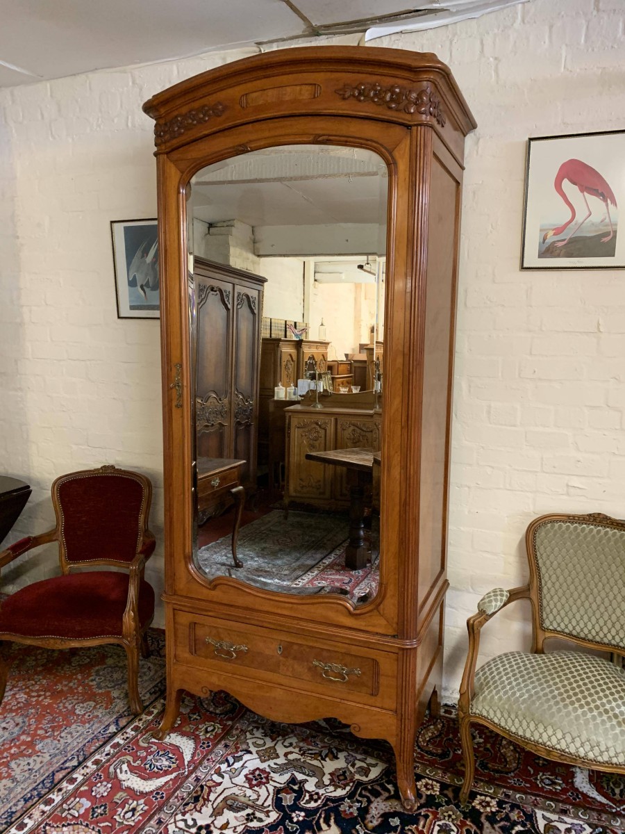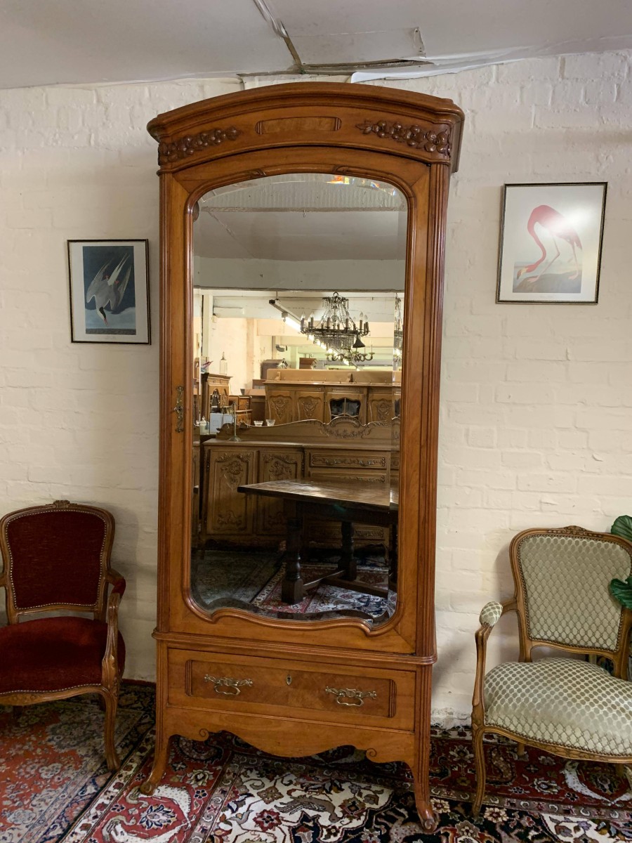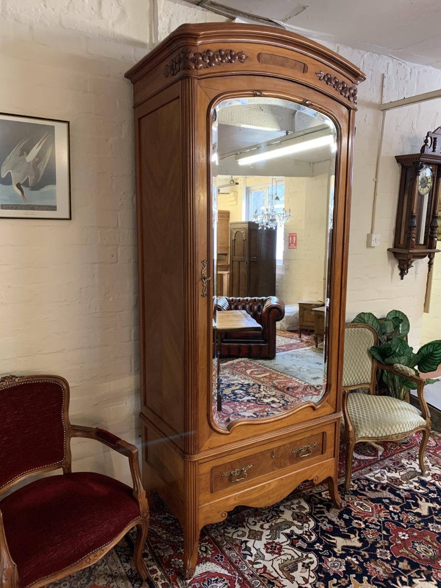 The shaped oversailing top has floral carved decoration. Below is a shaped bevel edged lockable mirrored door, the door opens to reveal a hanging rail above three adjustable and removable shelves. Behind the door is a rail. Below is a drawer, the drawer having a pair of decorative brass handles. Recessed panelled sides, reeded decoration this fabulous armoire stands on two carved cabriole shaped legs to the front. Please note that this armoire completely splits down for easy transportation and delivery.