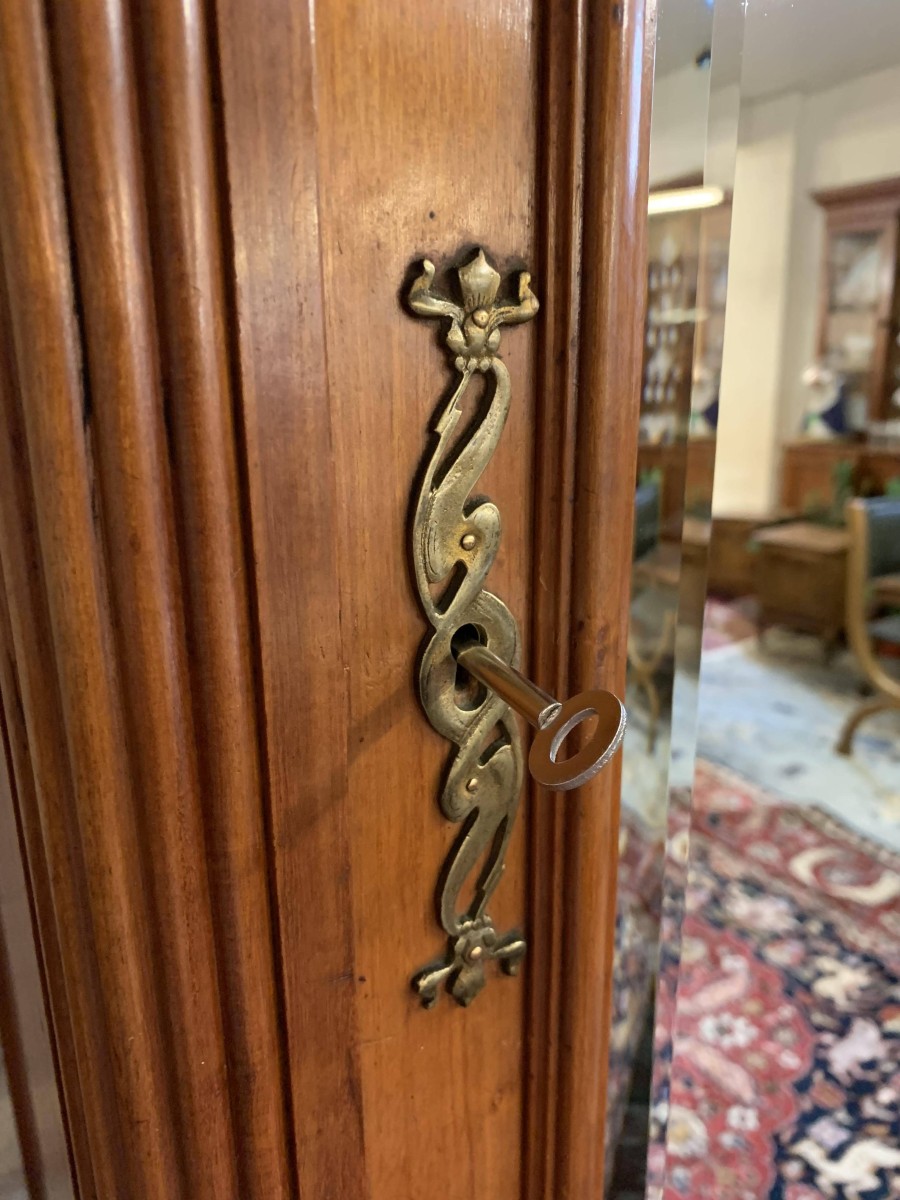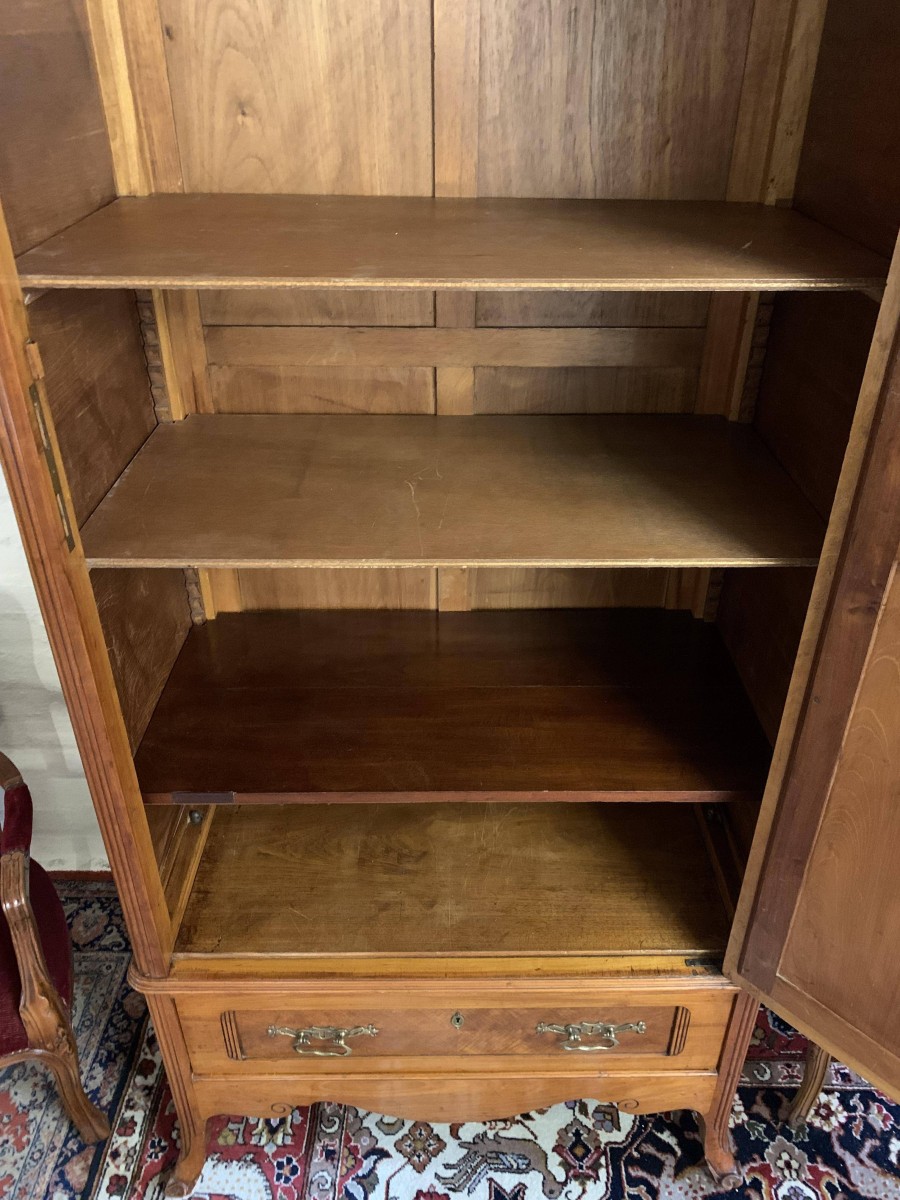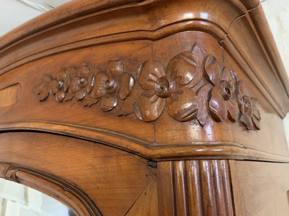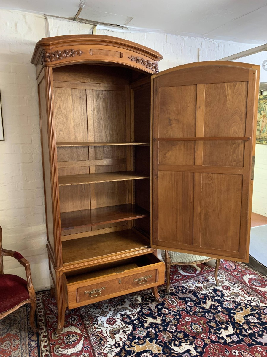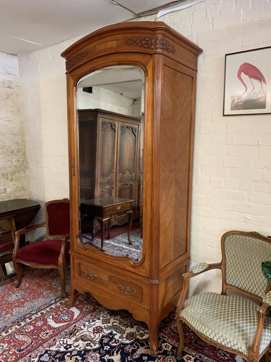 The shaped oversailing top has floral carved decoration. Below is a shaped bevel edged lockable mirrored door, the door opens to reveal a hanging rail above three adjustable and removable shelves. Behind the door is a rail. Below is a drawer, the drawer having a pair of decorative brass handles. Recessed panelled sides, reeded decoration this fabulous armoire stands on two carved cabriole shaped legs to the front. Please note that this armoire completely splits down for easy transportation and delivery.