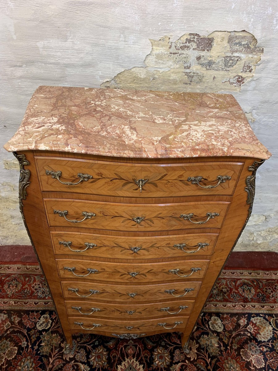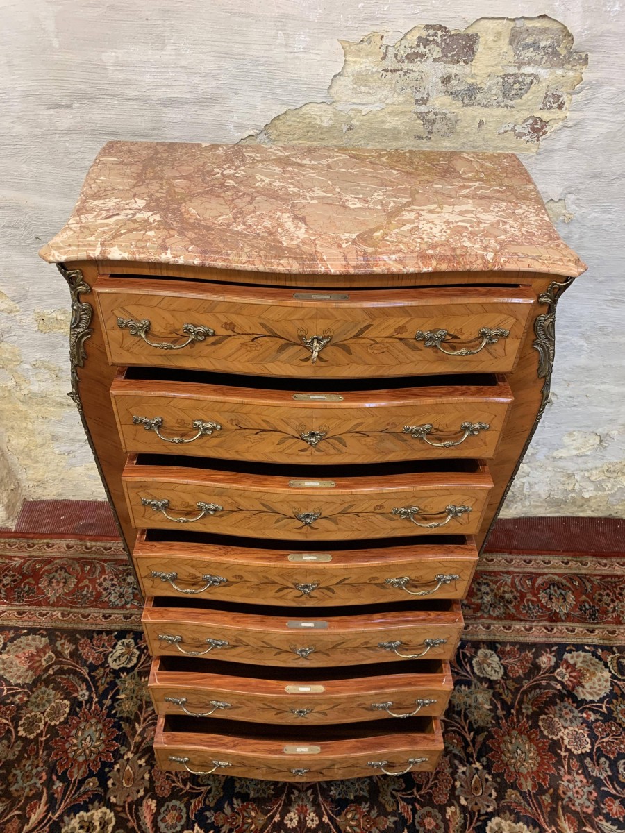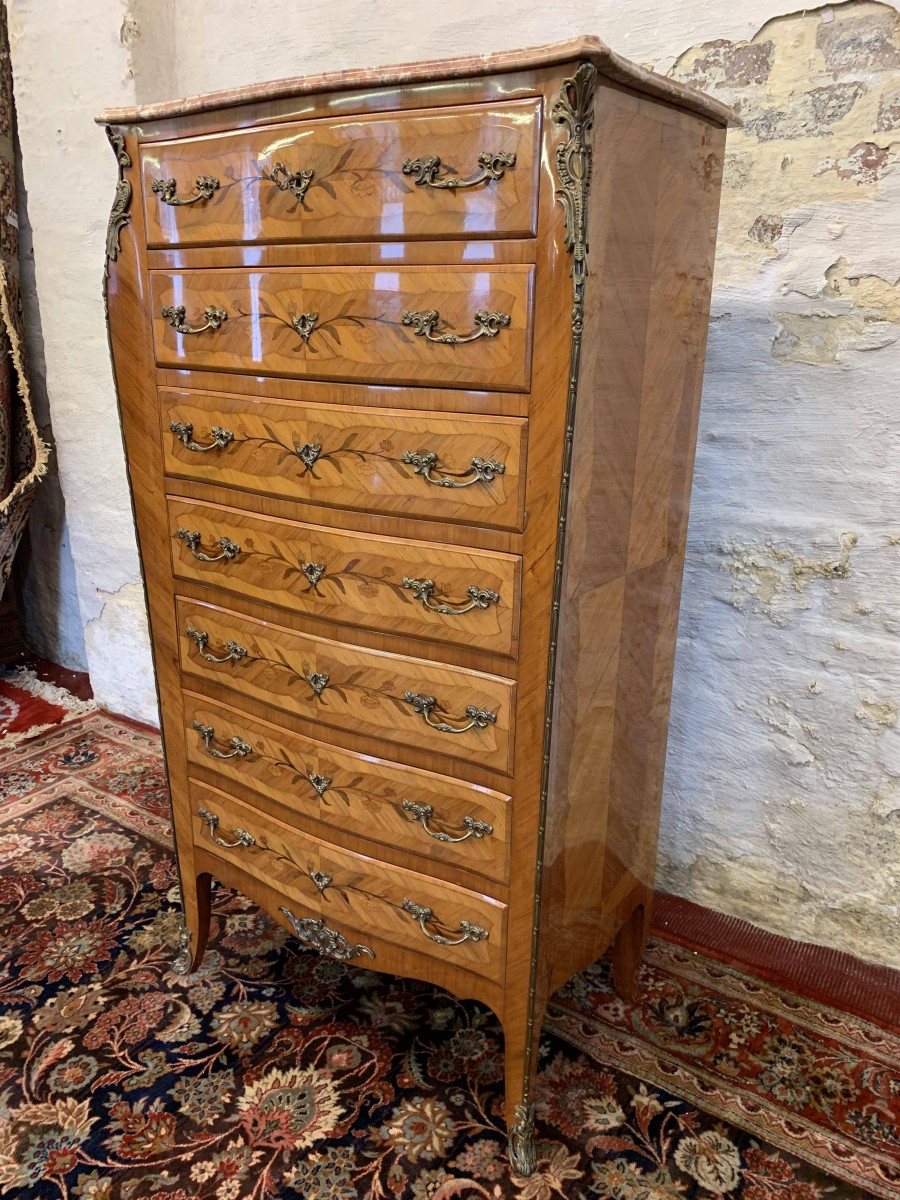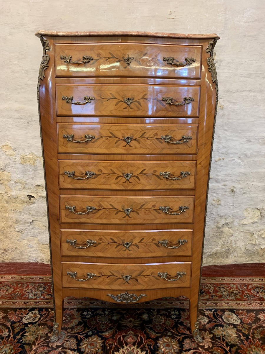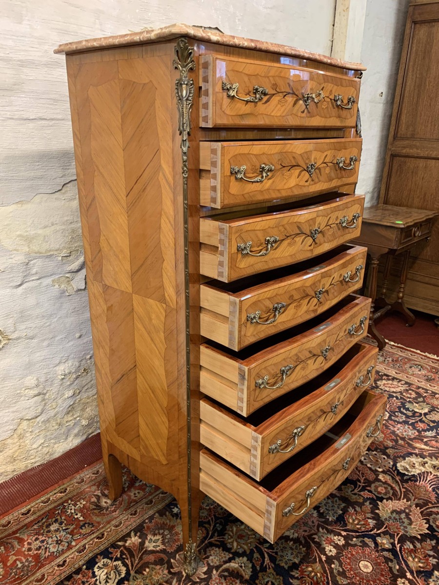 A fine example of French furniture which is in excellent condition. The shaped marble top sits above seven shaped lockable drawers, each drawer having a pair of decorative handles and marquetry inlaid decoration. Either side of the drawers has ormolu decoration with an ormolu plaque at the bottom of the drawers. Beautiful shaped sides, this super chest of drawers stands on four cabriole legs, the front pair of legs having ormolu feet.