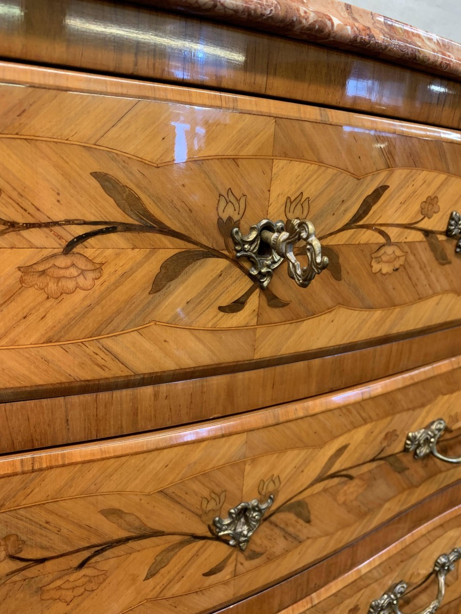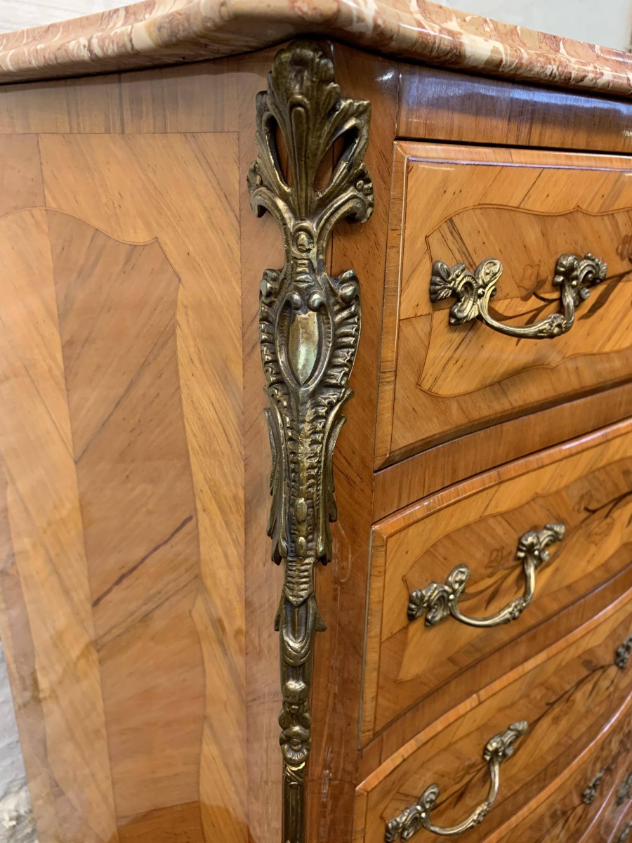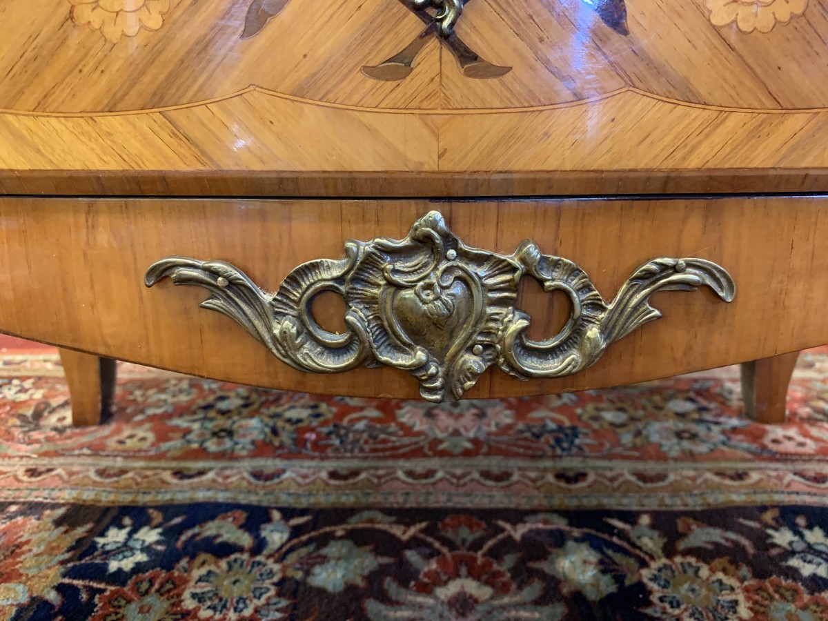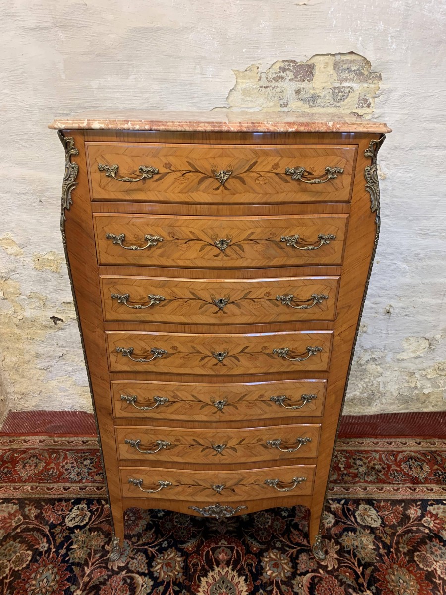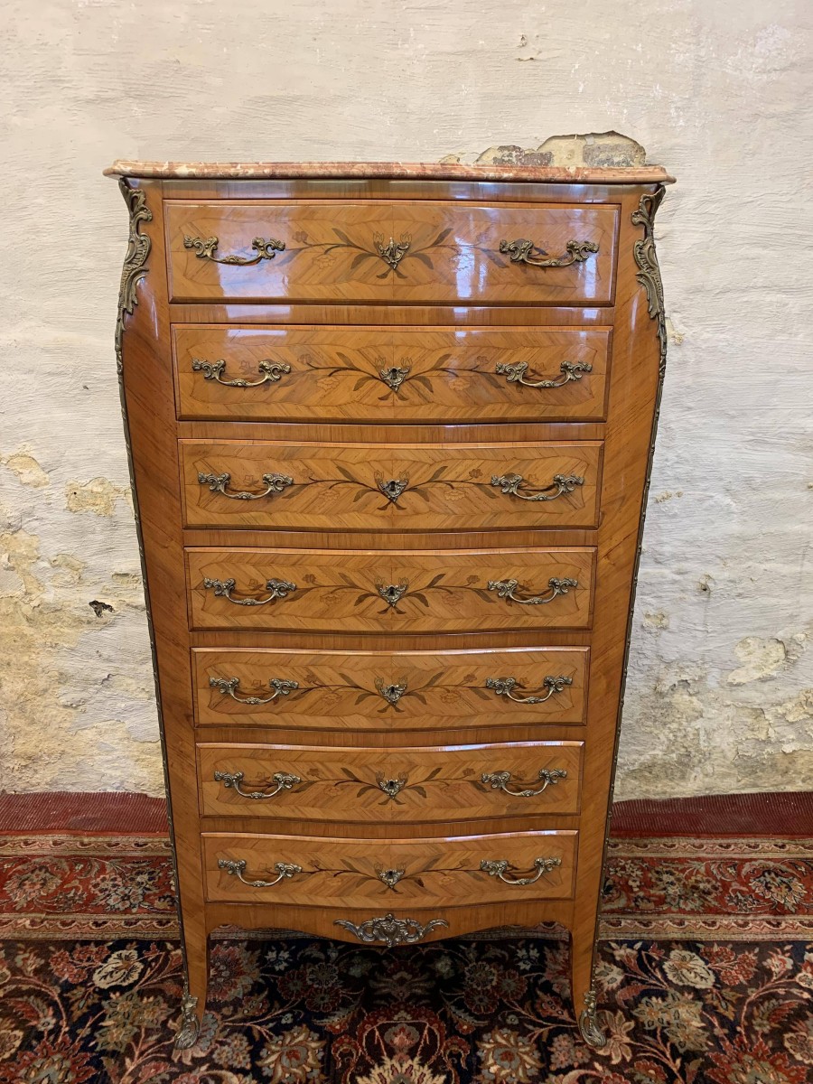 A fine example of French furniture which is in excellent condition. The shaped marble top sits above seven shaped lockable drawers, each drawer having a pair of decorative handles and marquetry inlaid decoration. Either side of the drawers has ormolu decoration with an ormolu plaque at the bottom of the drawers. Beautiful shaped sides, this super chest of drawers stands on four cabriole legs, the front pair of legs having ormolu feet.
