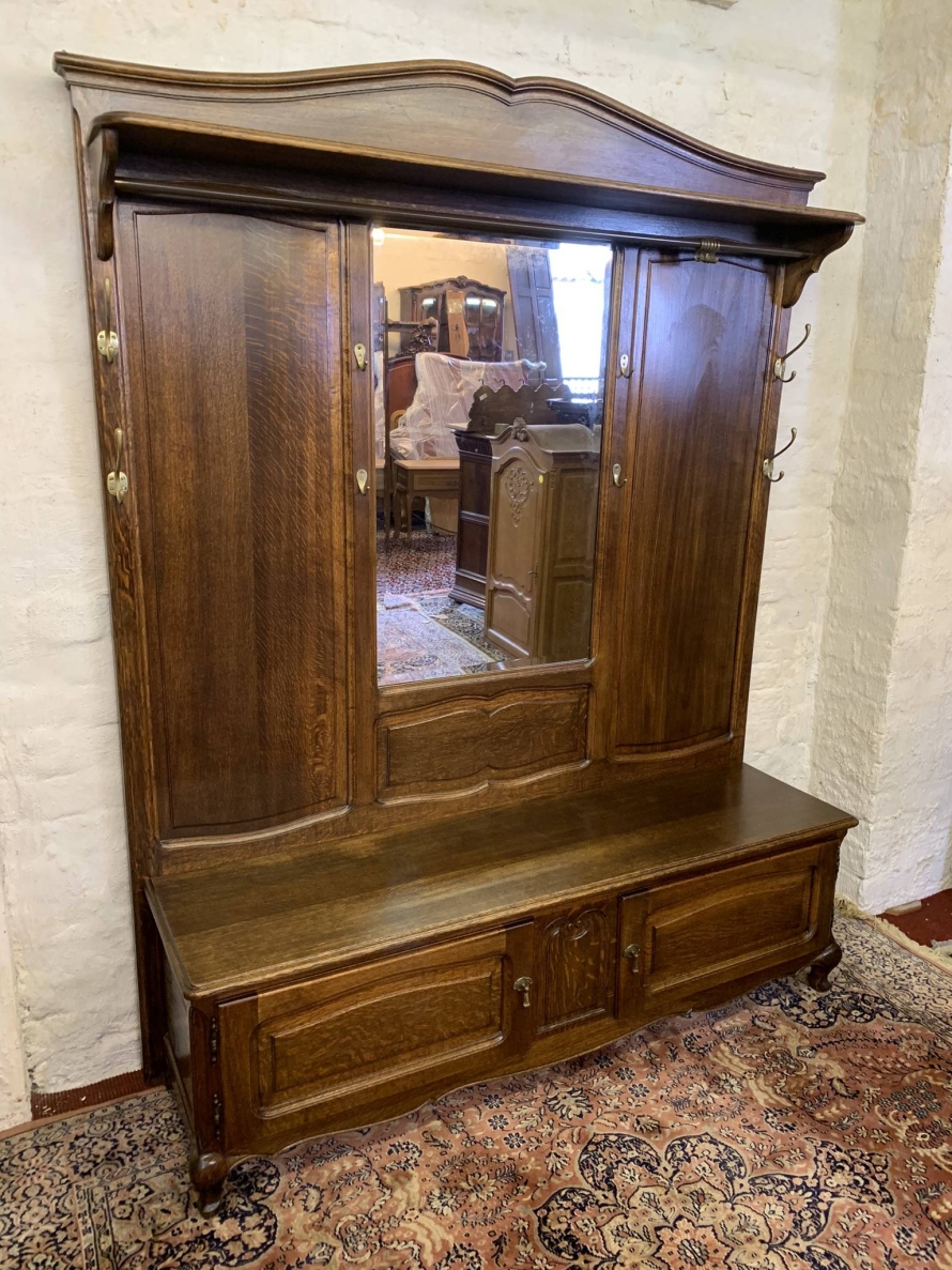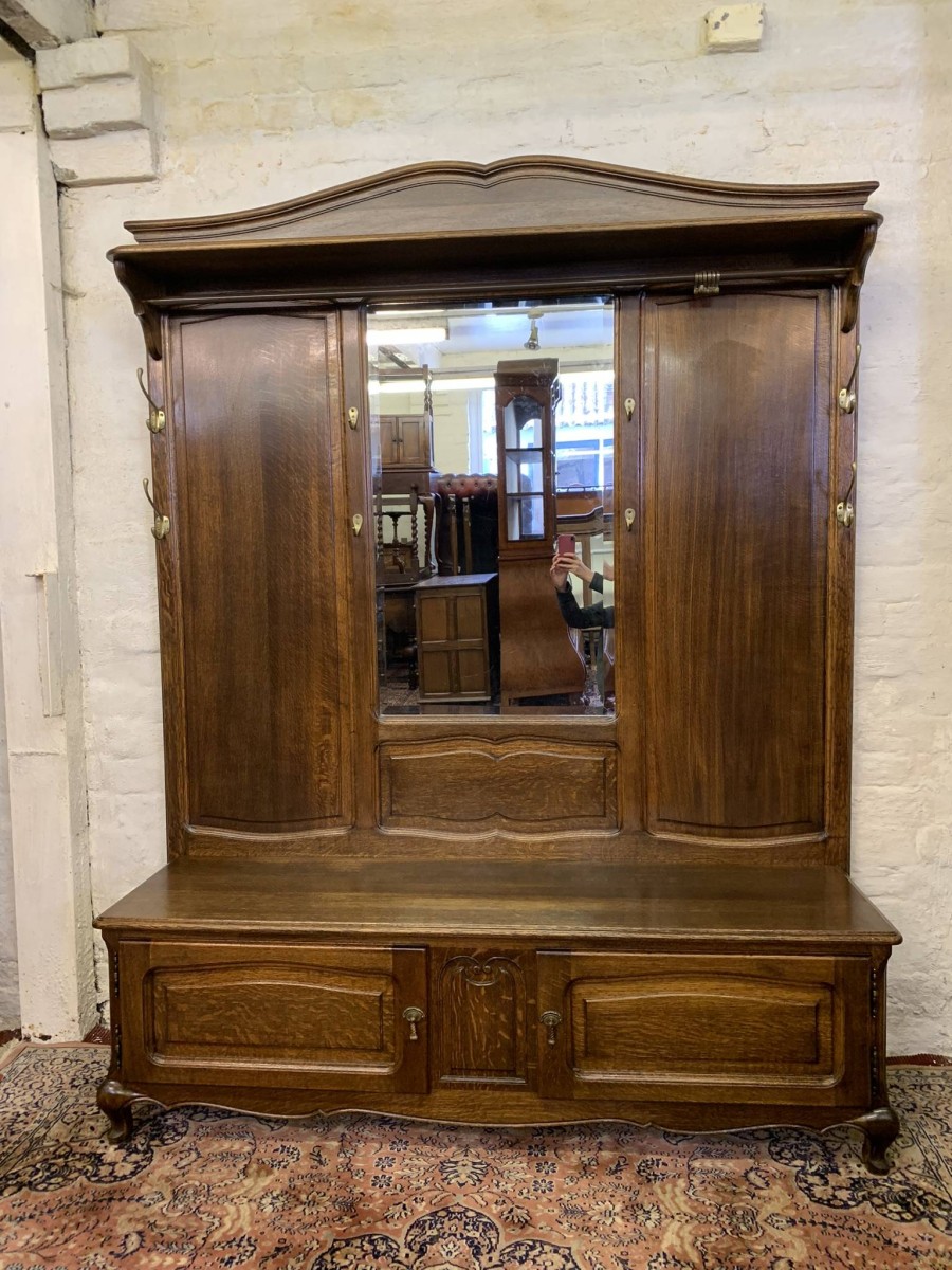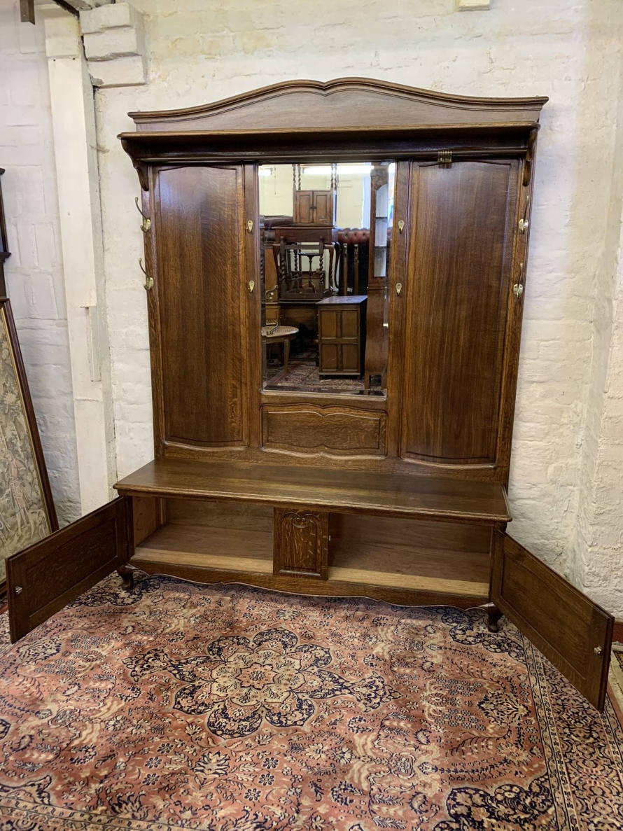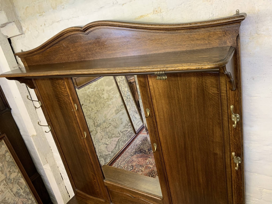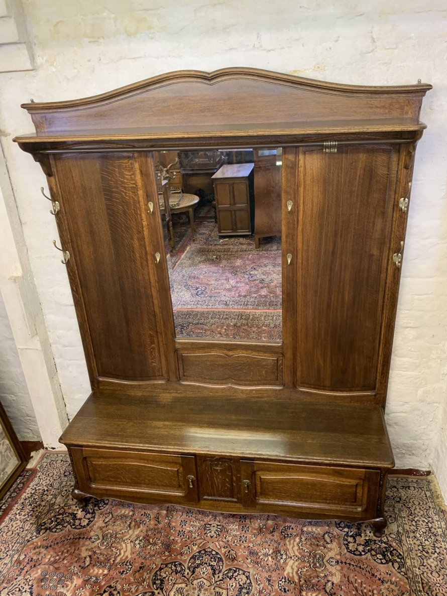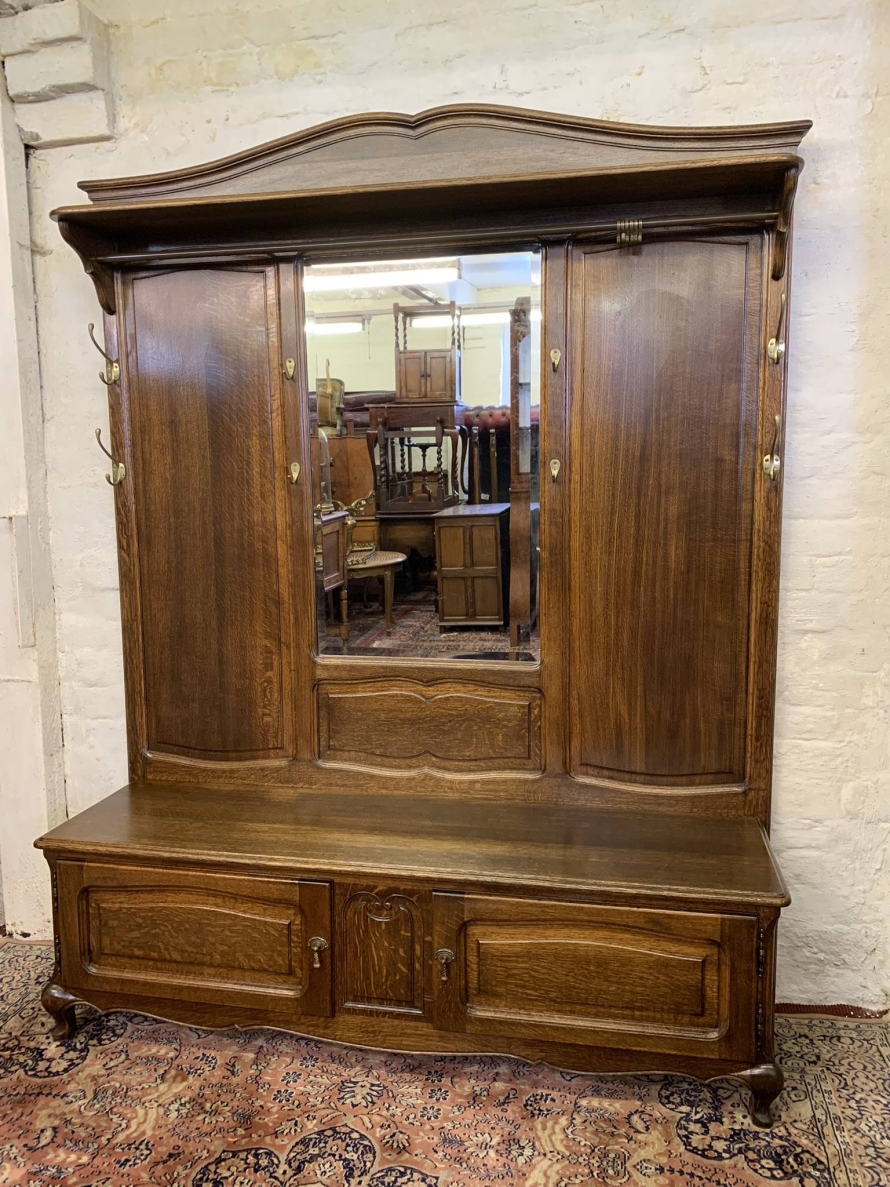 The shaped oversailing top sits above a shelf. Below is a brass rail with six brass coat hooks. Central bevel edged mirror has a shaped recessed panel below, the mirror is flanked by a pair of recessed panels. There are eight brass coat hooks. Below this seat are a pair of shaped recessed panelled doors with a fixed central recessed panel. The doors open to reveal a storage space. Recessed panelled sides, shaped skirt this fabulous hall seat stands on two cabriole shaped legs to the front.