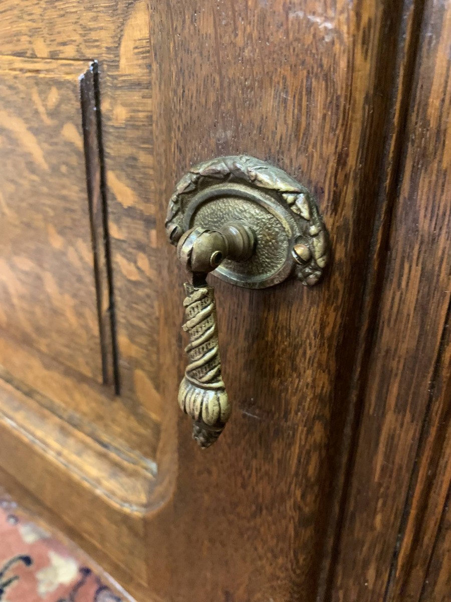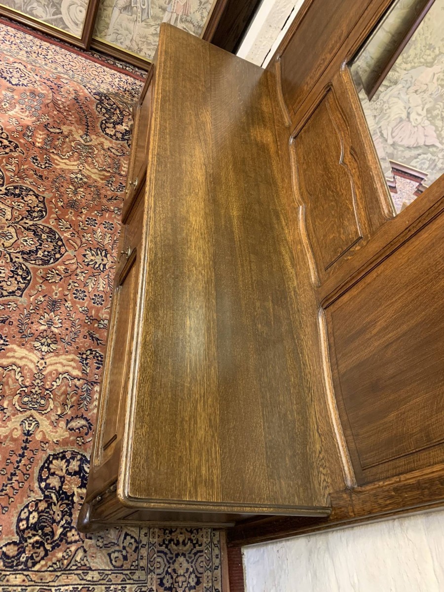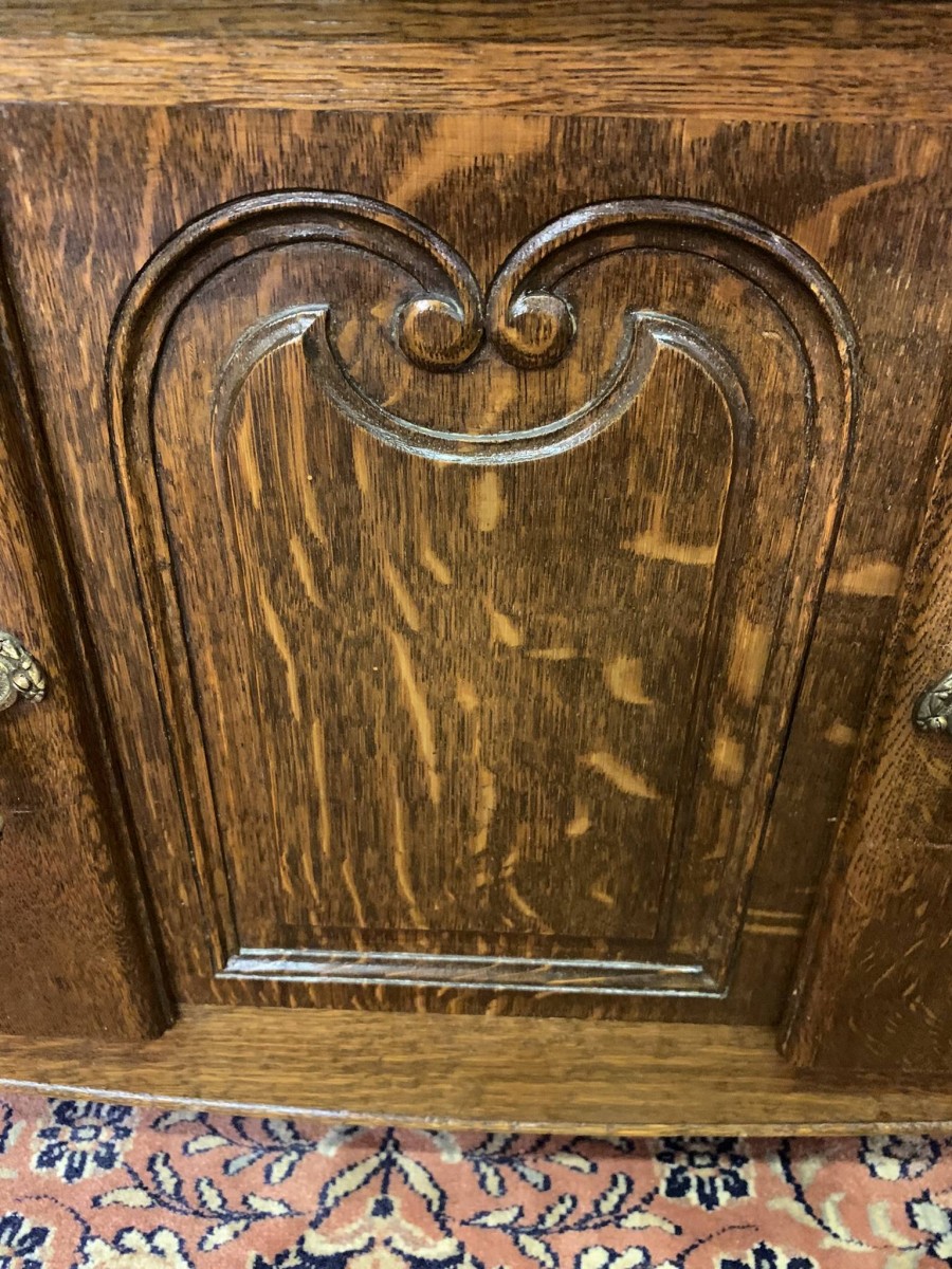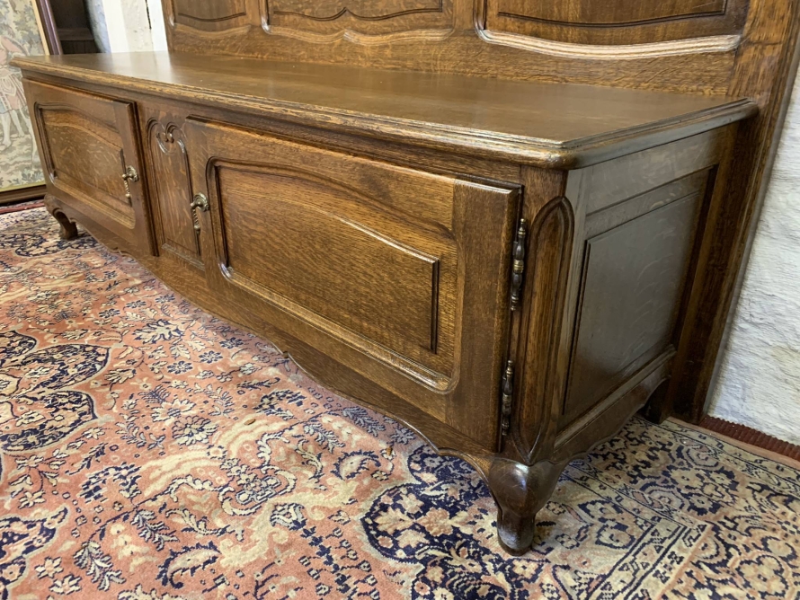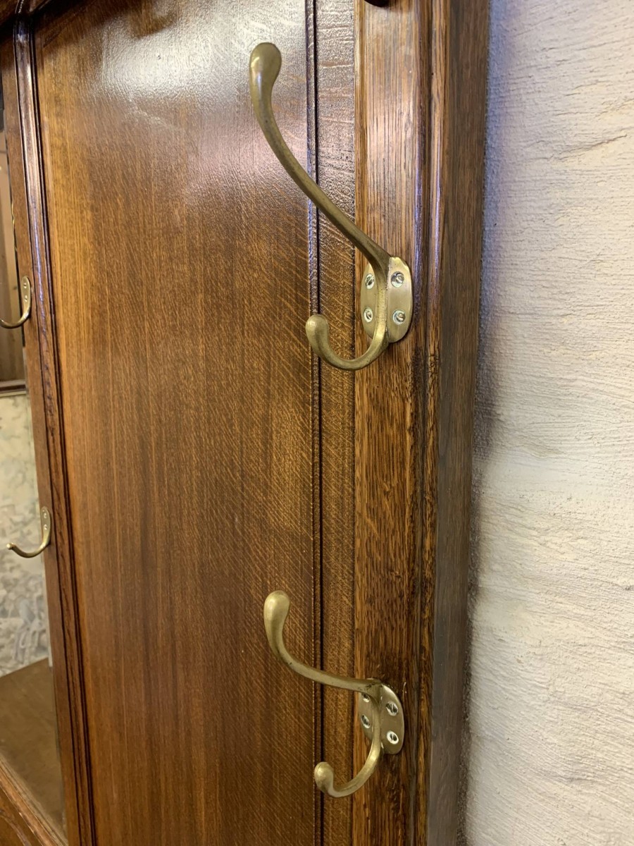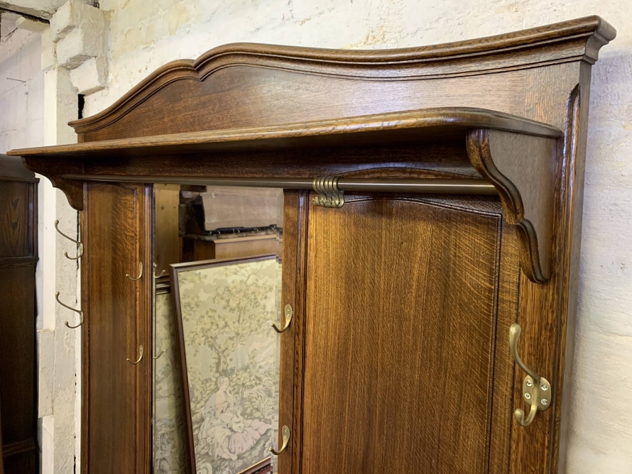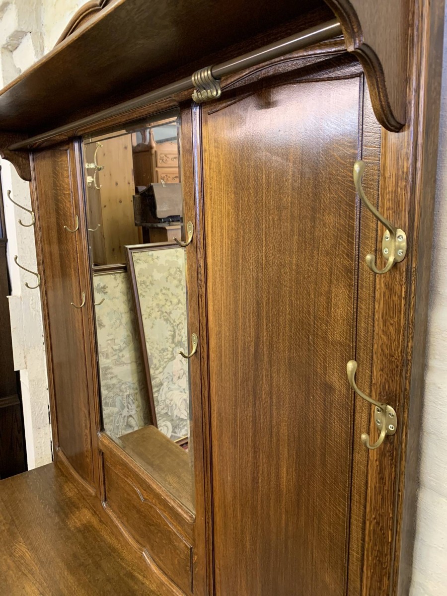The shaped oversailing top sits above a shelf. Below is a brass rail with six brass coat hooks. Central bevel edged mirror has a shaped recessed panel below, the mirror is flanked by a pair of recessed panels. There are eight brass coat hooks. Below this seat are a pair of shaped recessed panelled doors with a fixed central recessed panel. The doors open to reveal a storage space. Recessed panelled sides, shaped skirt this fabulous hall seat stands on two cabriole shaped legs to the front.