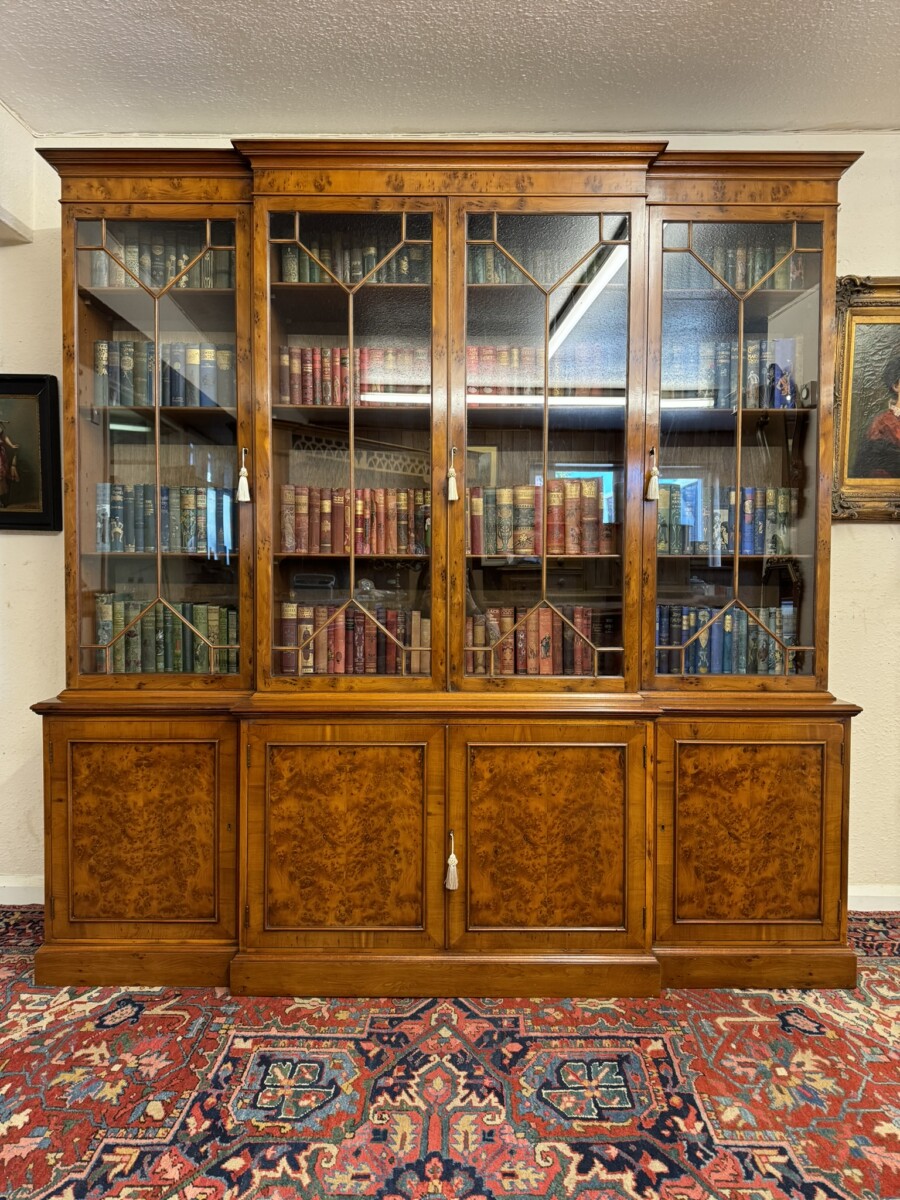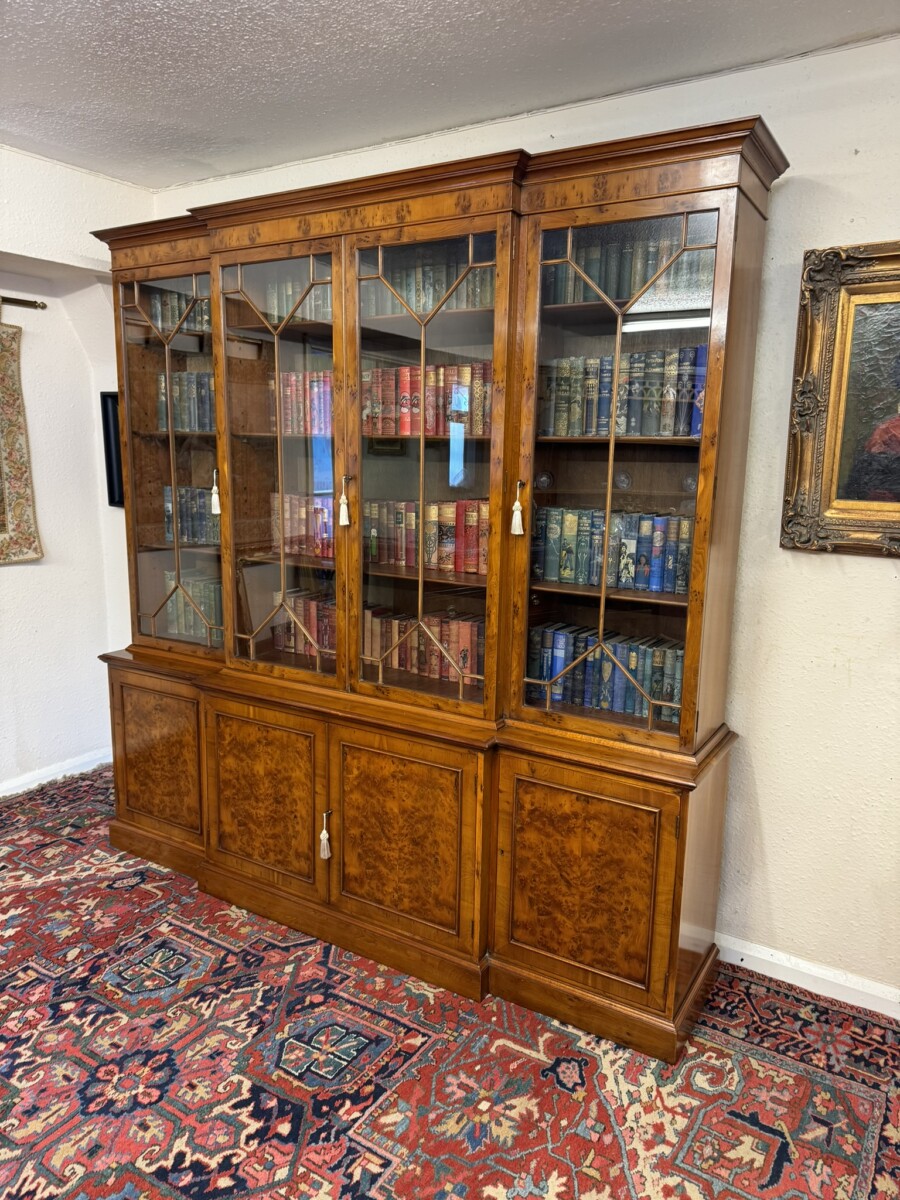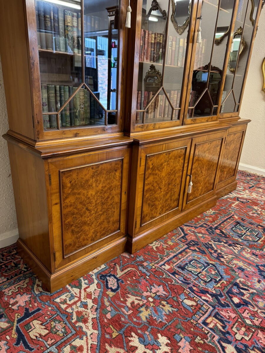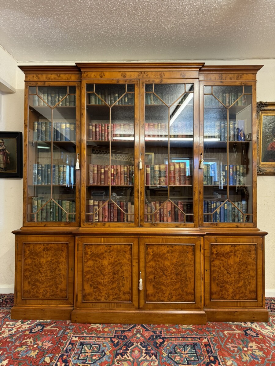 This stunning bookcase is in excellent condition and made bt the renound G.T Rackstaw. The stepped cornice sits above four glazed lockable doors, the pair of central doors are brakefront in design. The doors open to reveal three adjustable and removable shelves, below are four lockable striking recessed panelled cupboard doors, the doors open to reveal a removable shelf. This outstanding quality large bookcase has a platform plinth base.