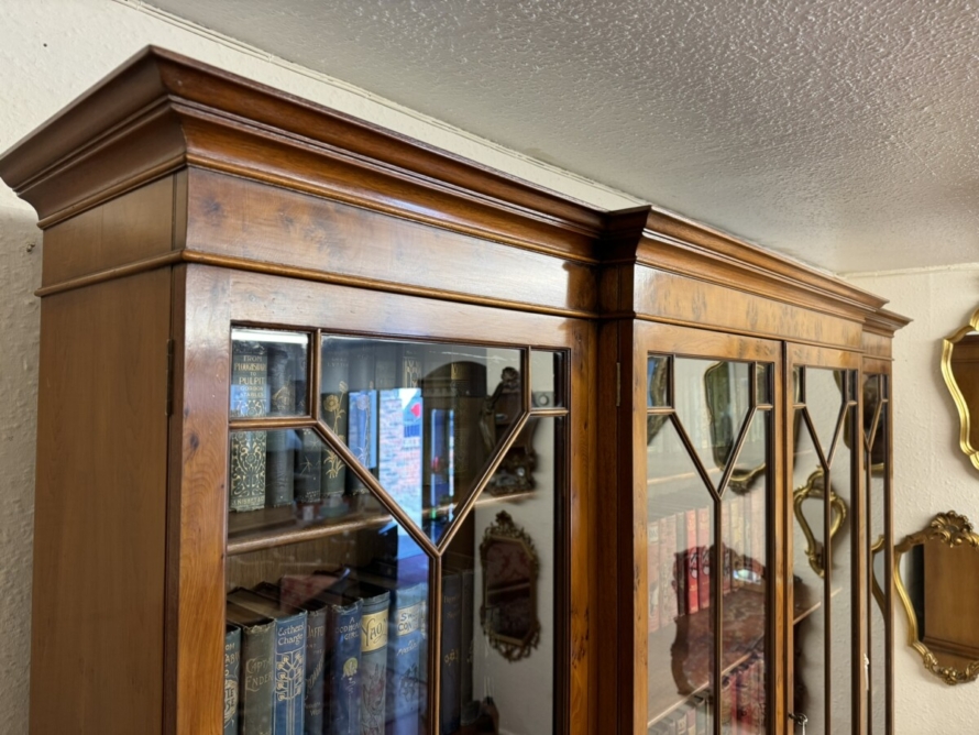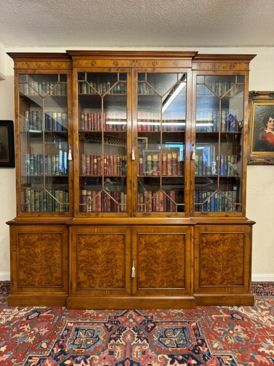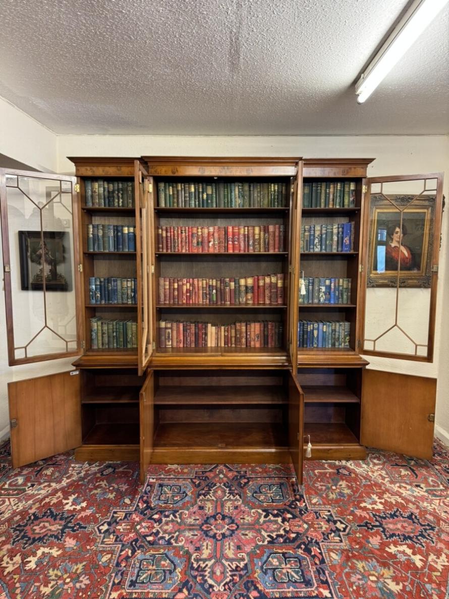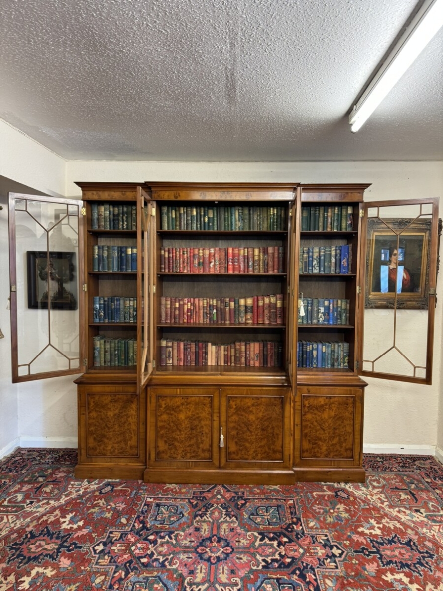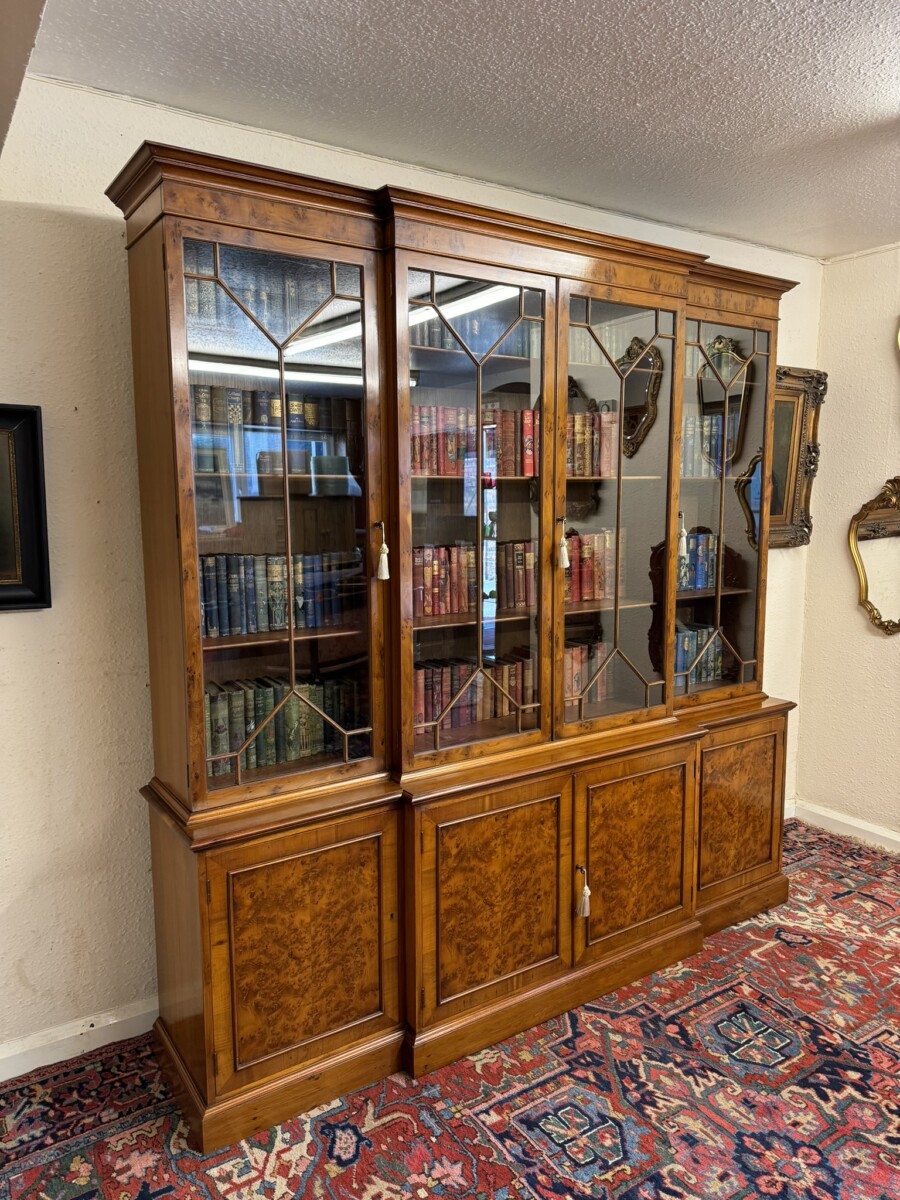 This stunning bookcase is in excellent condition and made bt the renound G.T Rackstaw. The stepped cornice sits above four glazed lockable doors, the pair of central doors are brakefront in design. The doors open to reveal three adjustable and removable shelves, below are four lockable striking recessed panelled cupboard doors, the doors open to reveal a removable shelf. This outstanding quality large bookcase has a platform plinth base.