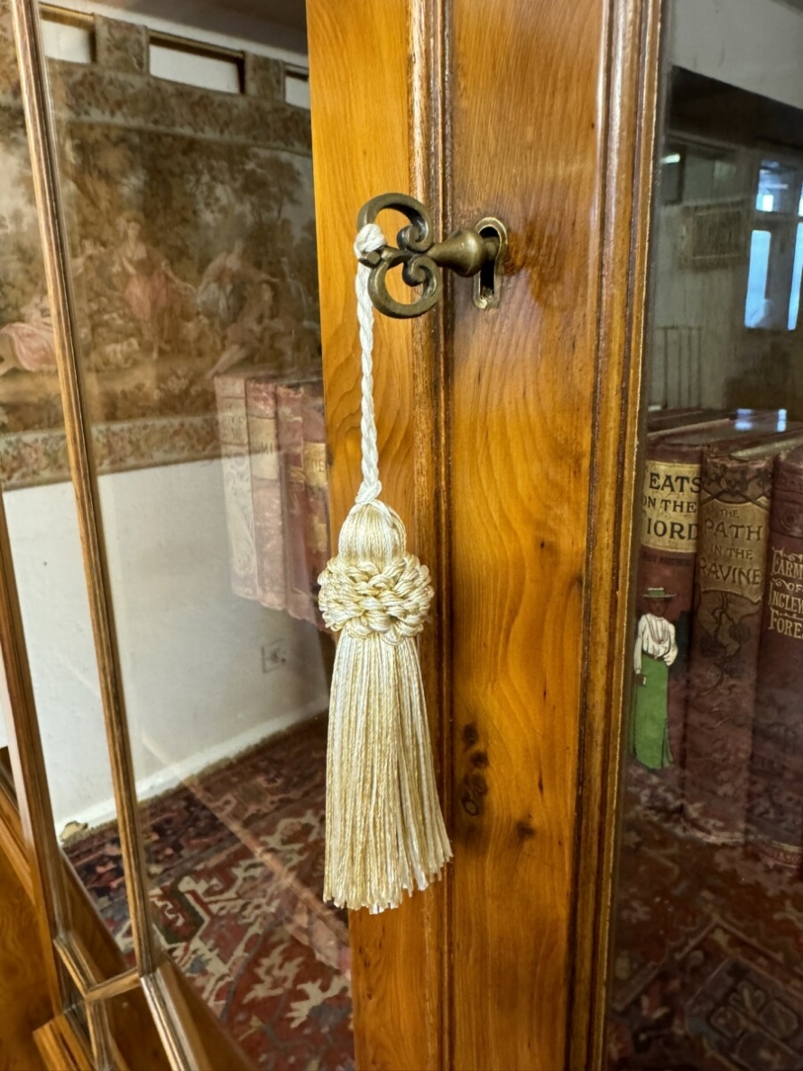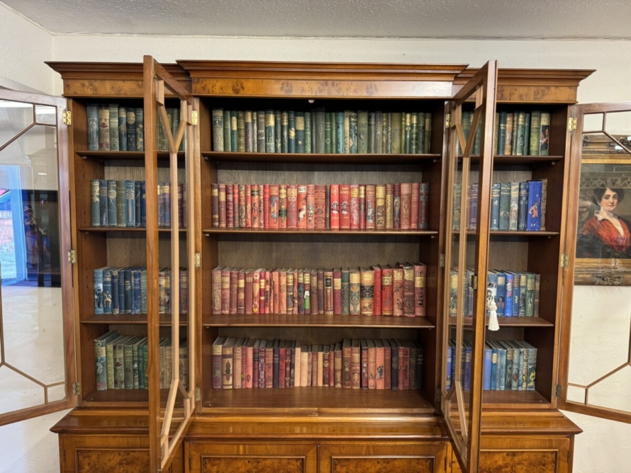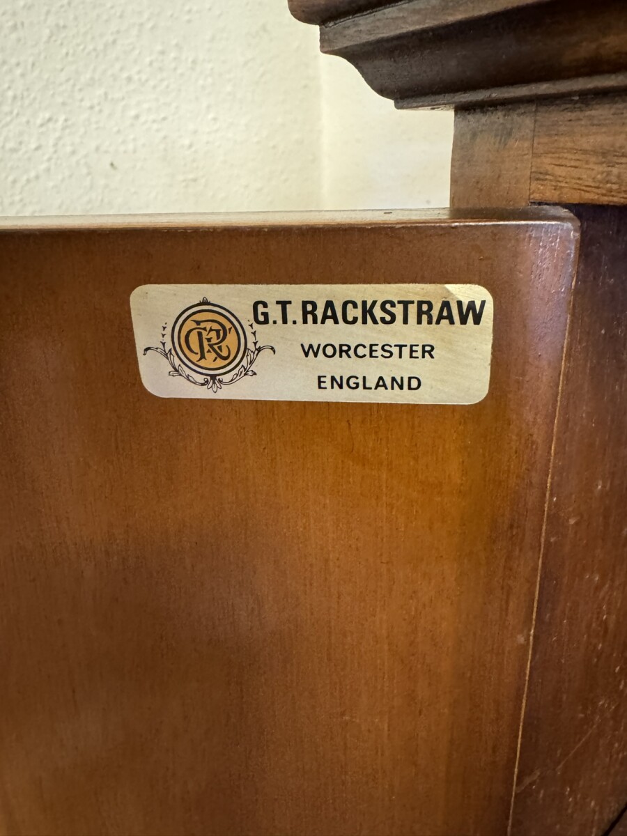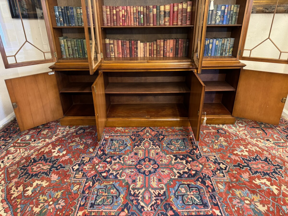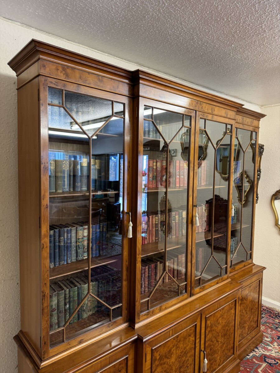 This stunning bookcase is in excellent condition and made bt the renound G.T Rackstaw. The stepped cornice sits above four glazed lockable doors, the pair of central doors are brakefront in design. The doors open to reveal three adjustable and removable shelves, below are four lockable striking recessed panelled cupboard doors, the doors open to reveal a removable shelf. This outstanding quality large bookcase has a platform plinth base.