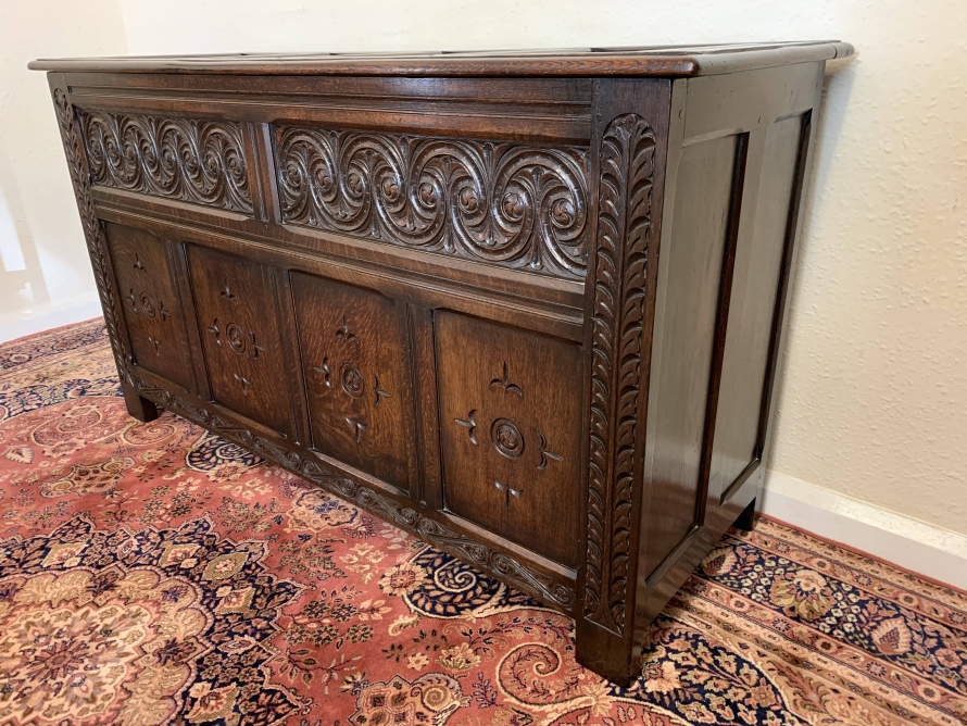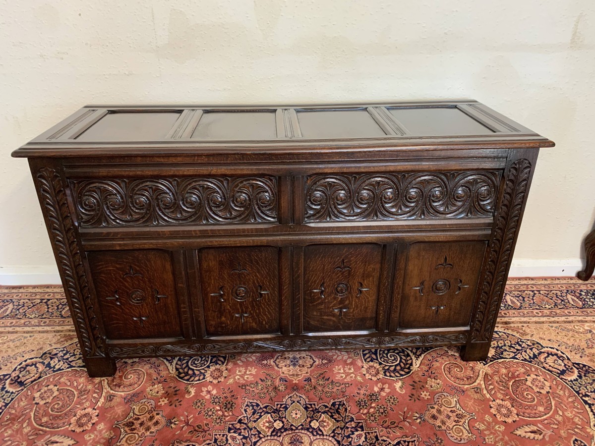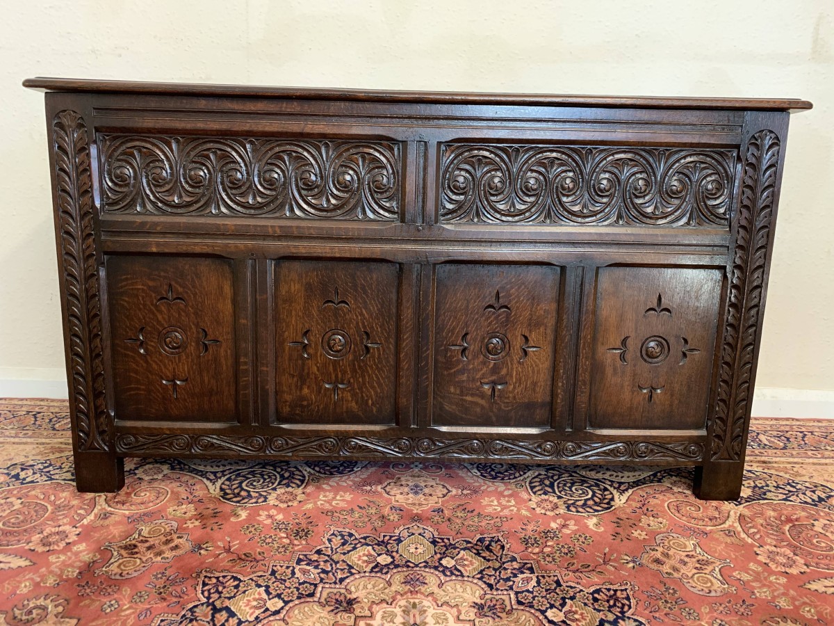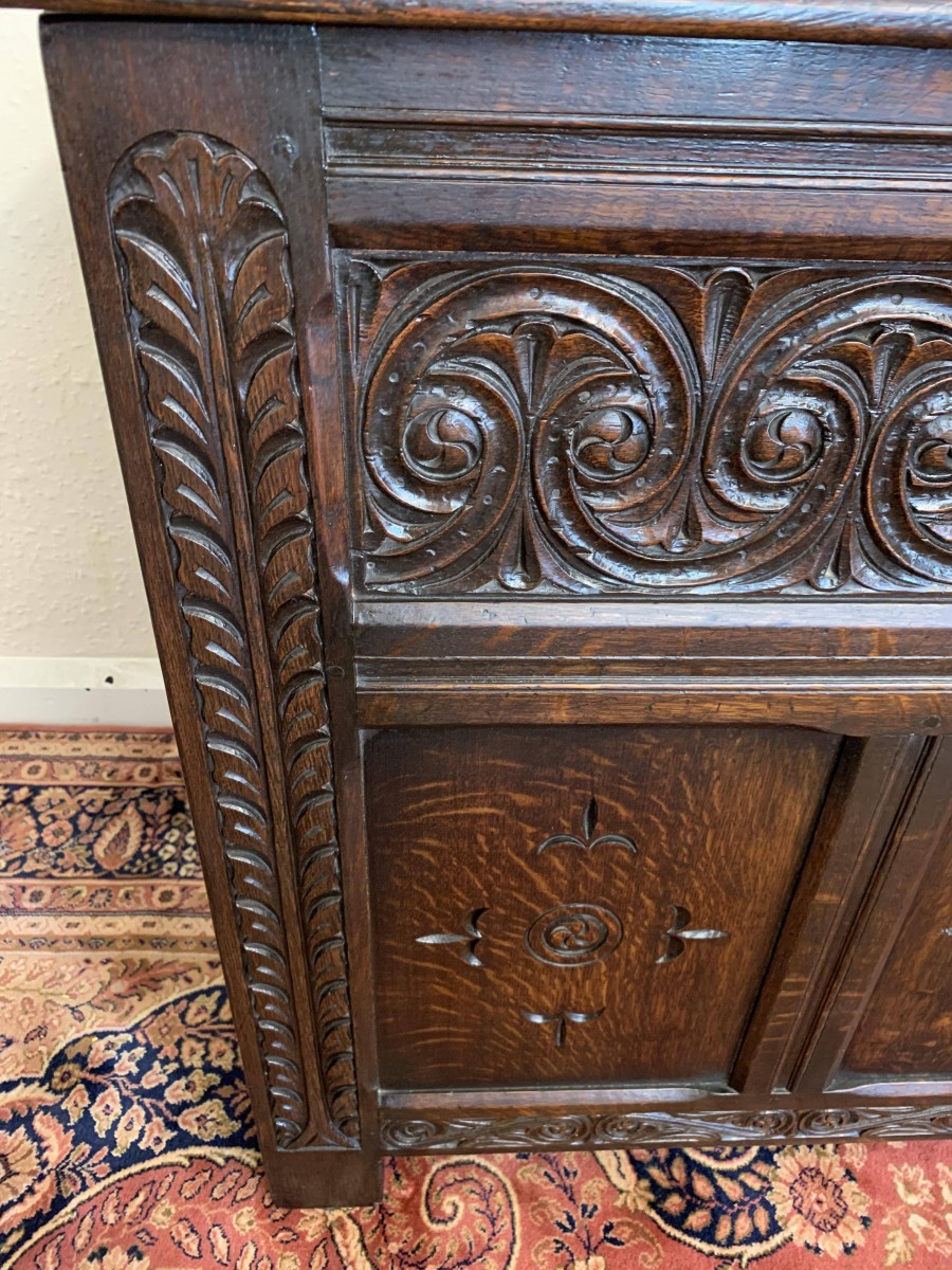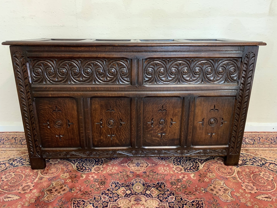 The lift up lid has four panels. Below are two highly decorative carved panels which in turn sit above for recessed carved panels. Carved side and skirt, recessed panelled sides, this great item stands on four block feet. Please note this antique chest is made entirely from solid oak.