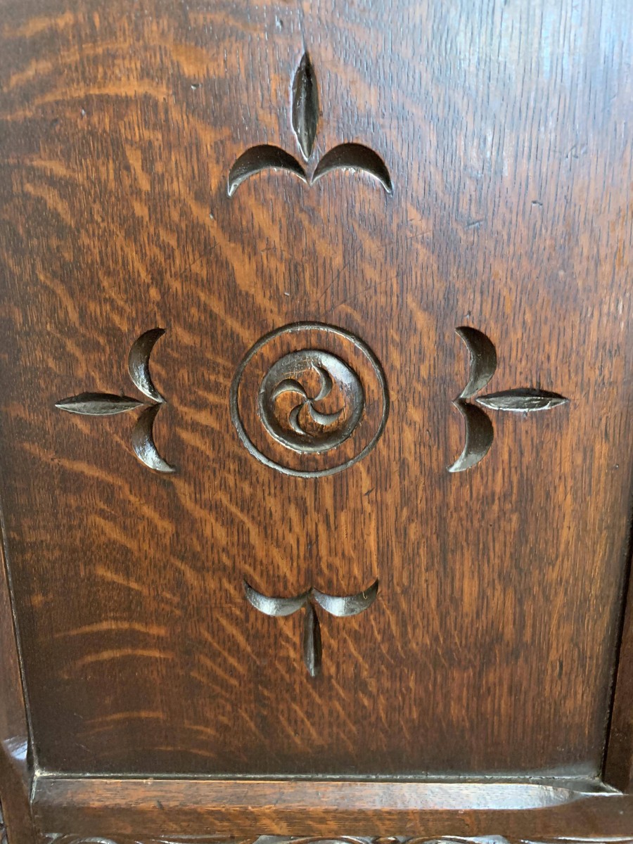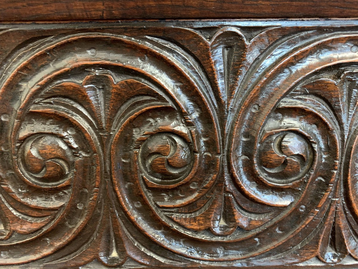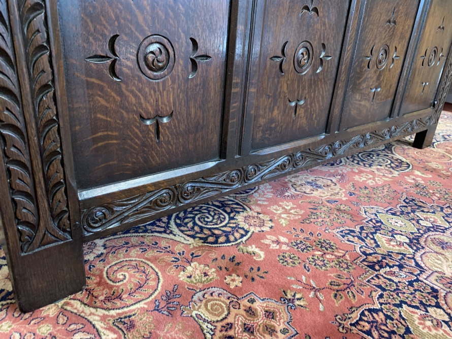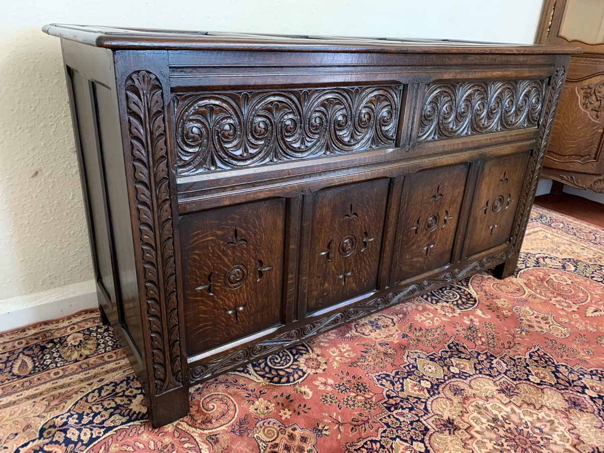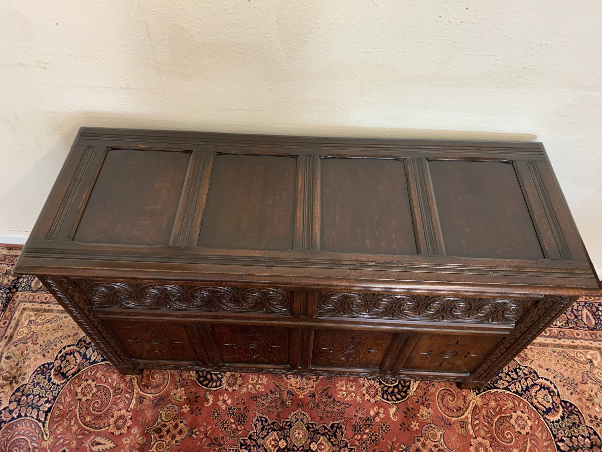 The lift up lid has four panels. Below are two highly decorative carved panels which in turn sit above for recessed carved panels. Carved side and skirt, recessed panelled sides, this great item stands on four block feet. Please note this antique chest is made entirely from solid oak.