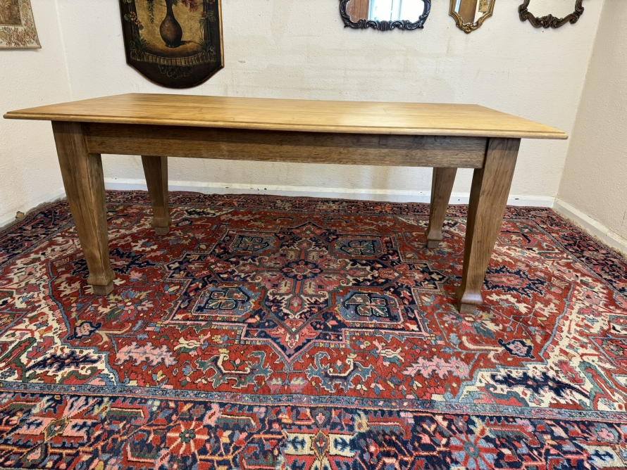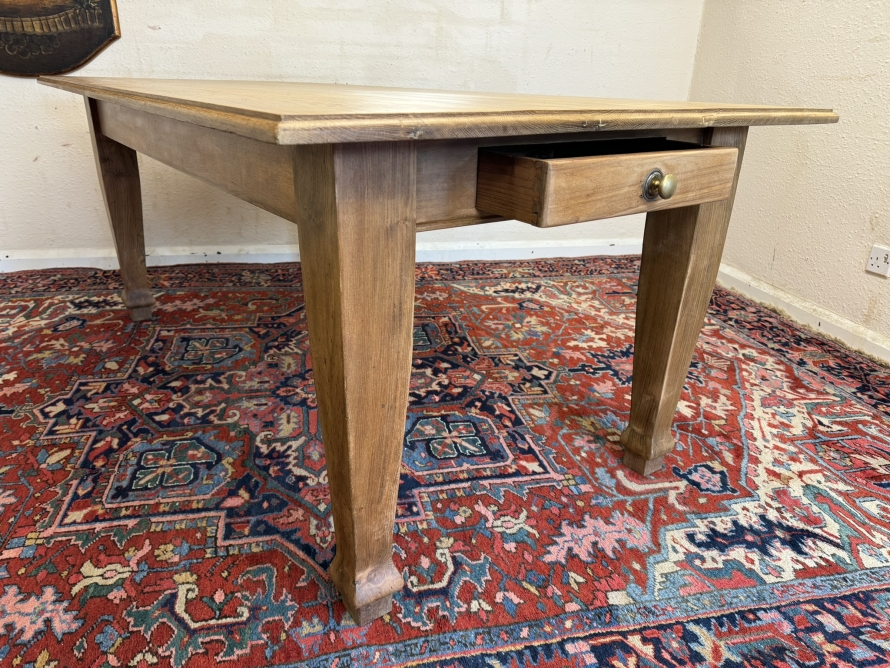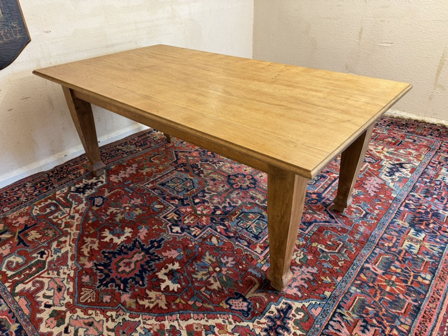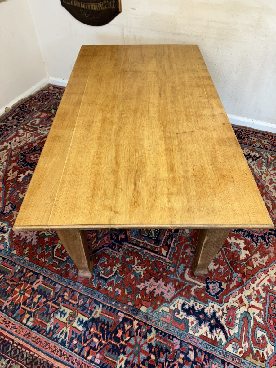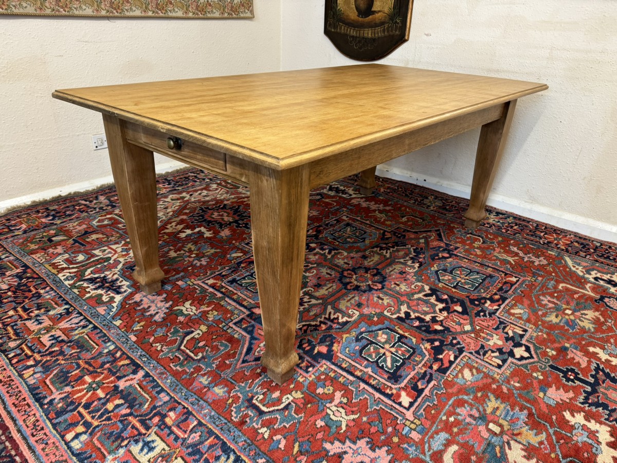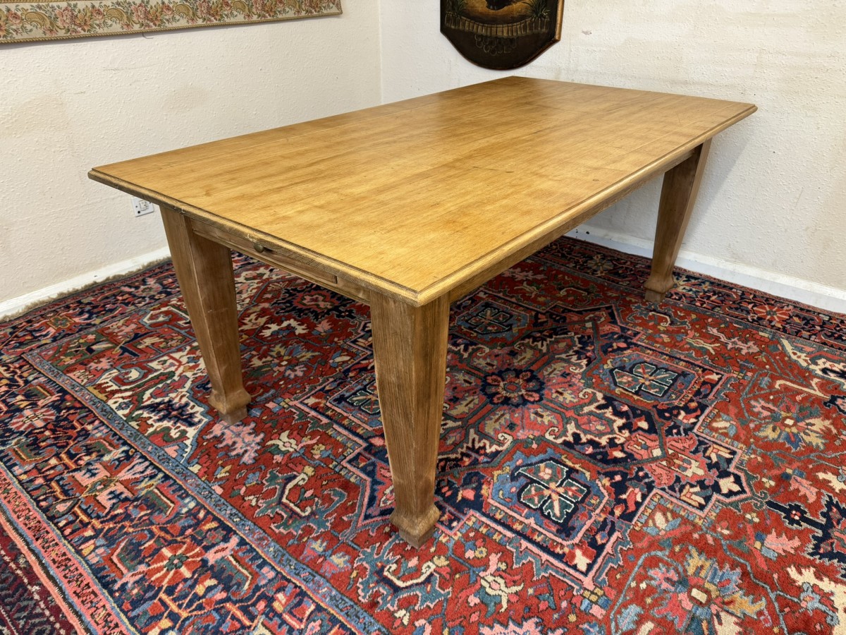 This fabulous table dates circa 1930. The large table has a drawer to one end and stands on four tapered block legs with block feet. Years of use have given the table top a fab look.