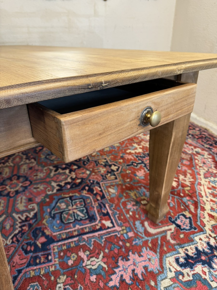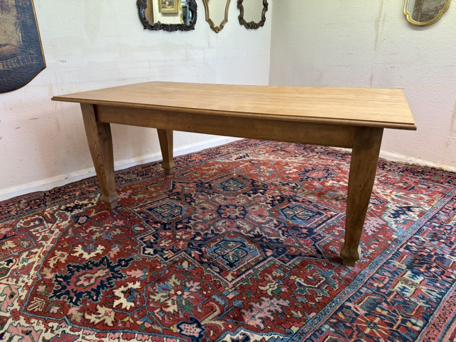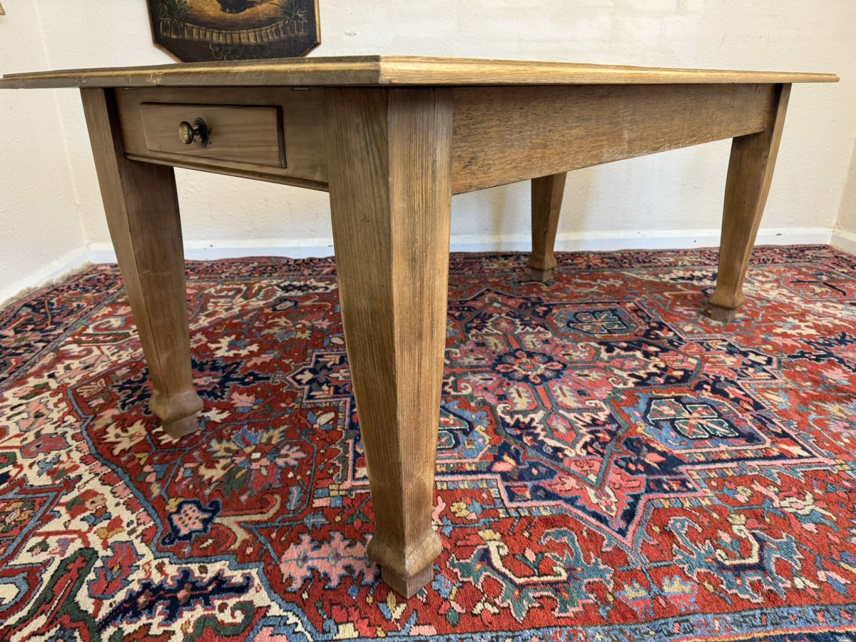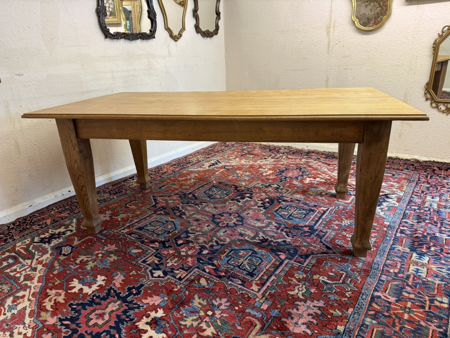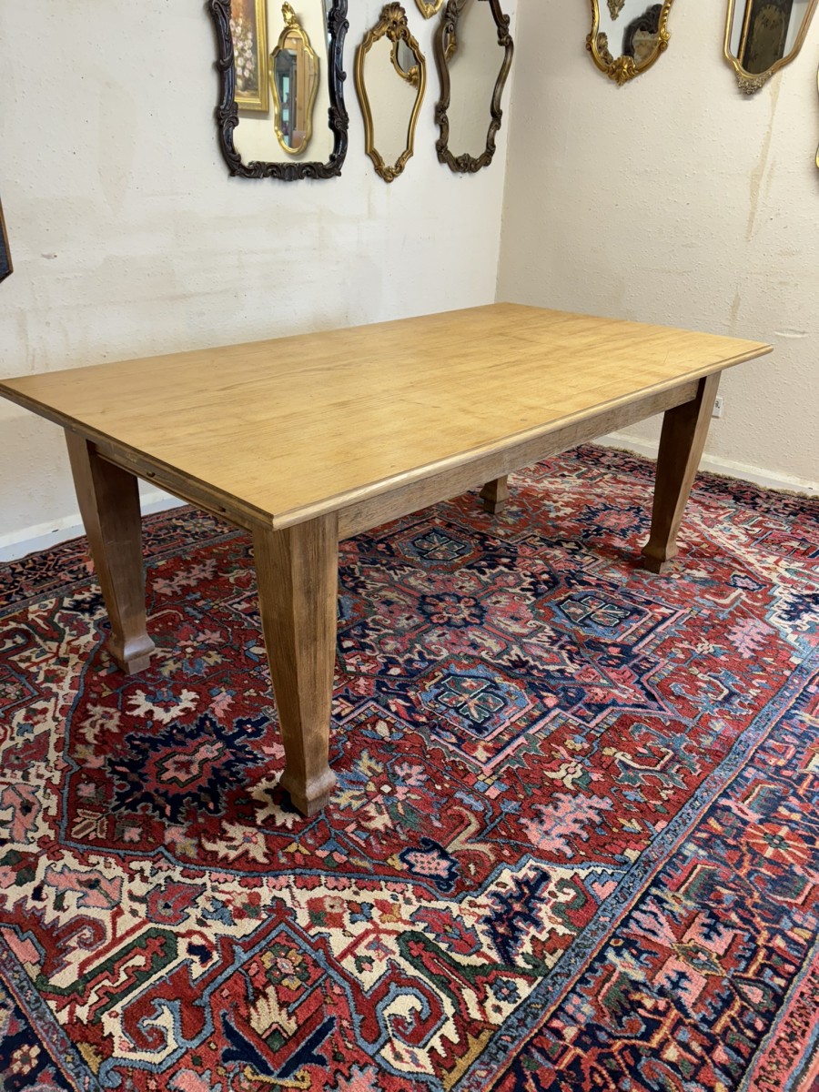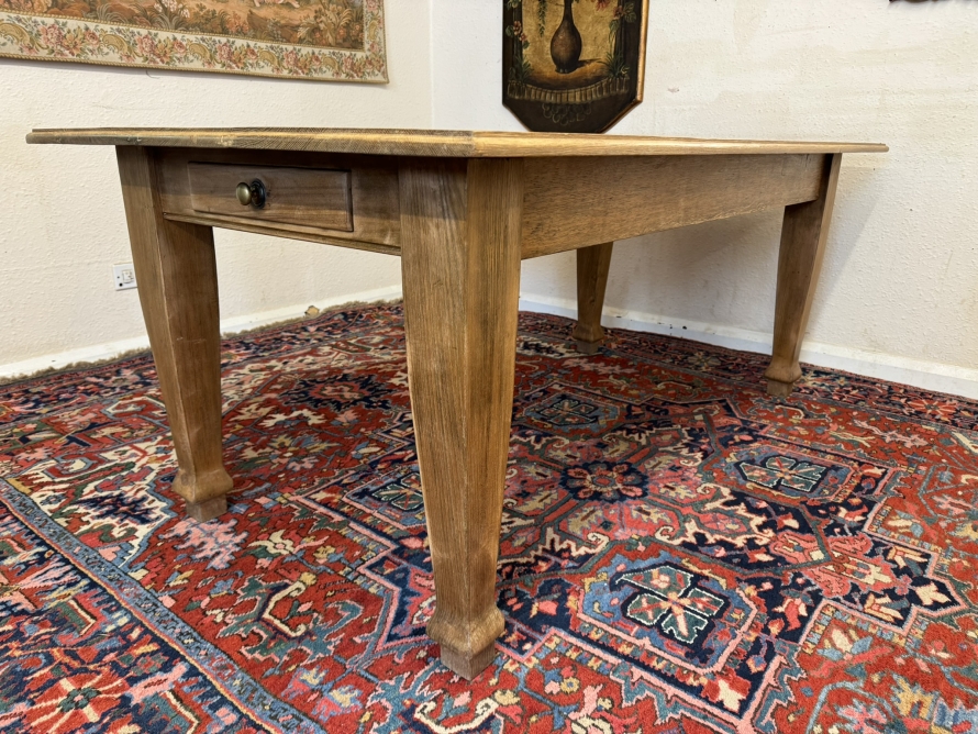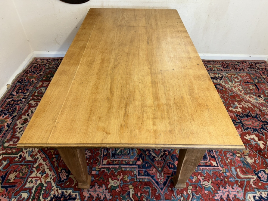 This fabulous table dates circa 1930. The large table has a drawer to one end and stands on four tapered block legs with block feet. Years of use have given the table top a fab look.
