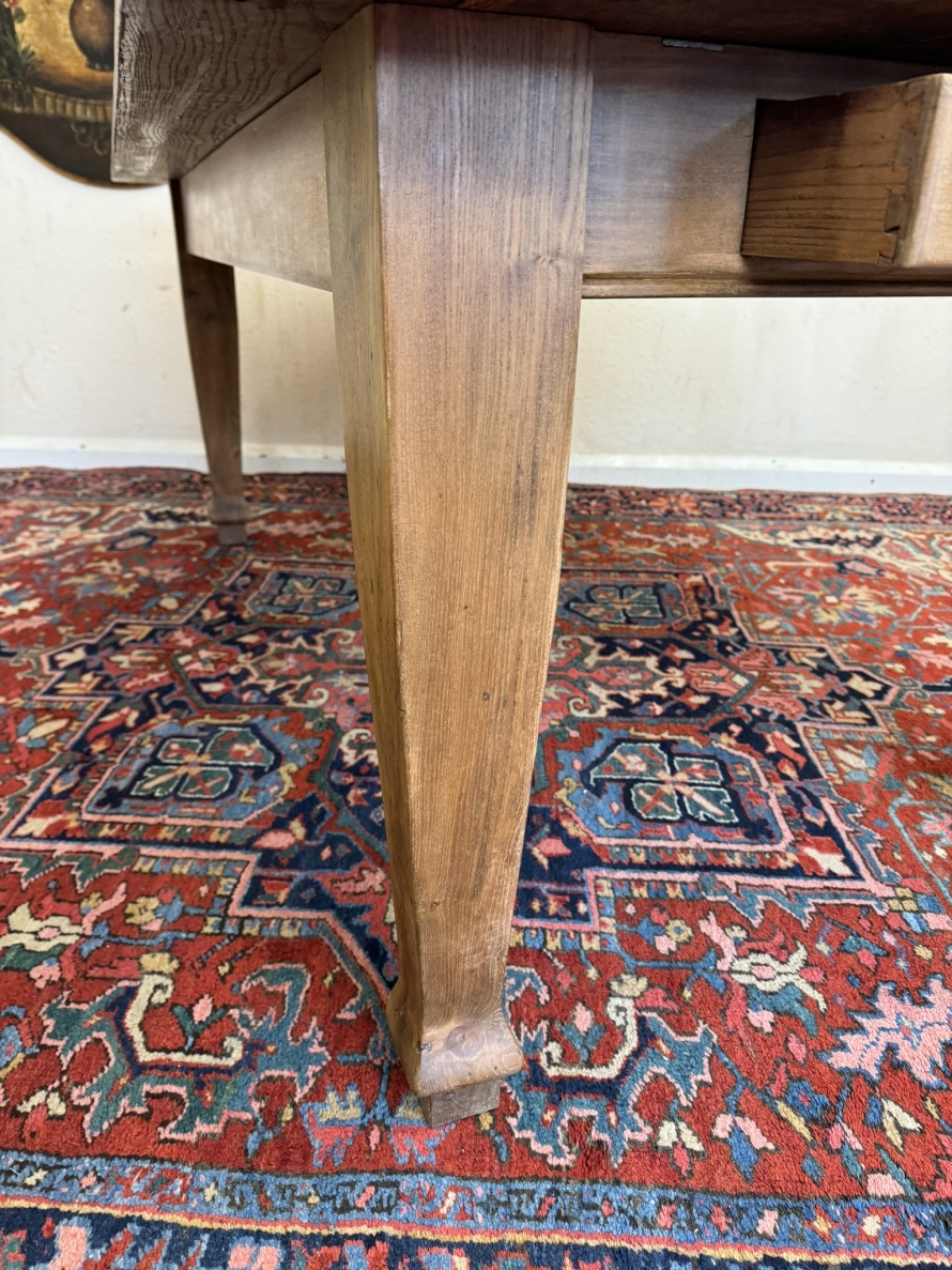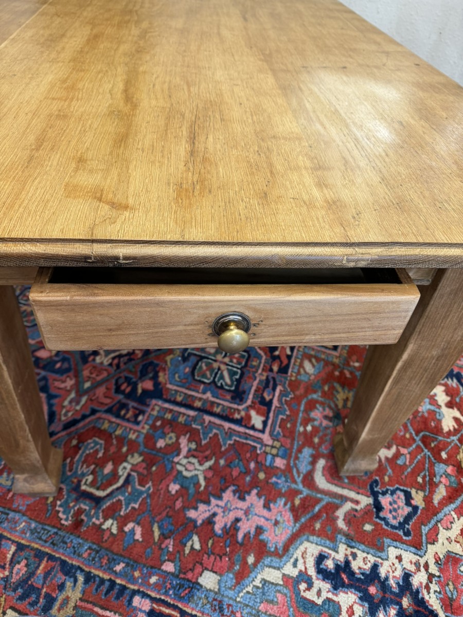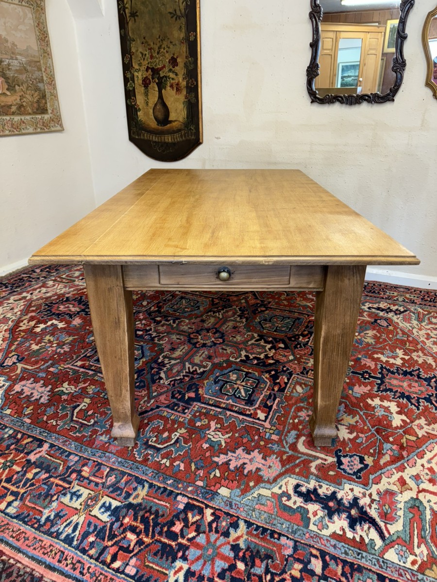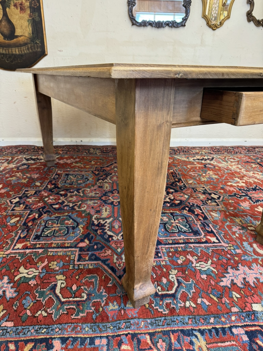 This fabulous table dates circa 1930. The large table has a drawer to one end and stands on four tapered block legs with block feet. Years of use have given the table top a fab look.