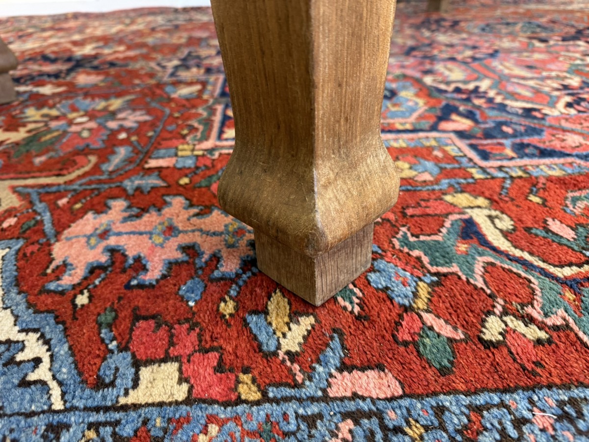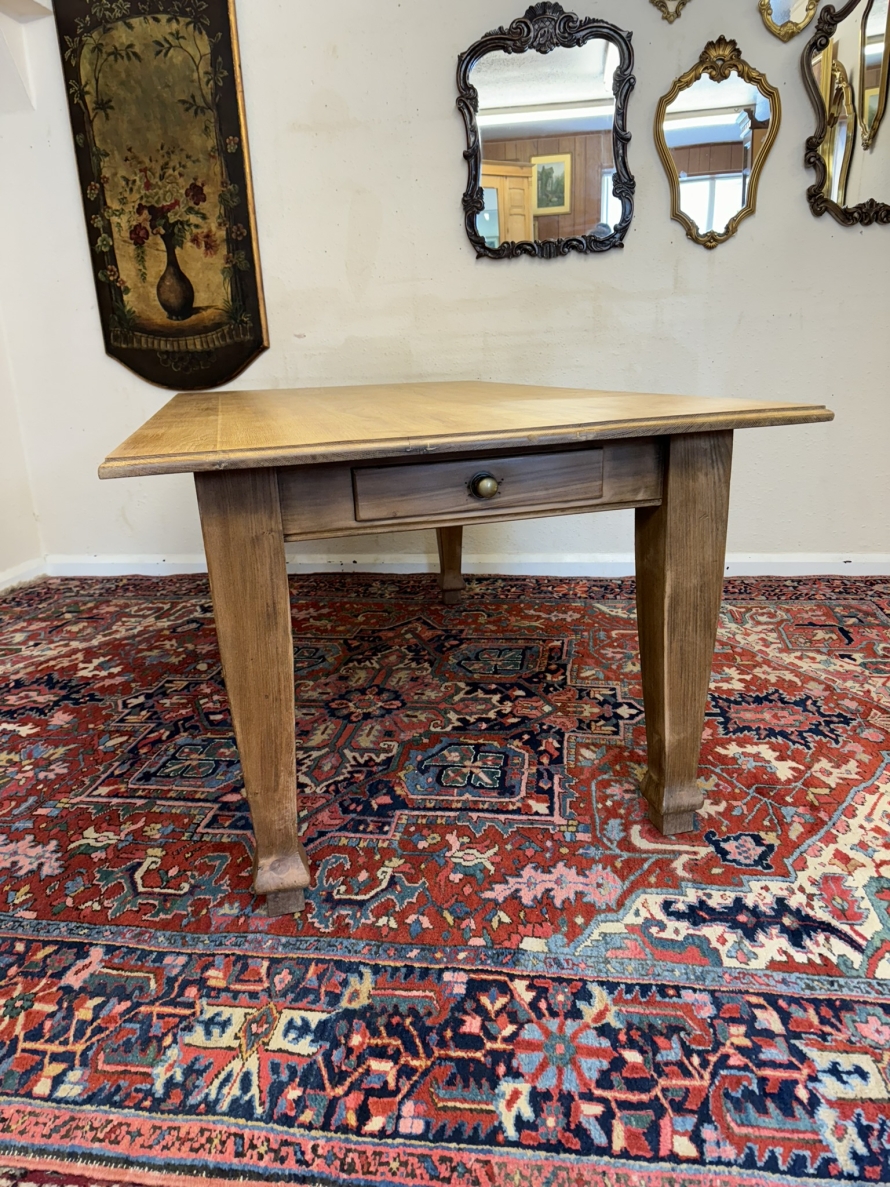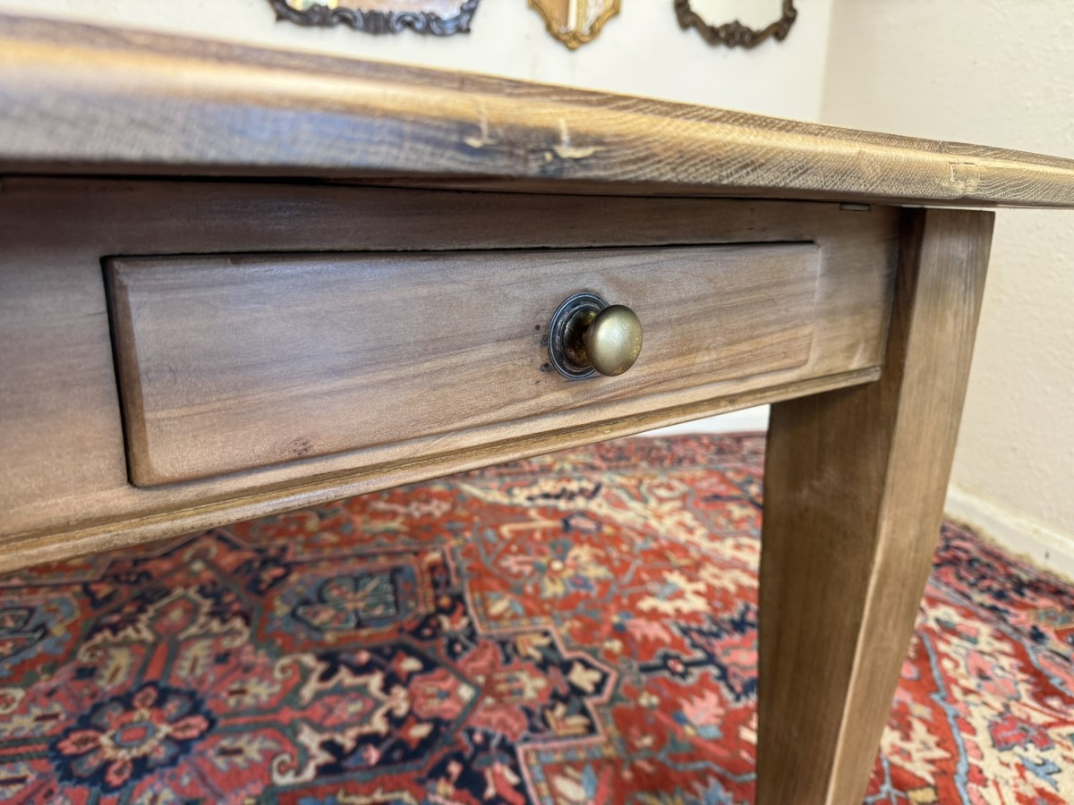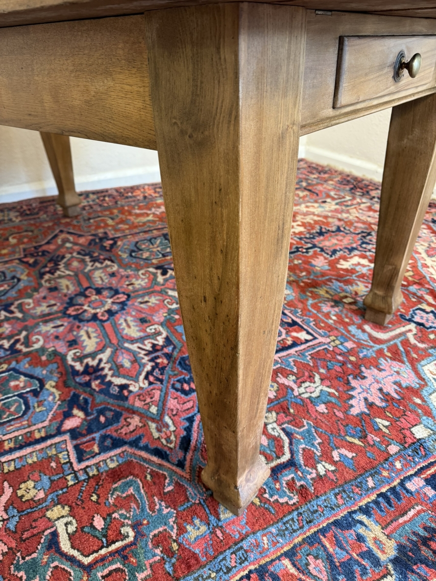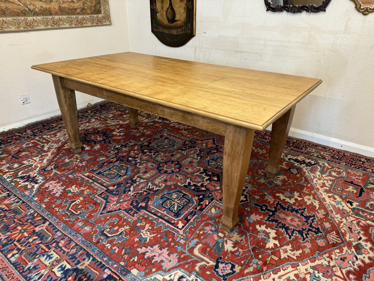This fabulous table dates circa 1930. The large table has a drawer to one end and stands on four tapered block legs with block feet. Years of use have given the table top a fab look.