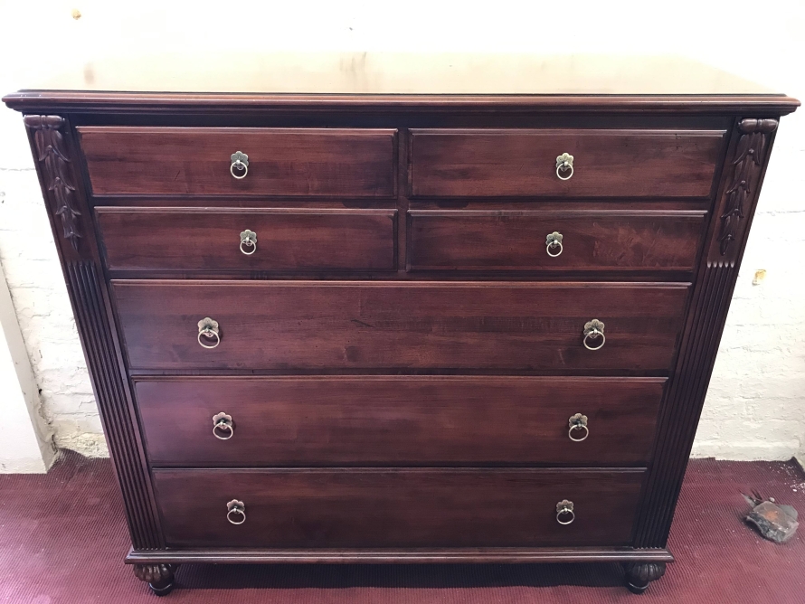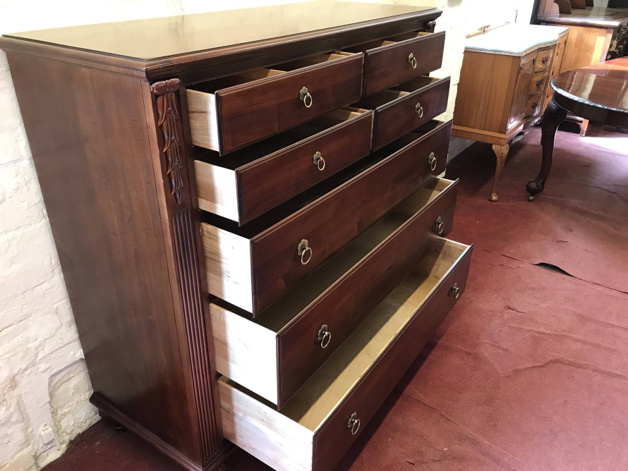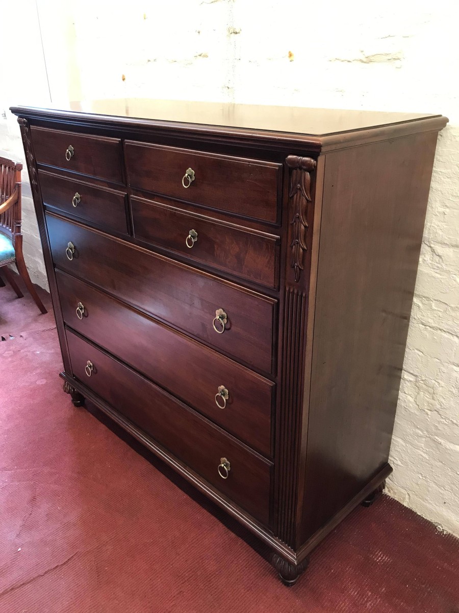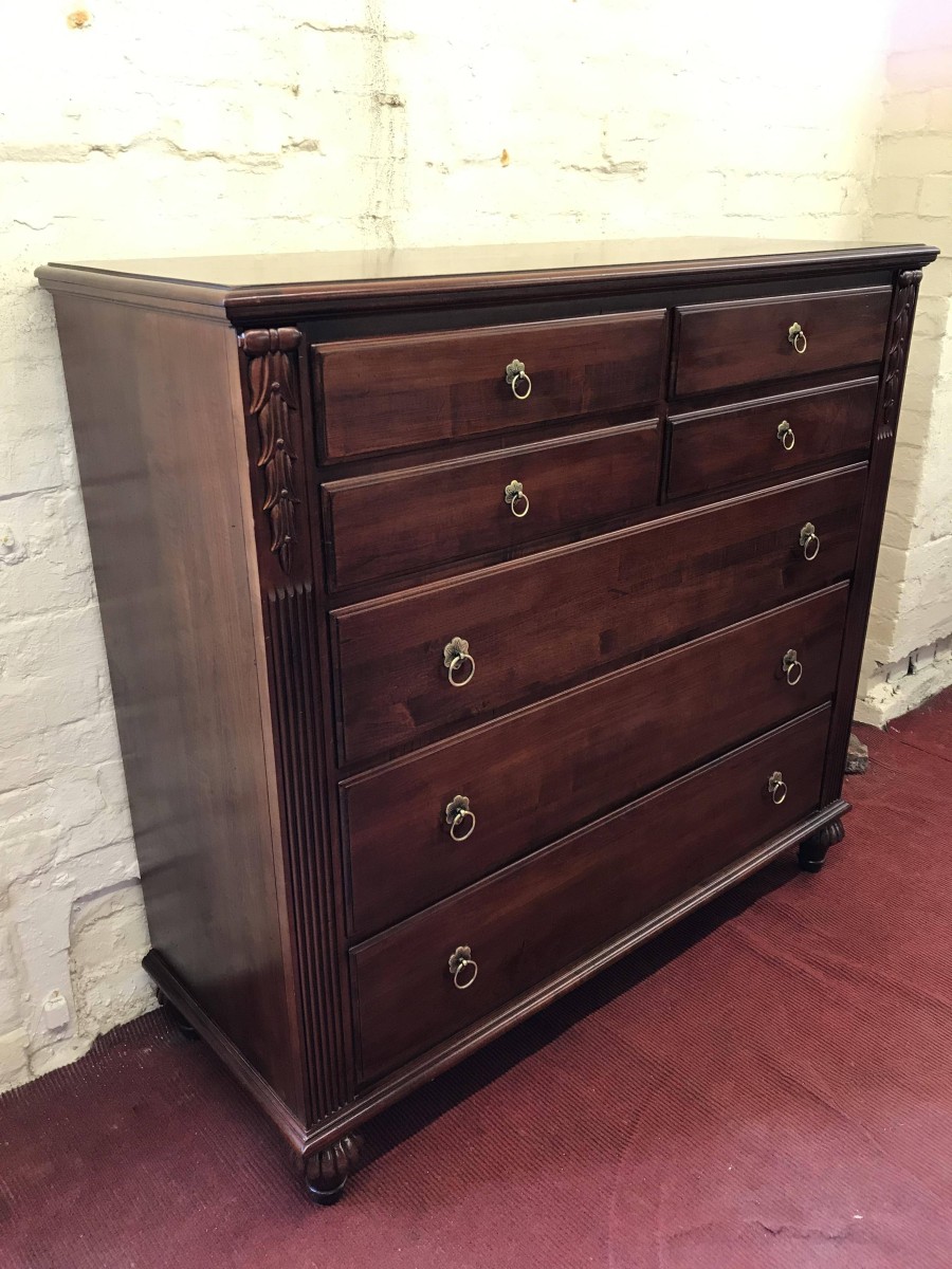 We are delighted to offer this super stylish functional item of furniture. The over sailing top sits above four short draws, each drawer having ring handle. Below these four small drawers are three long drawers, each drawer having a pair of brass ring handles, decorative carvings to the sides this stylish item sits on carved bun feet.