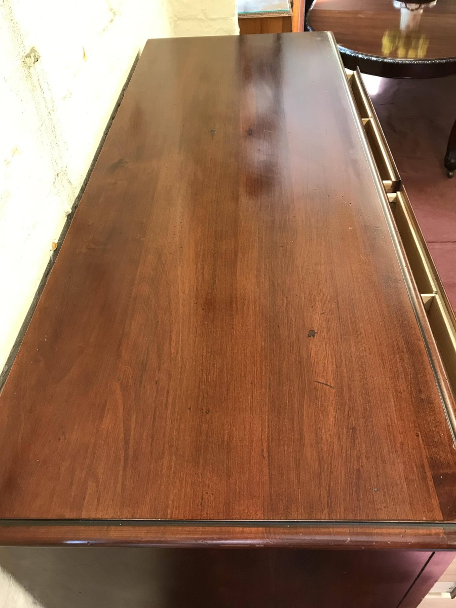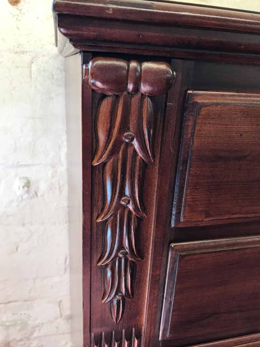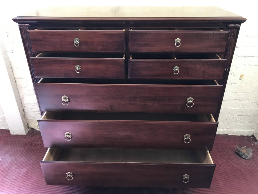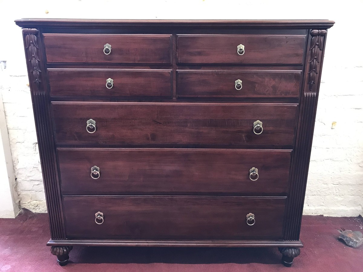 We are delighted to offer this super stylish functional item of furniture. The over sailing top sits above four short draws, each drawer having ring handle. Below these four small drawers are three long drawers, each drawer having a pair of brass ring handles, decorative carvings to the sides this stylish item sits on carved bun feet.