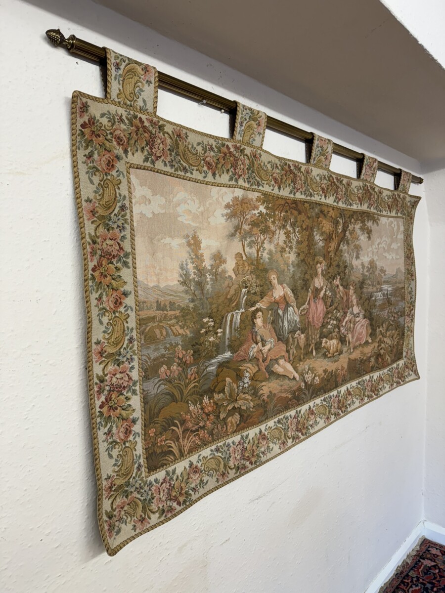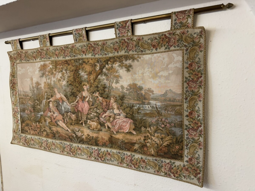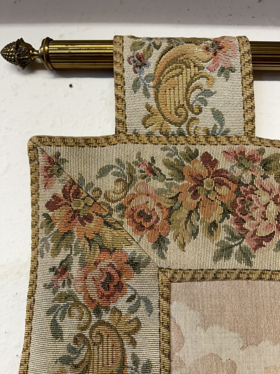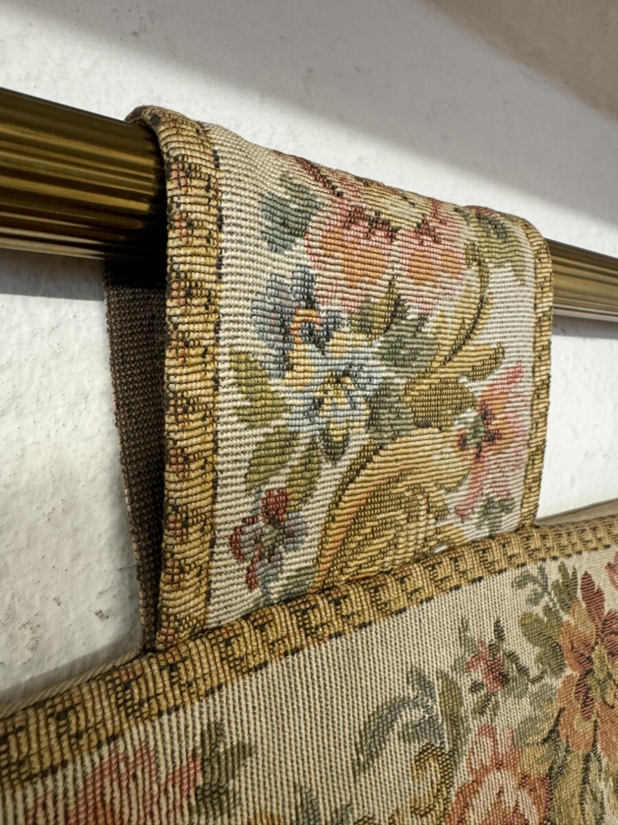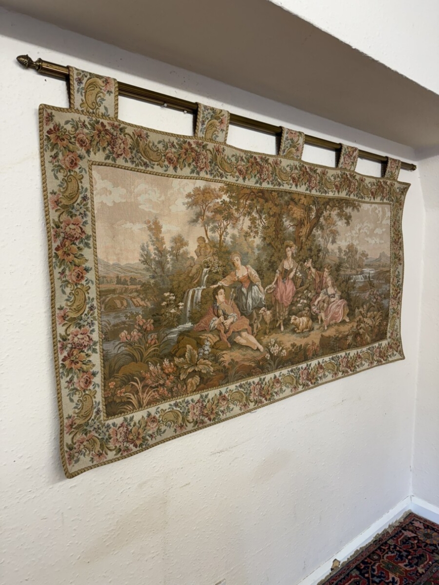 This large tapestry depicts a river bank scene with floral edging and tabs to the top. The tapestry is lined on the reverse and the tapestry hangs on a brass pole with acorn finials.