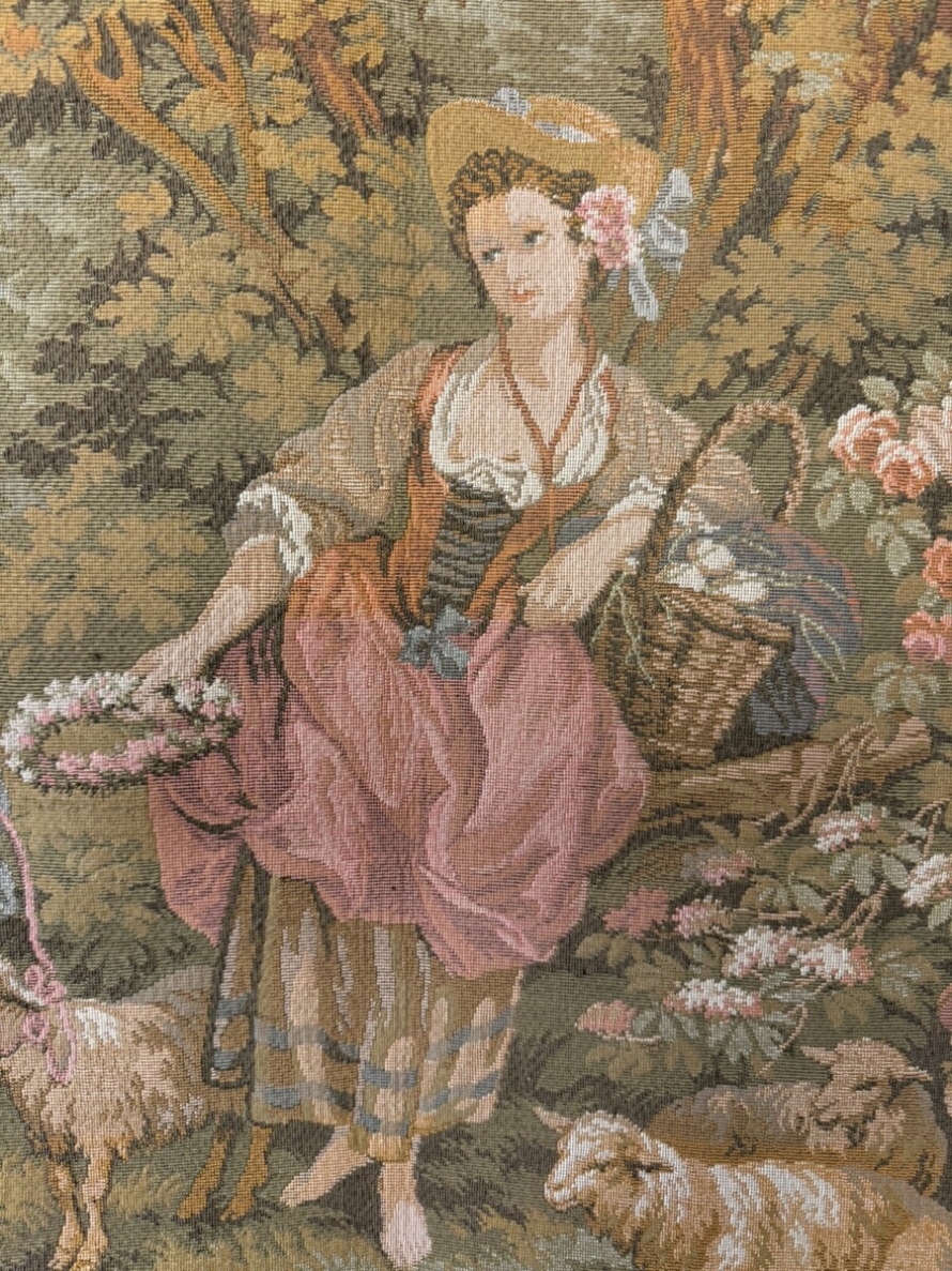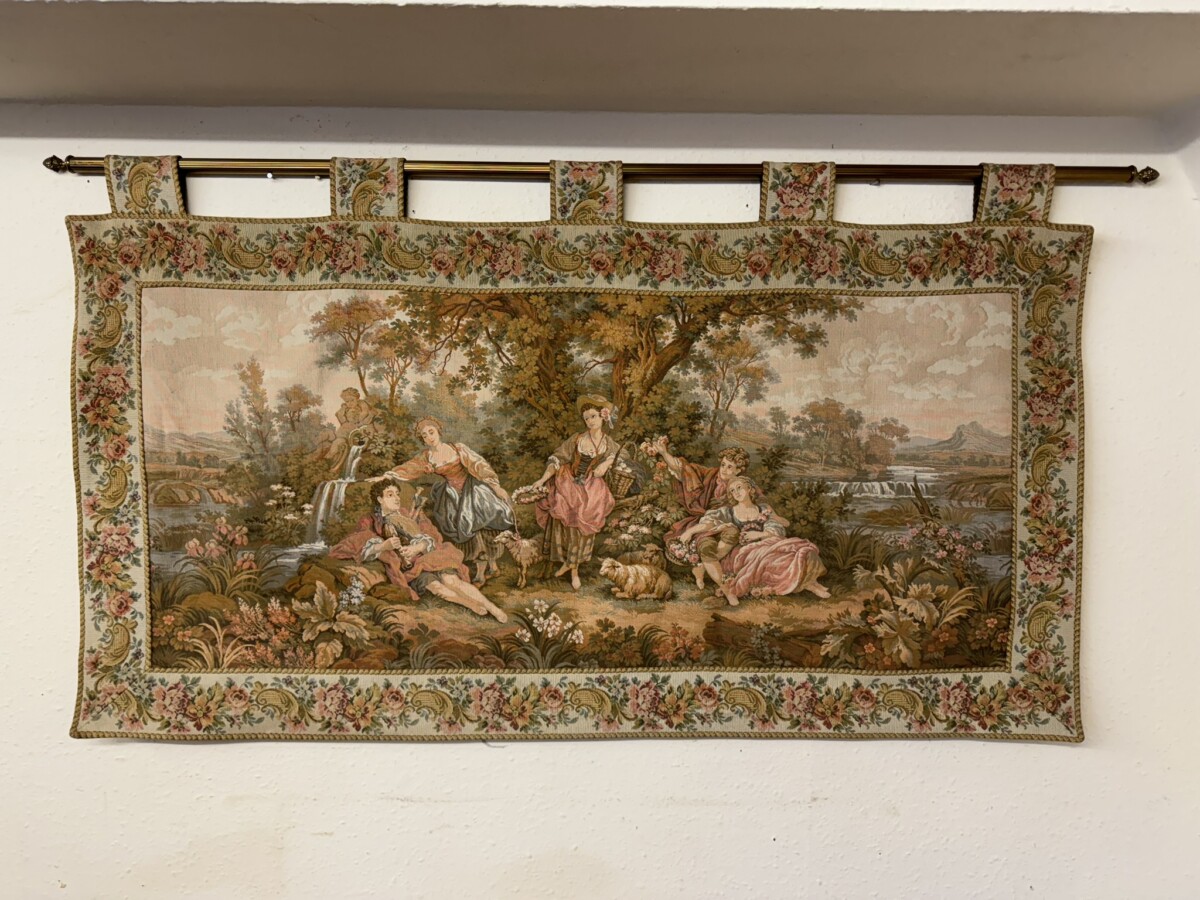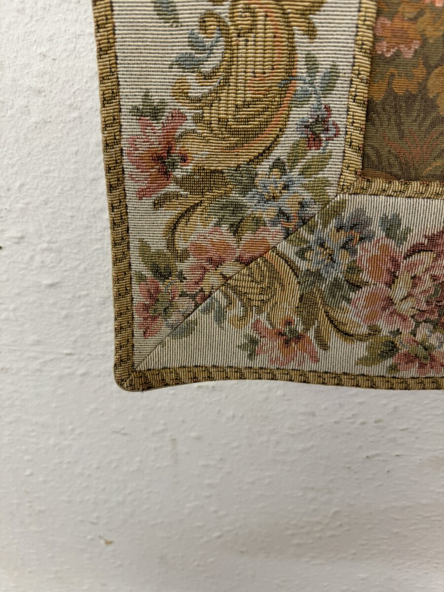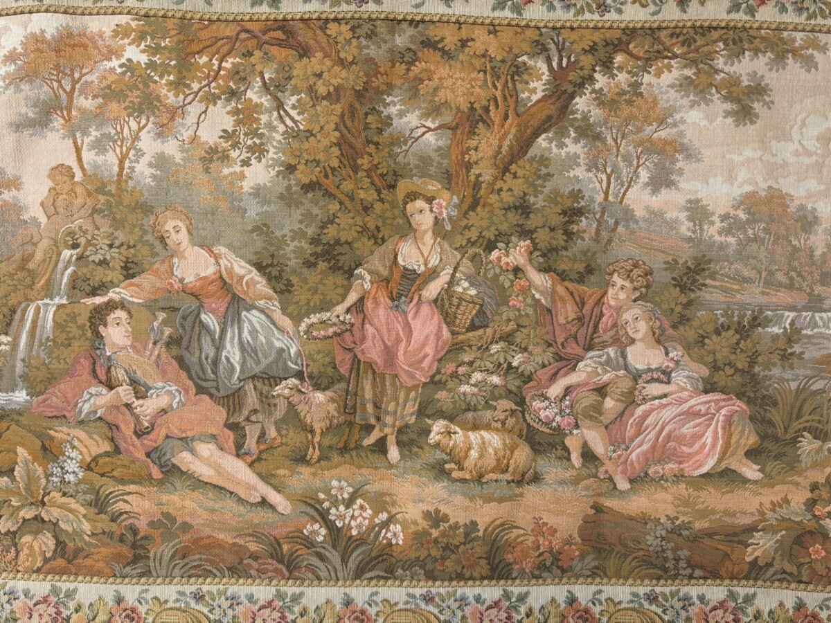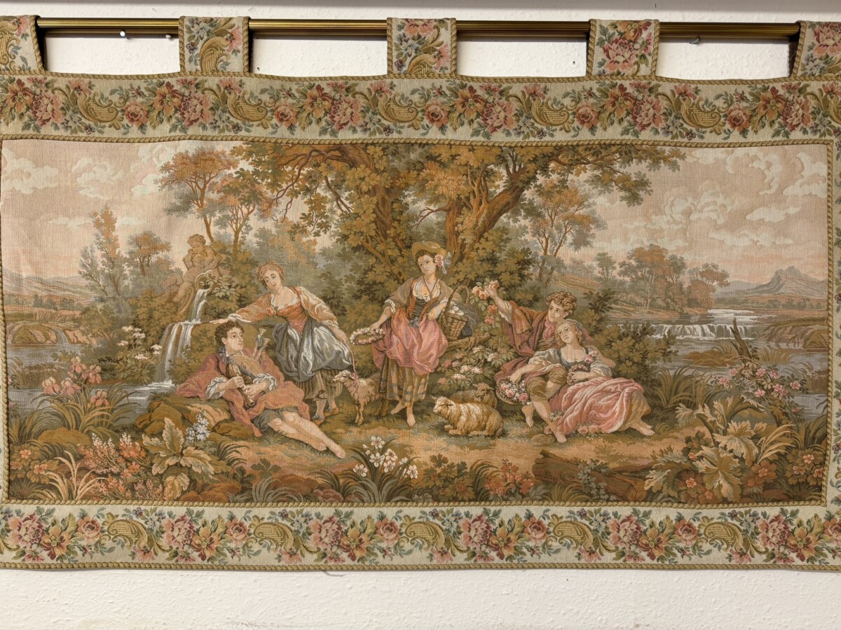 This large tapestry depicts a river bank scene with floral edging and tabs to the top. The tapestry is lined on the reverse and the tapestry hangs on a brass pole with acorn finials.