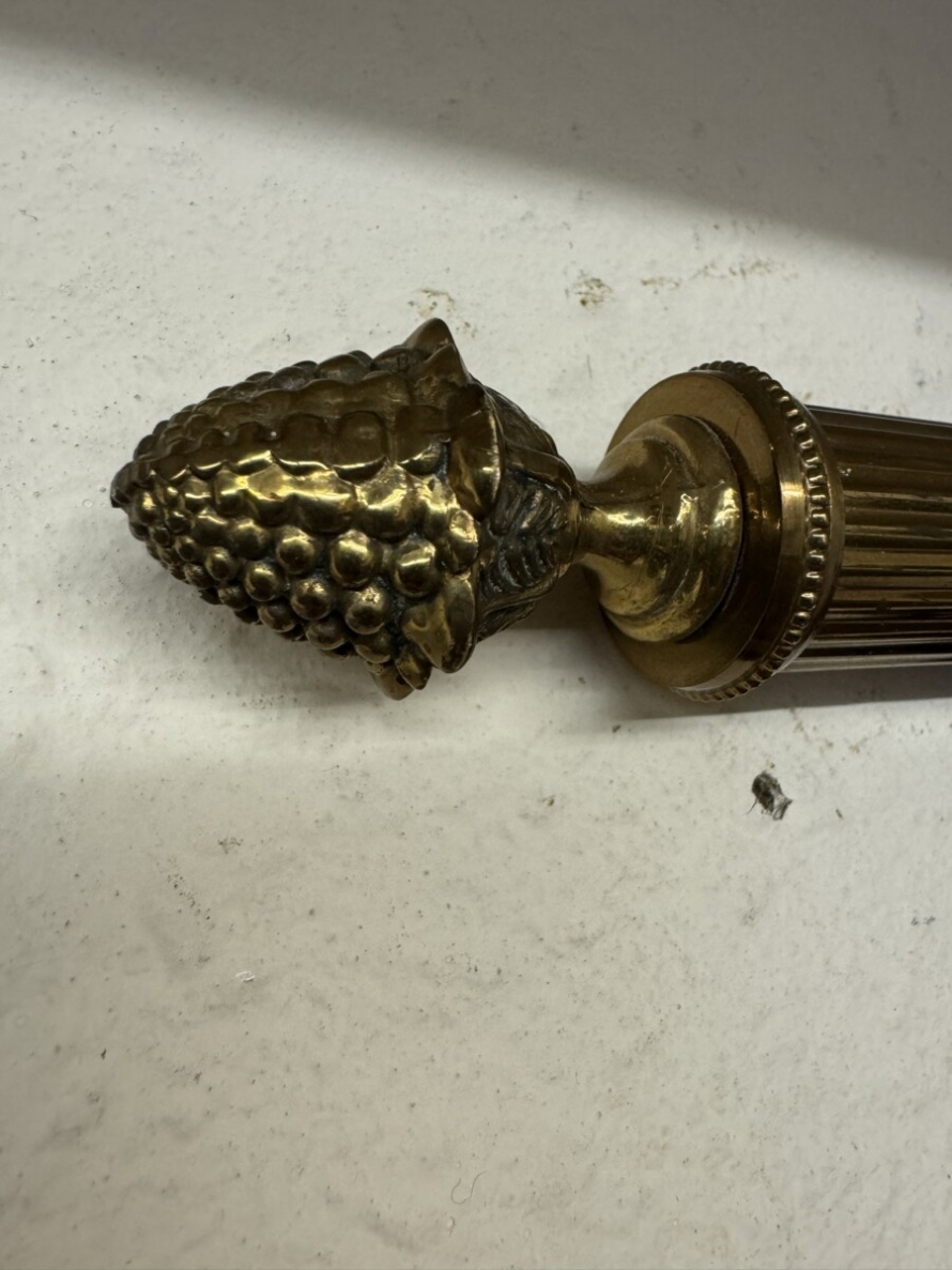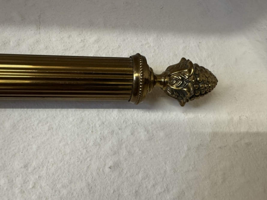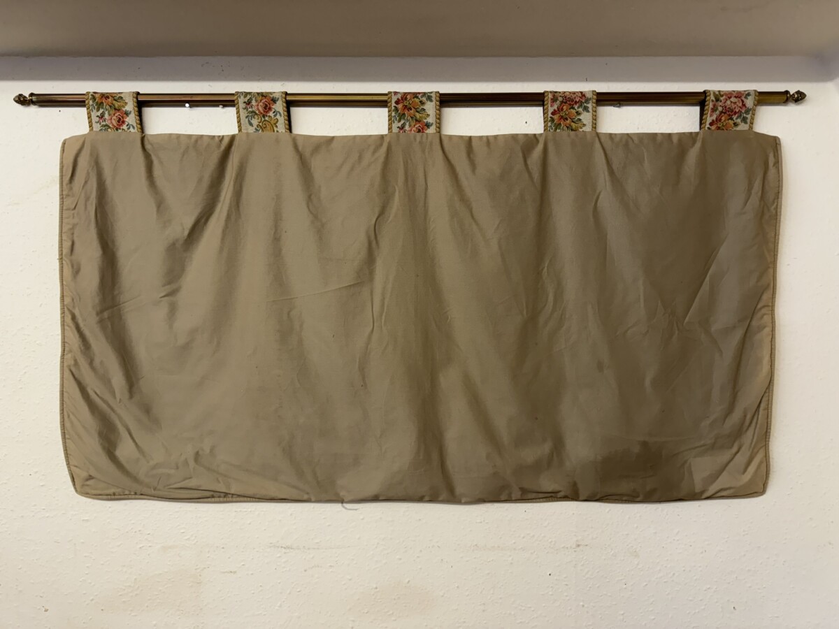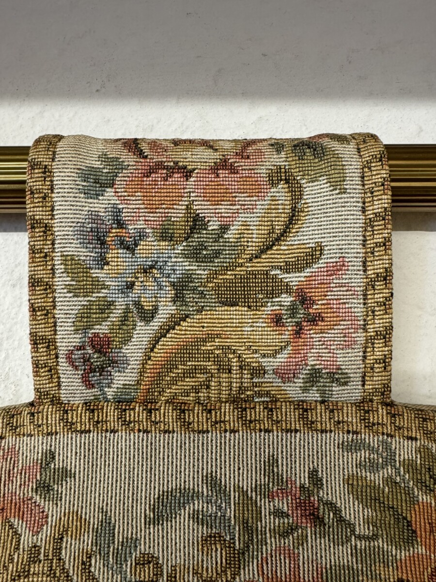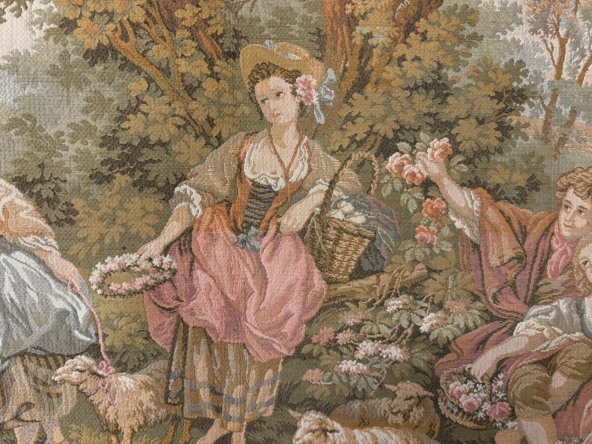 This large tapestry depicts a river bank scene with floral edging and tabs to the top. The tapestry is lined on the reverse and the tapestry hangs on a brass pole with acorn finials.