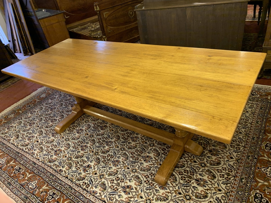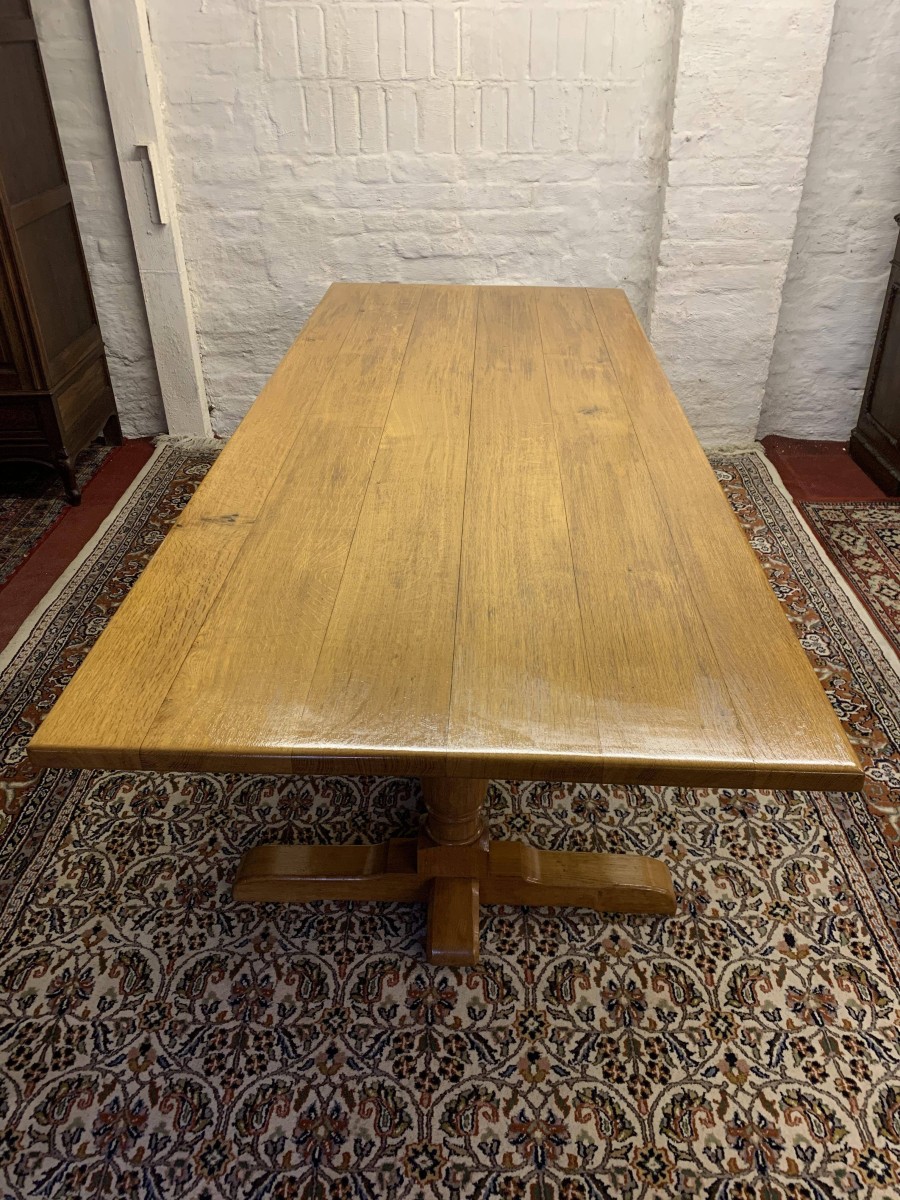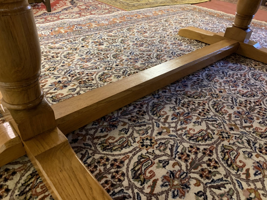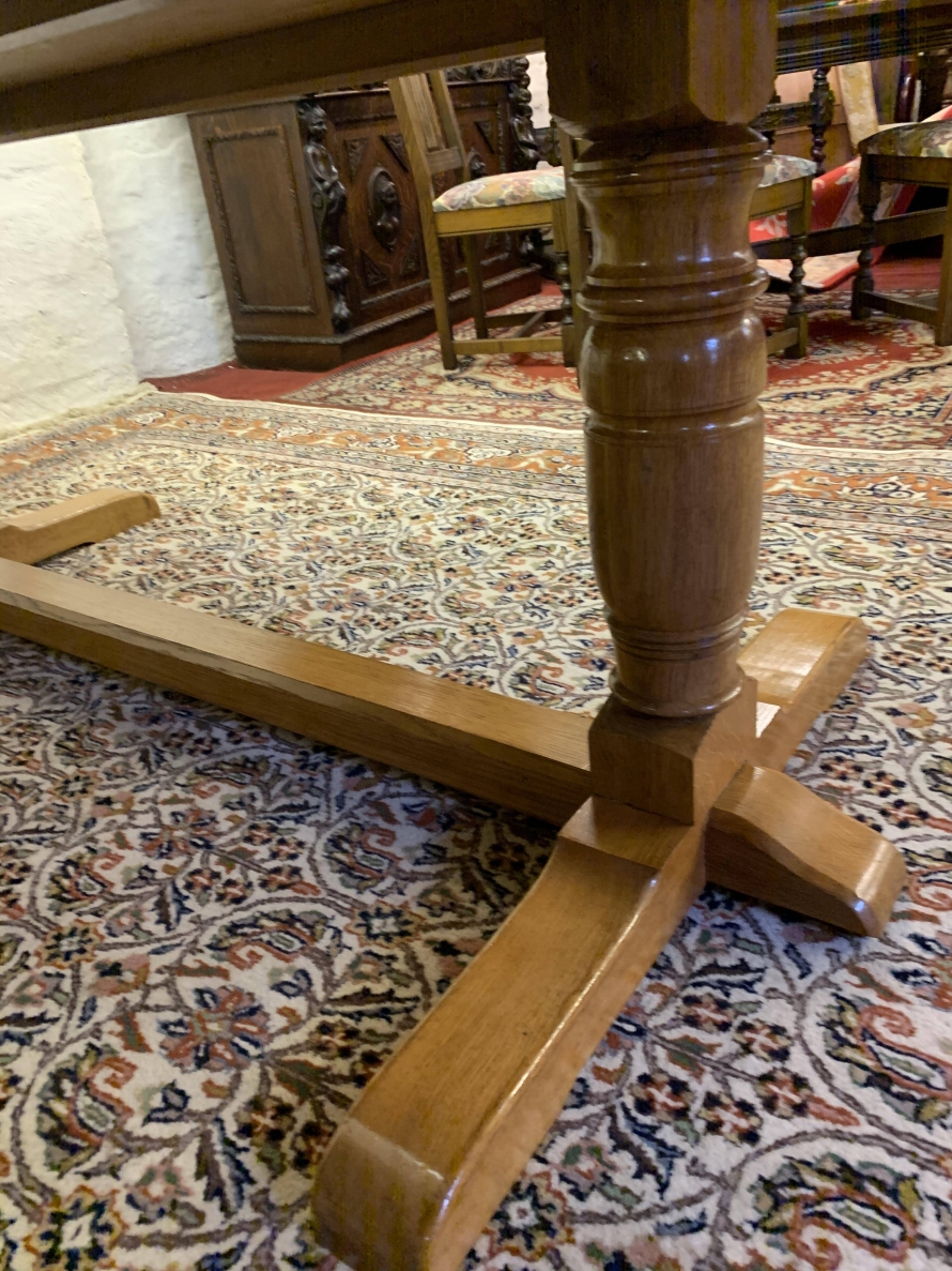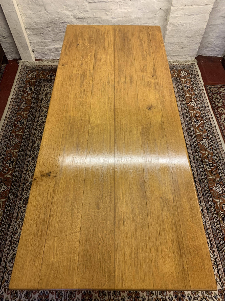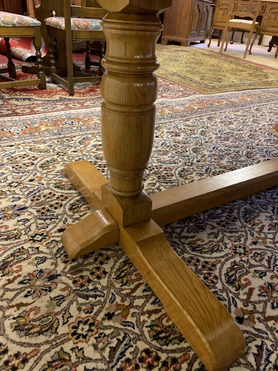 The table top has six panels, each panel over an inch in thickness. The table base consists of two sturdy turned legs connected by a fabulous stretcher. Please note this fantastic table is made entirely of solid oak, the platina of the oak is striking.