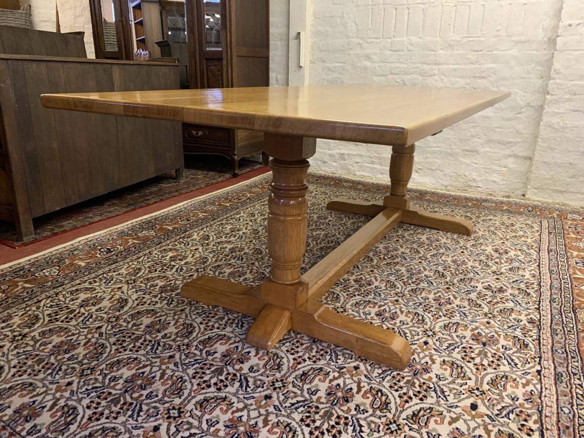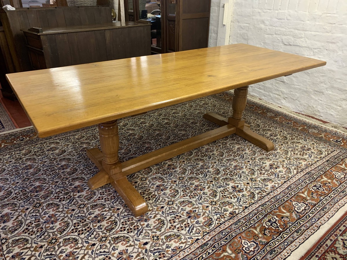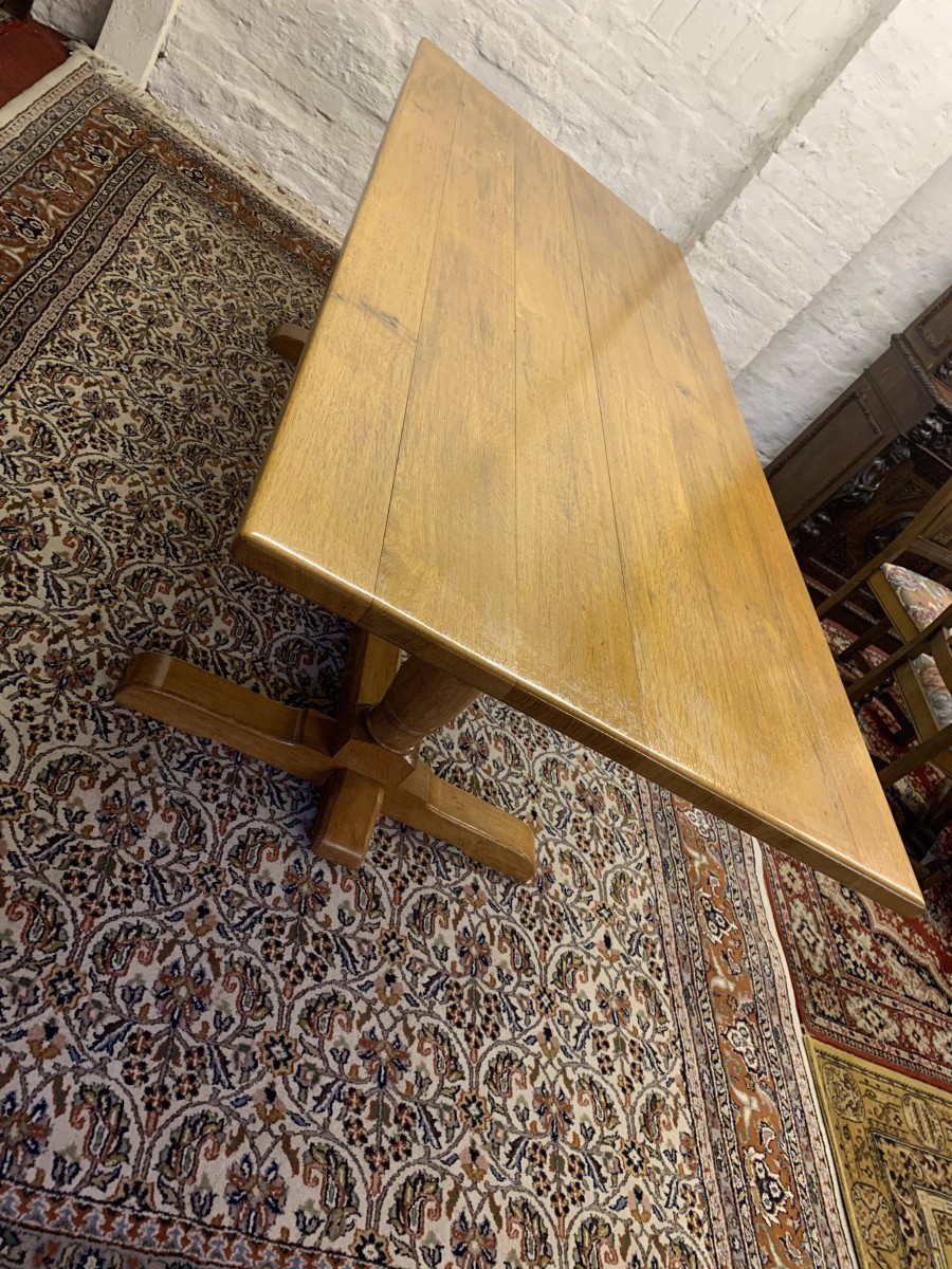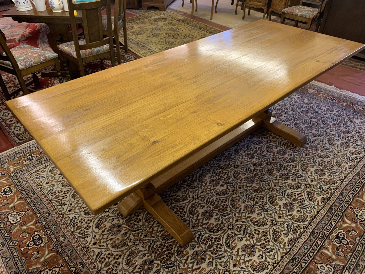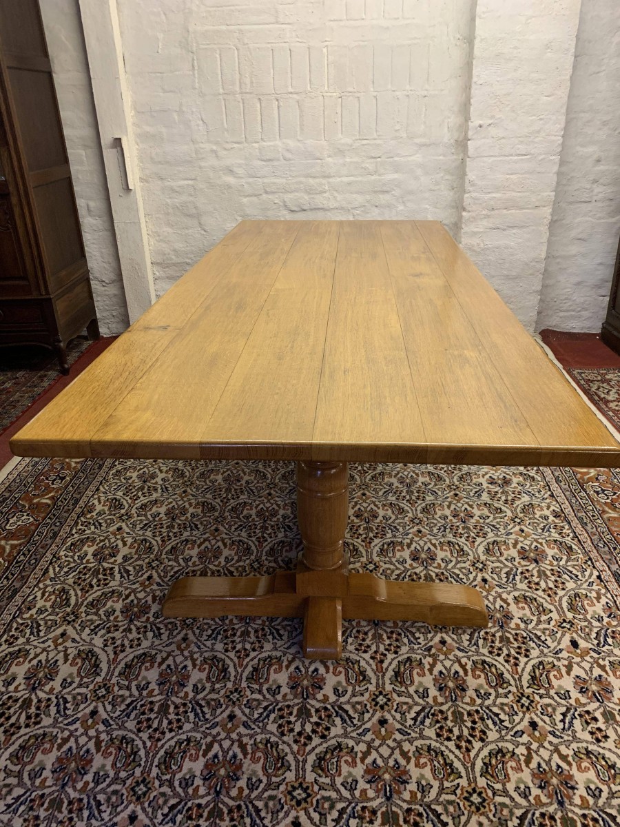 The table top has six panels, each panel over an inch in thickness. The table base consists of two sturdy turned legs connected by a fabulous stretcher. Please note this fantastic table is made entirely of solid oak, the platina of the oak is striking.