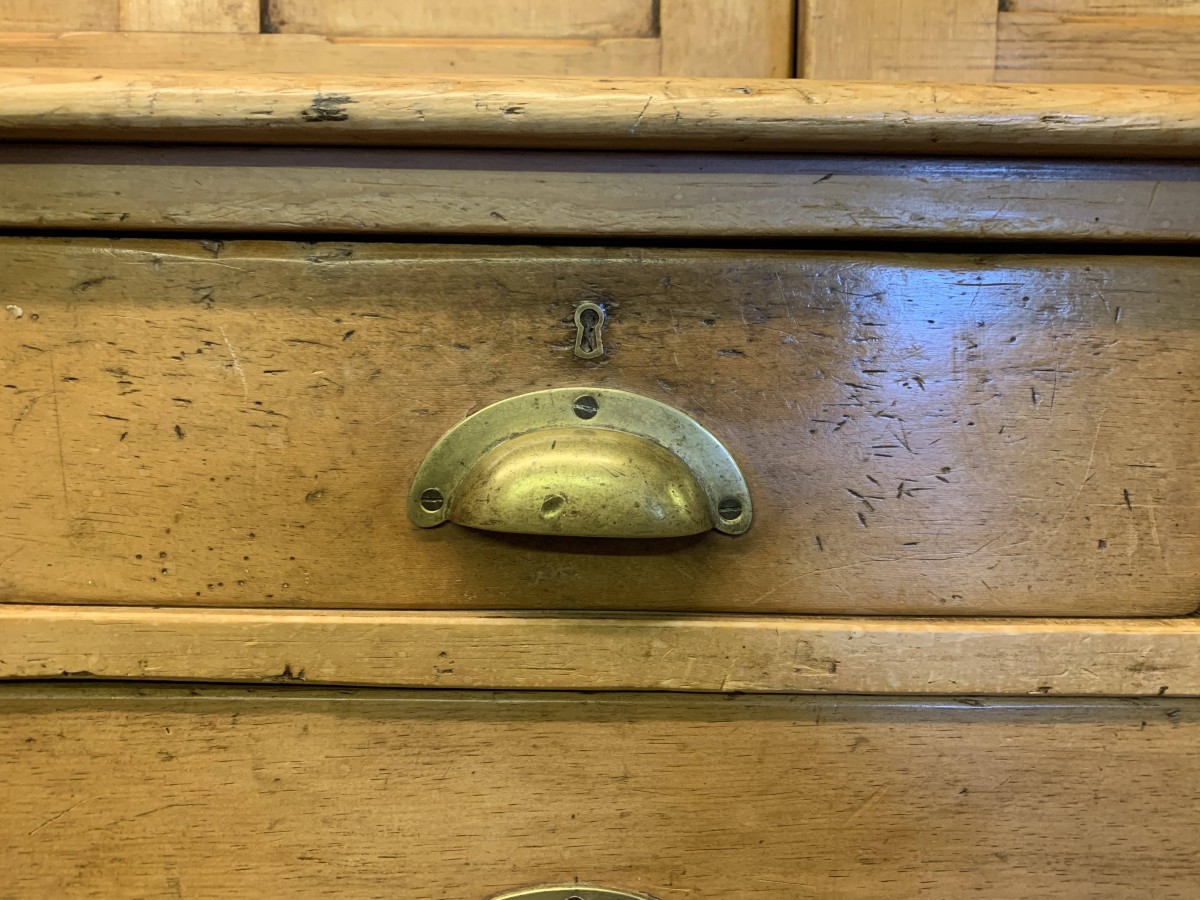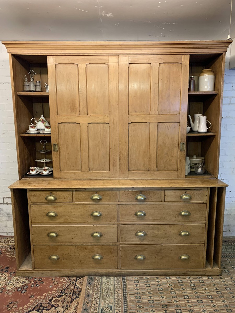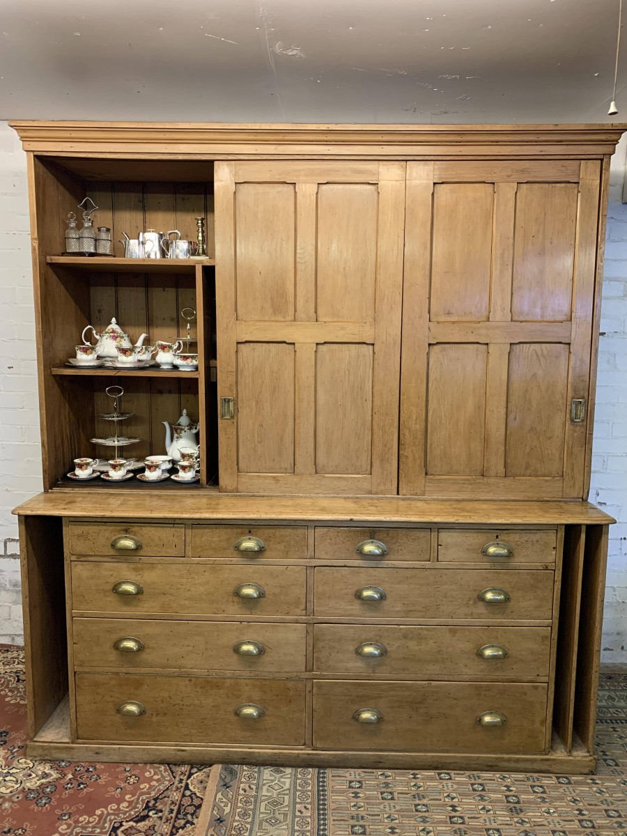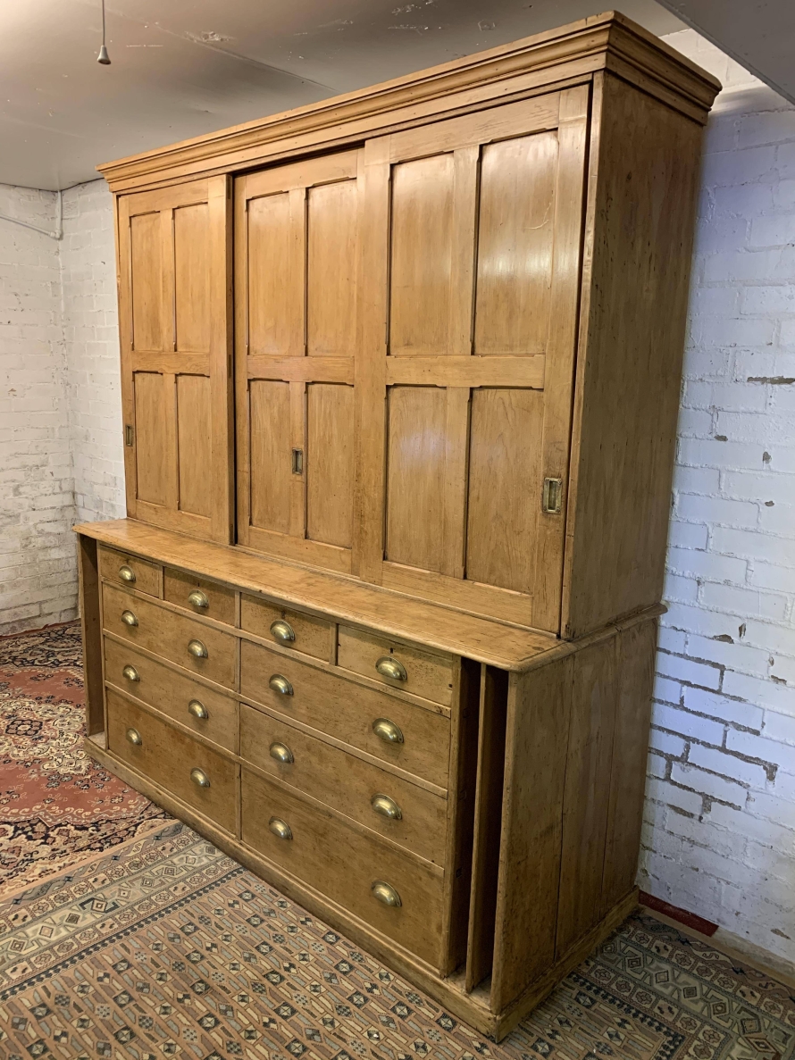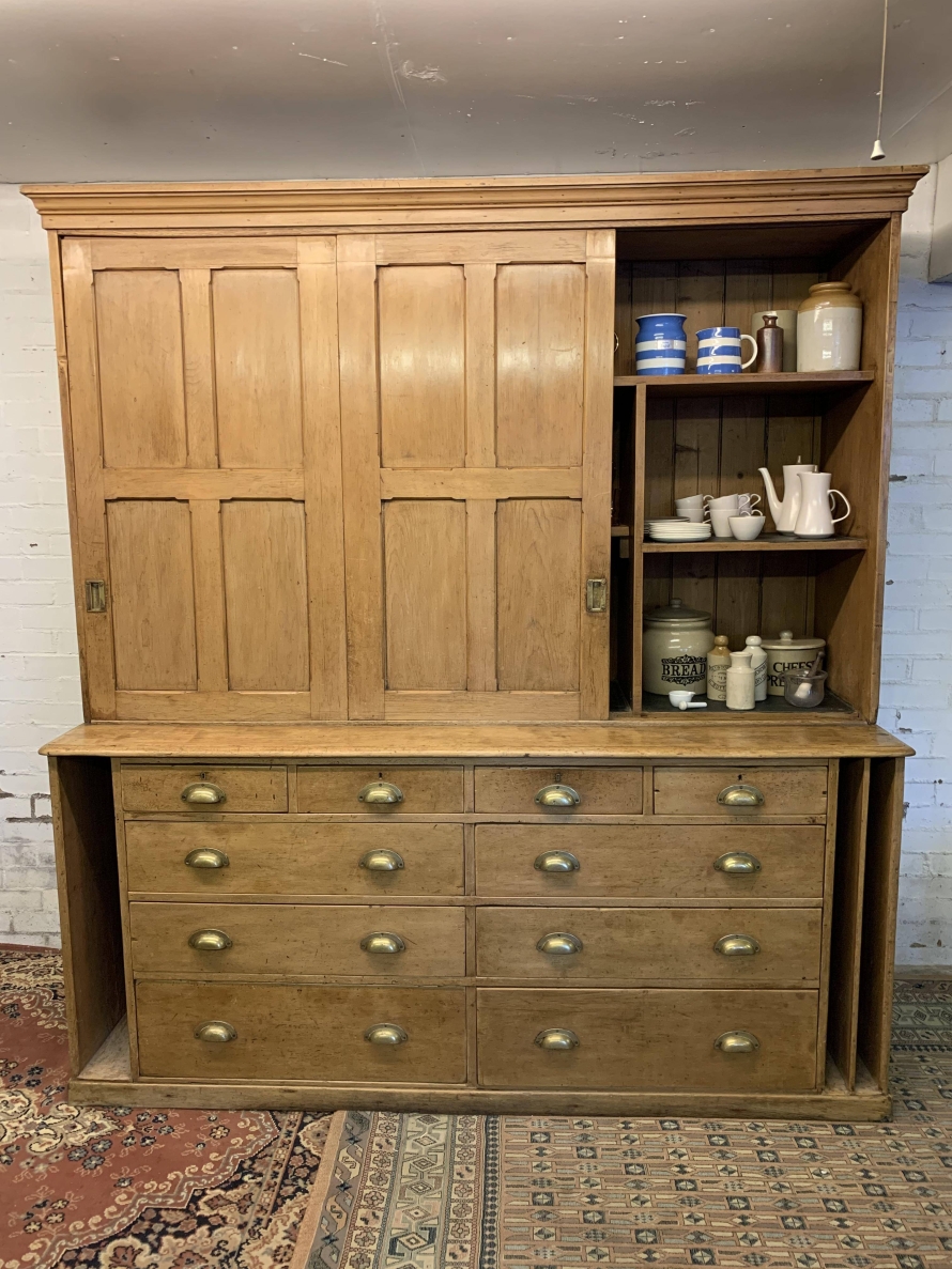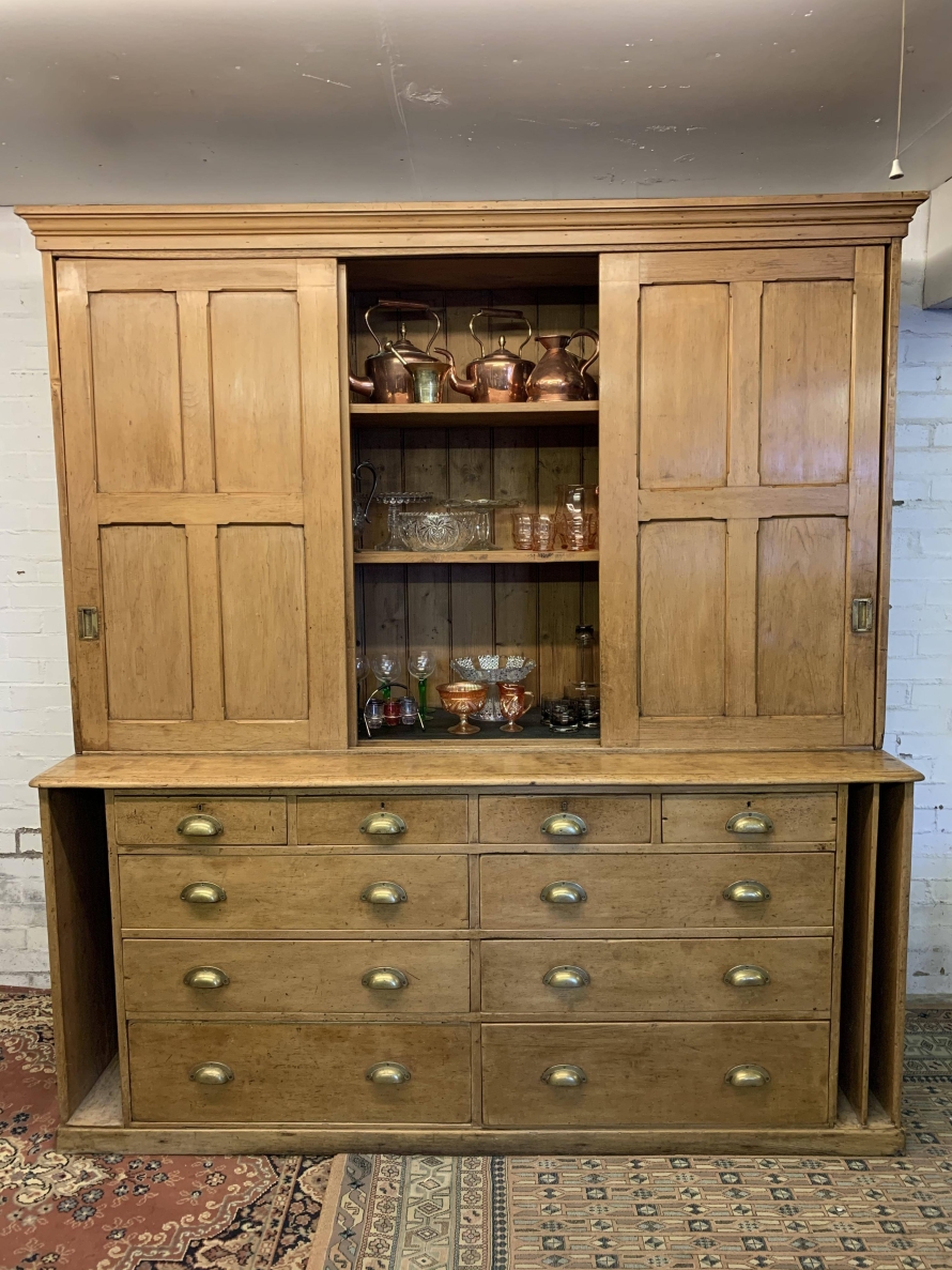 A fantastic example of pine Victorian furniture. The oversailing top sits above three sliding panelled doors, each door having a brass pull handle to slide the doors open and shut. Each of the doors open to reveal two pine shelves. Below are an arrangement of four short and six long drawers, the single drawer has a brass handle, the larger drawers have a pair of brass handles. There are areas either end of the drawers for tray etc storage. A glorious housekeepers cupboard offering substantial storage.