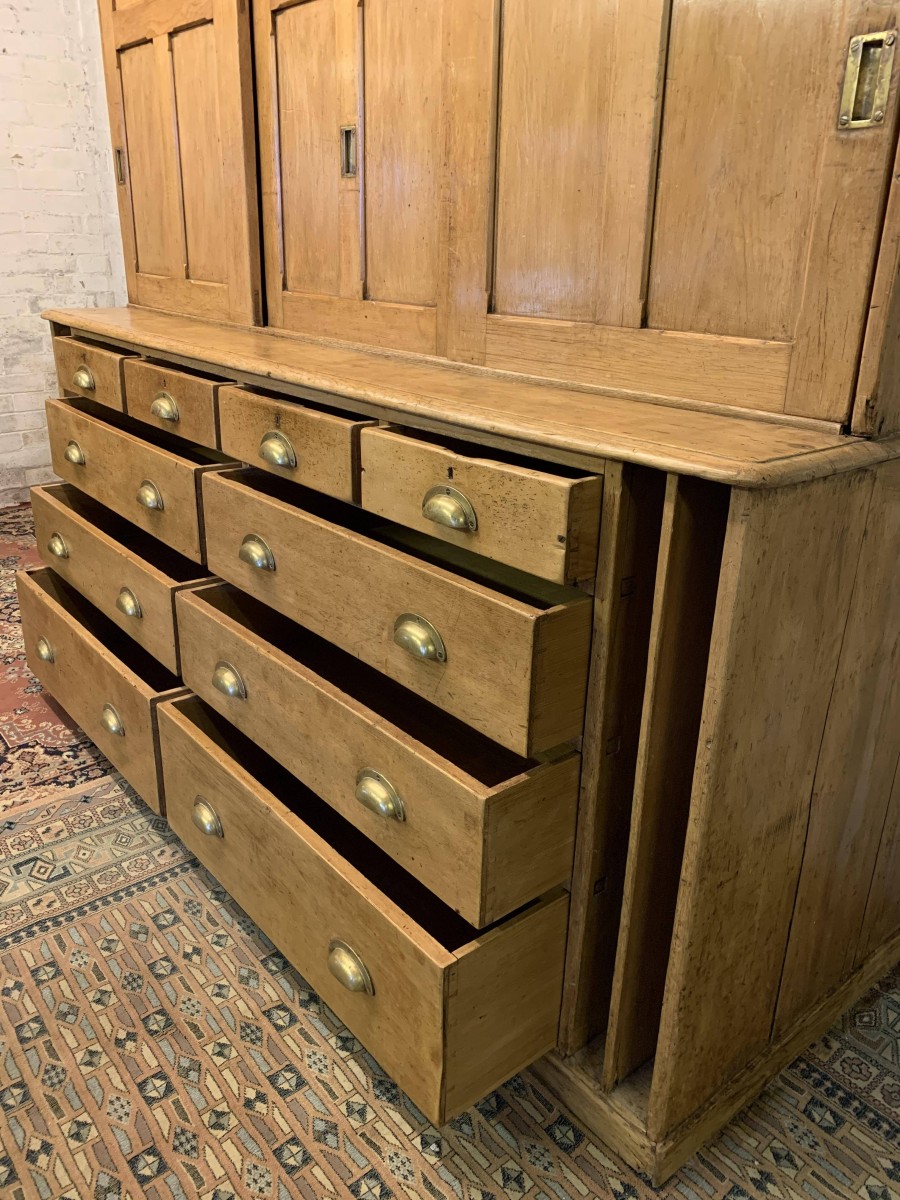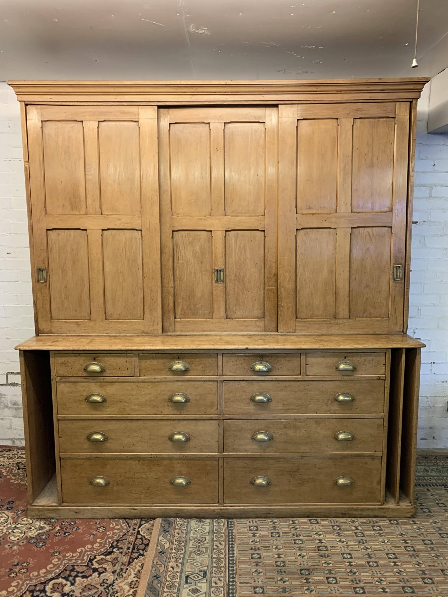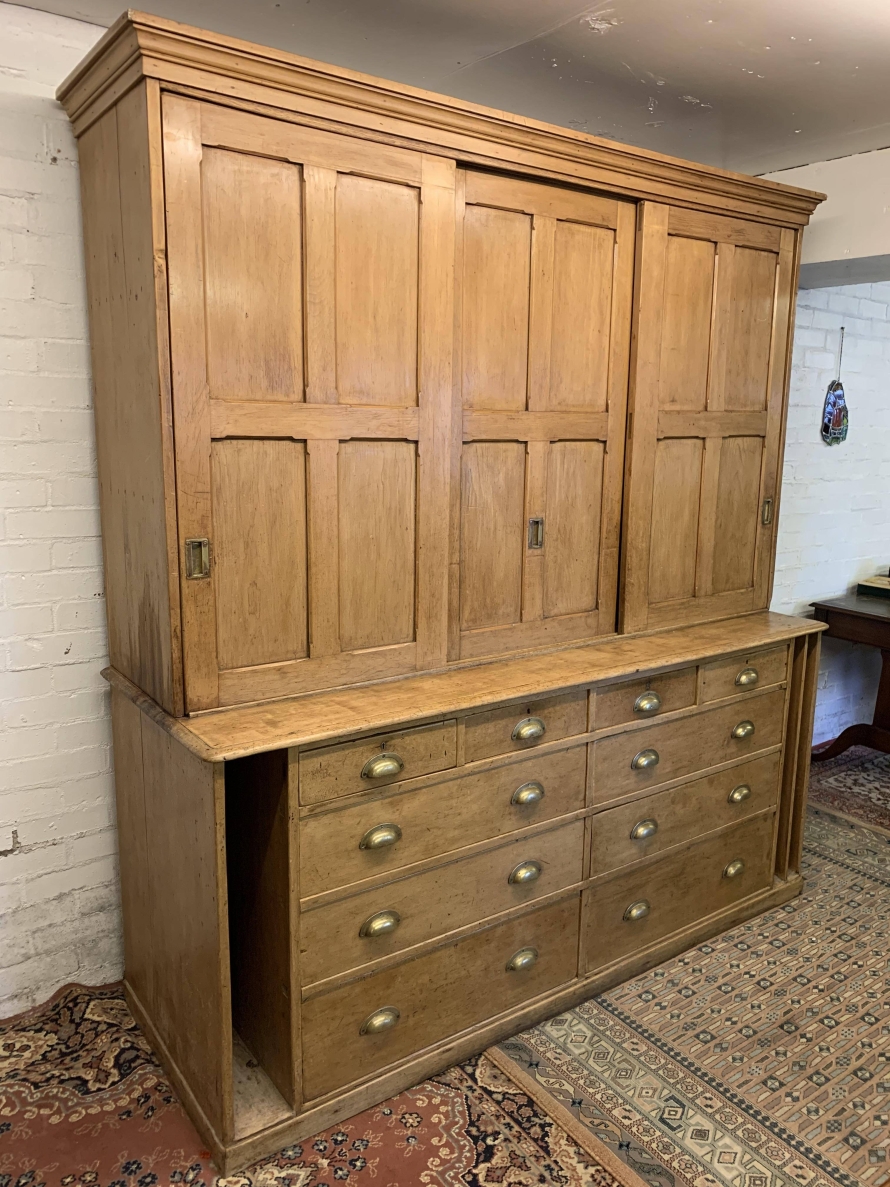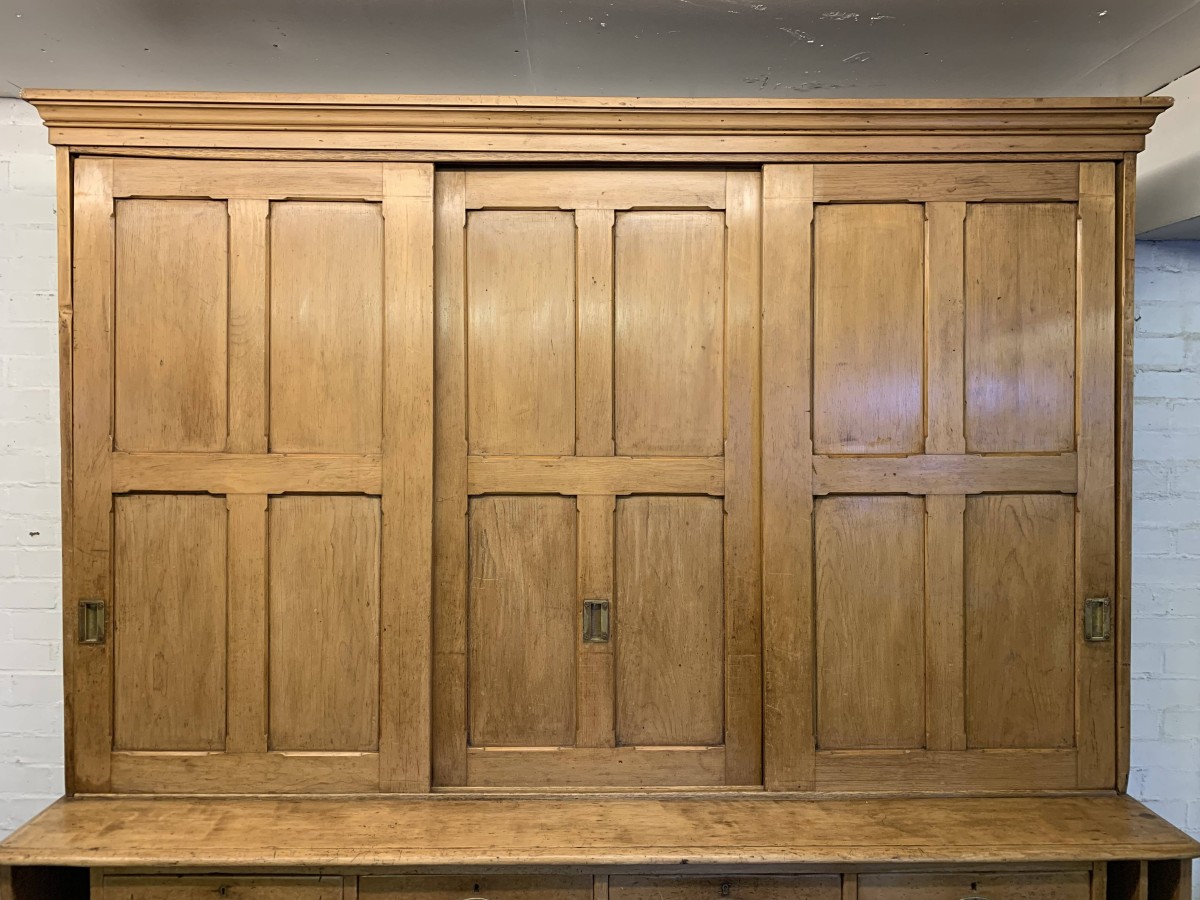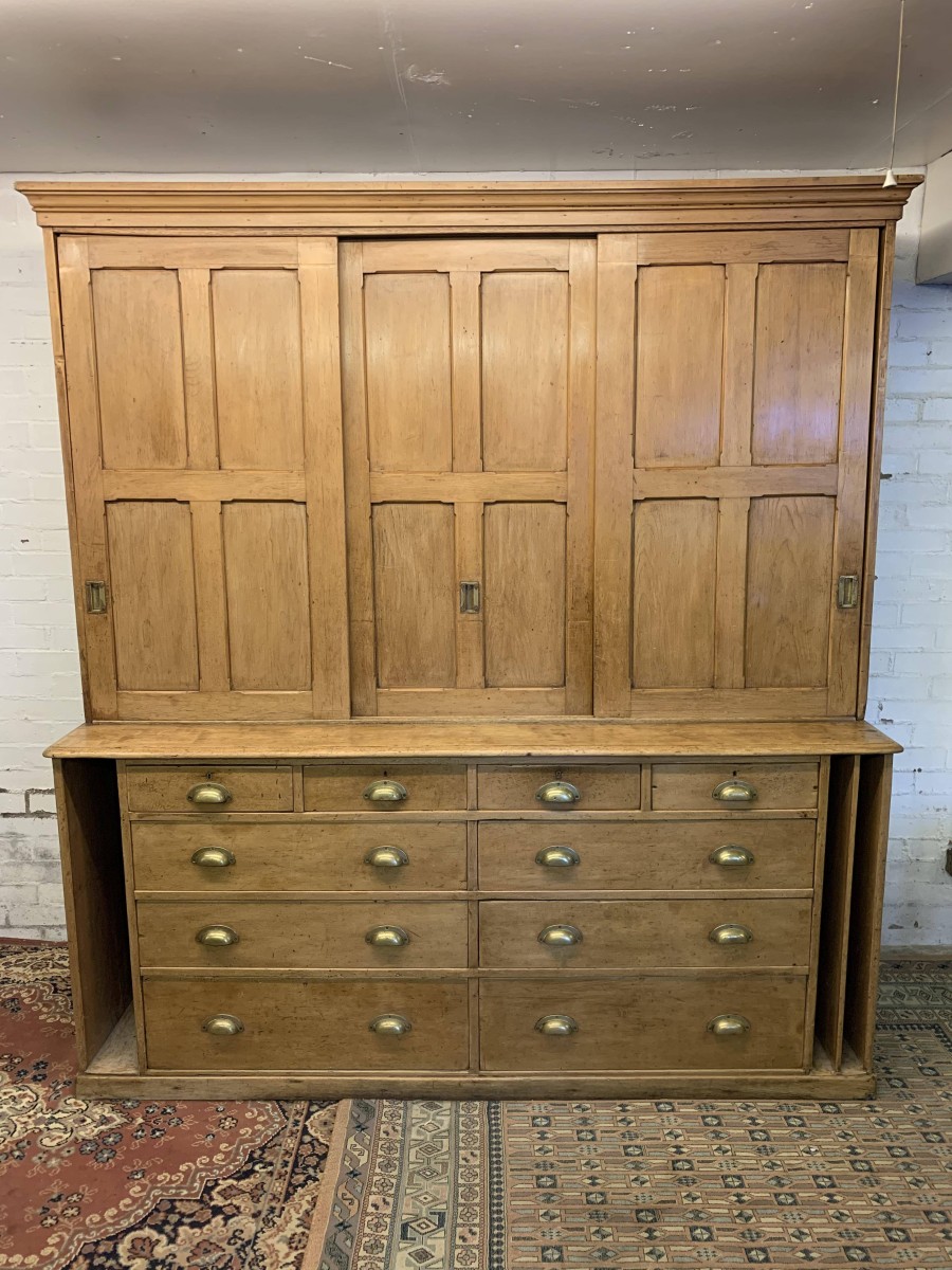 A fantastic example of pine Victorian furniture. The oversailing top sits above three sliding panelled doors, each door having a brass pull handle to slide the doors open and shut. Each of the doors open to reveal two pine shelves. Below are an arrangement of four short and six long drawers, the single drawer has a brass handle, the larger drawers have a pair of brass handles. There are areas either end of the drawers for tray etc storage. A glorious housekeepers cupboard offering substantial storage.