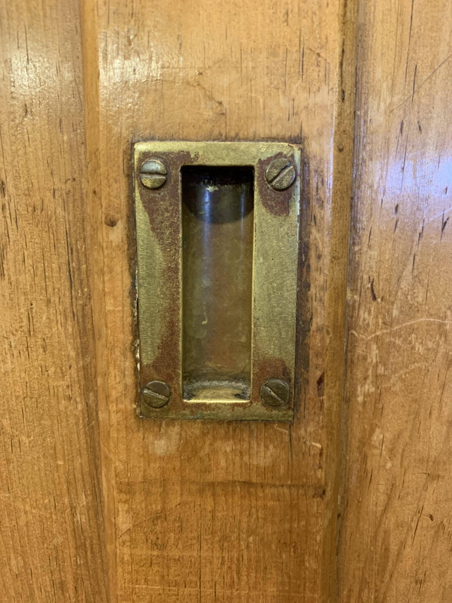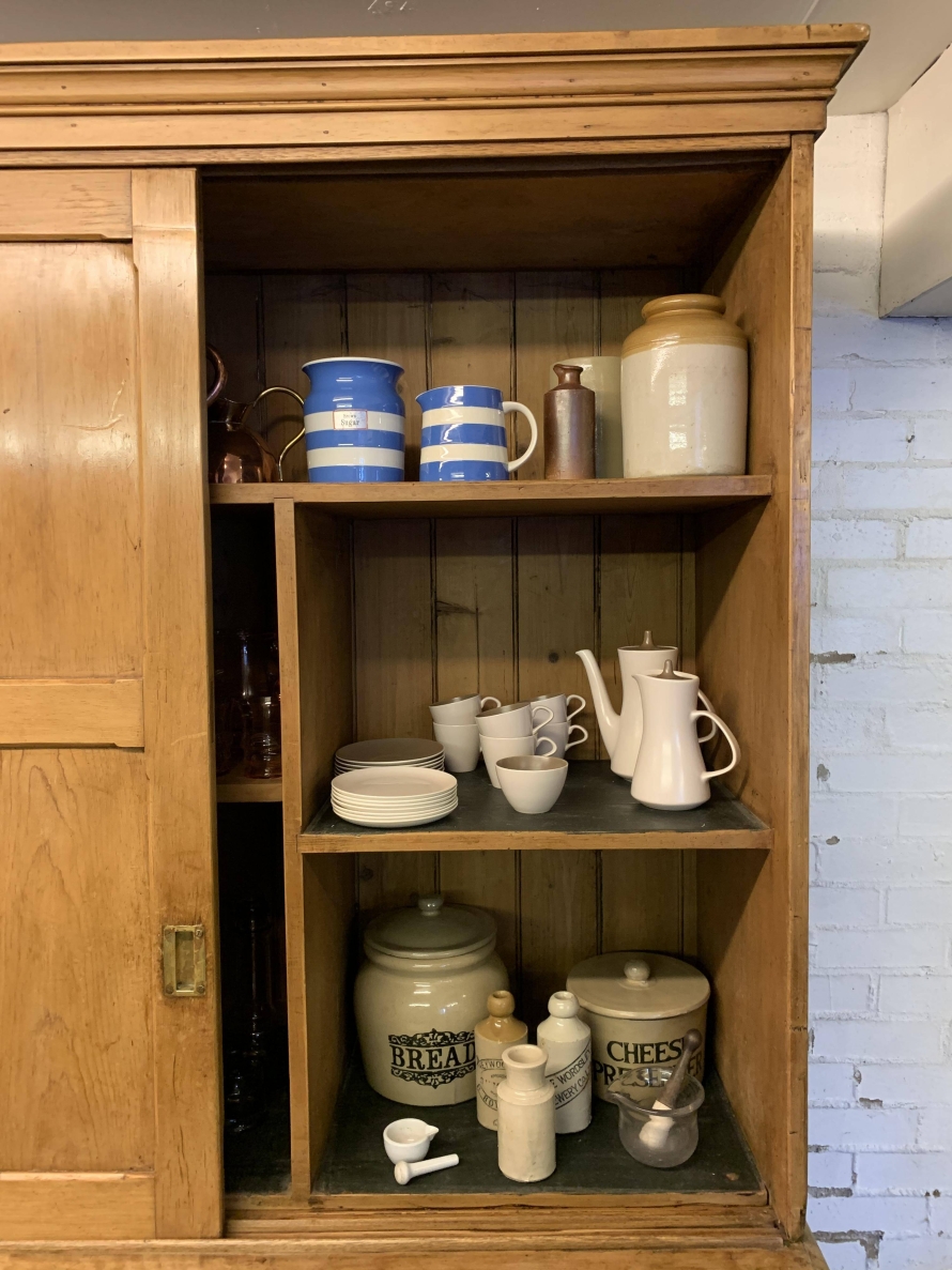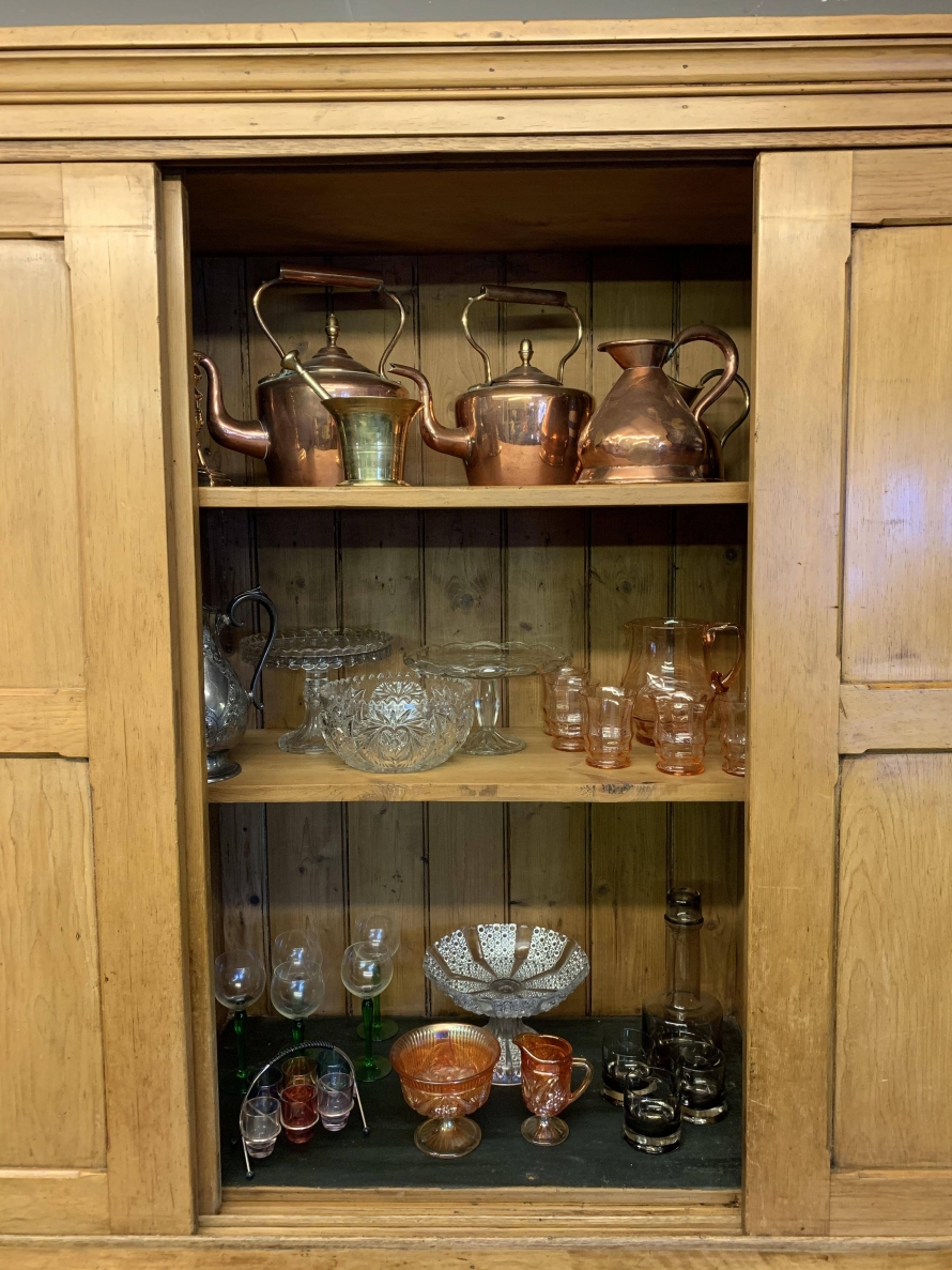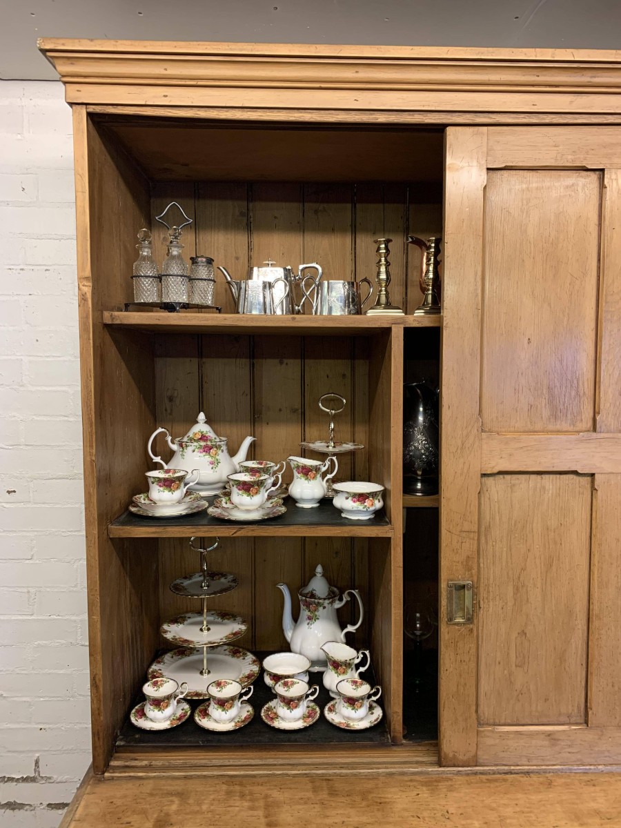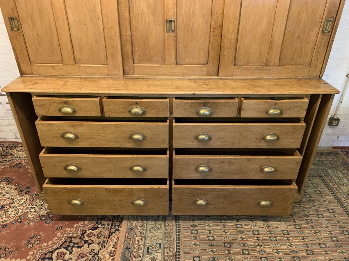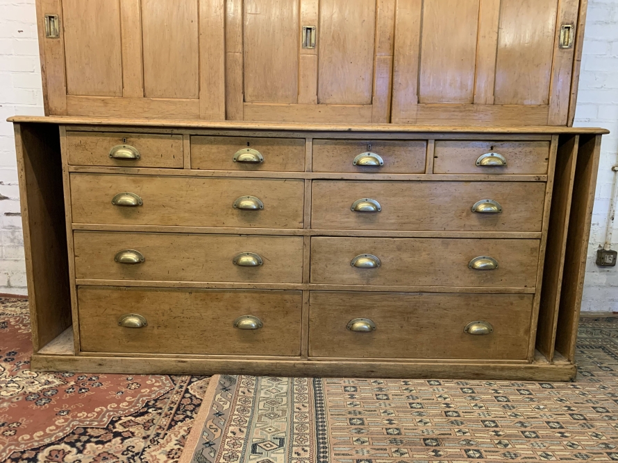 A fantastic example of pine Victorian furniture. The oversailing top sits above three sliding panelled doors, each door having a brass pull handle to slide the doors open and shut. Each of the doors open to reveal two pine shelves. Below are an arrangement of four short and six long drawers, the single drawer has a brass handle, the larger drawers have a pair of brass handles. There are areas either end of the drawers for tray etc storage. A glorious housekeepers cupboard offering substantial storage.