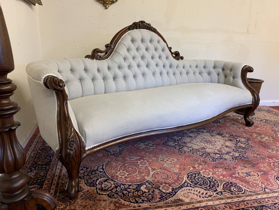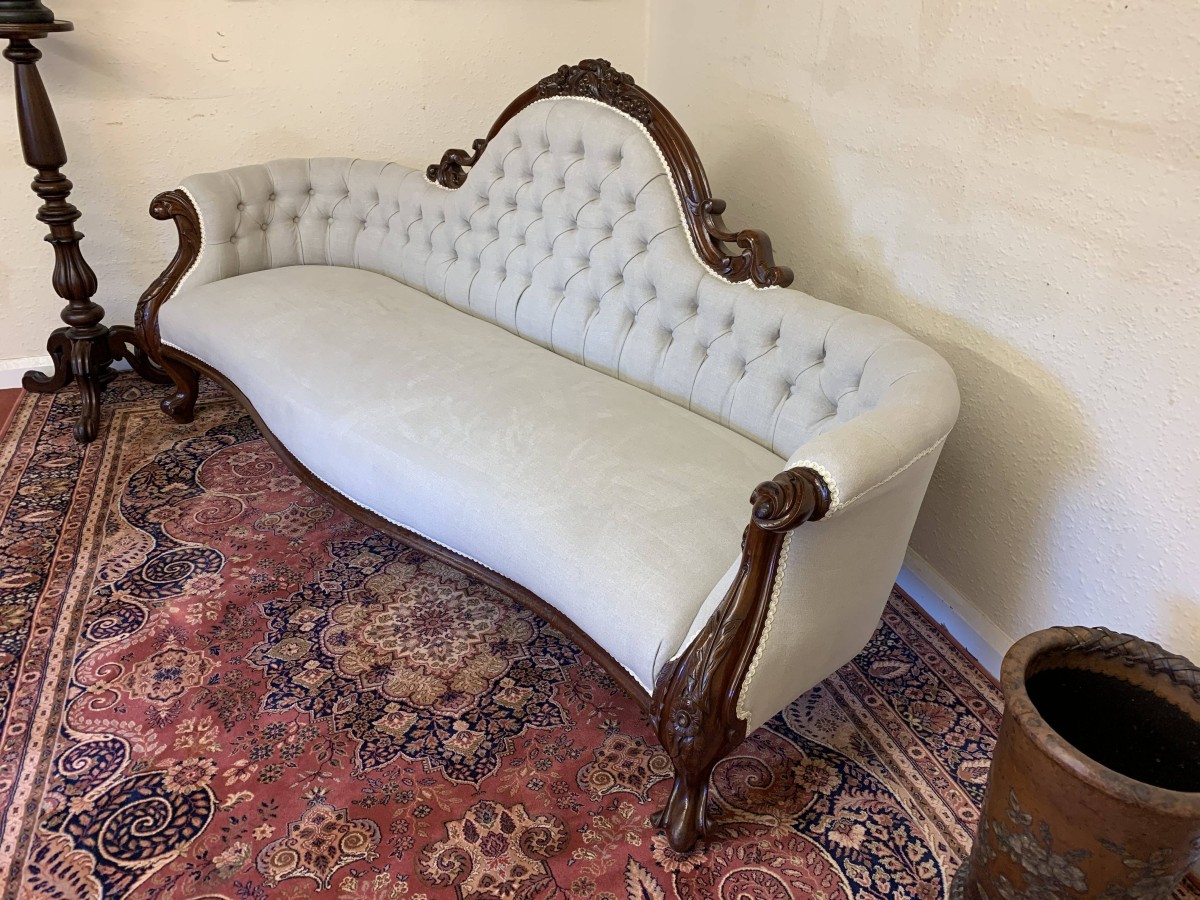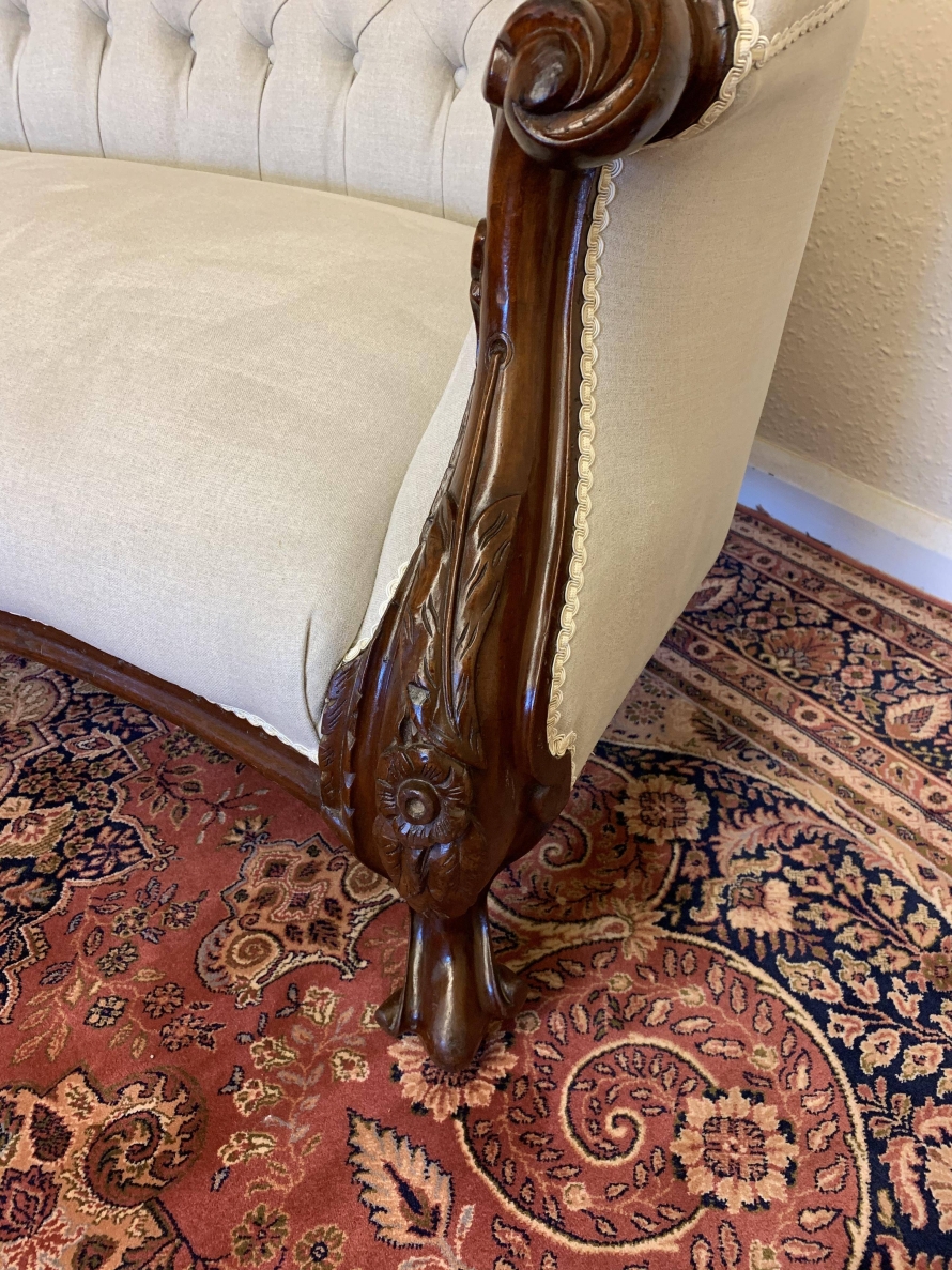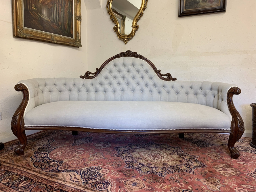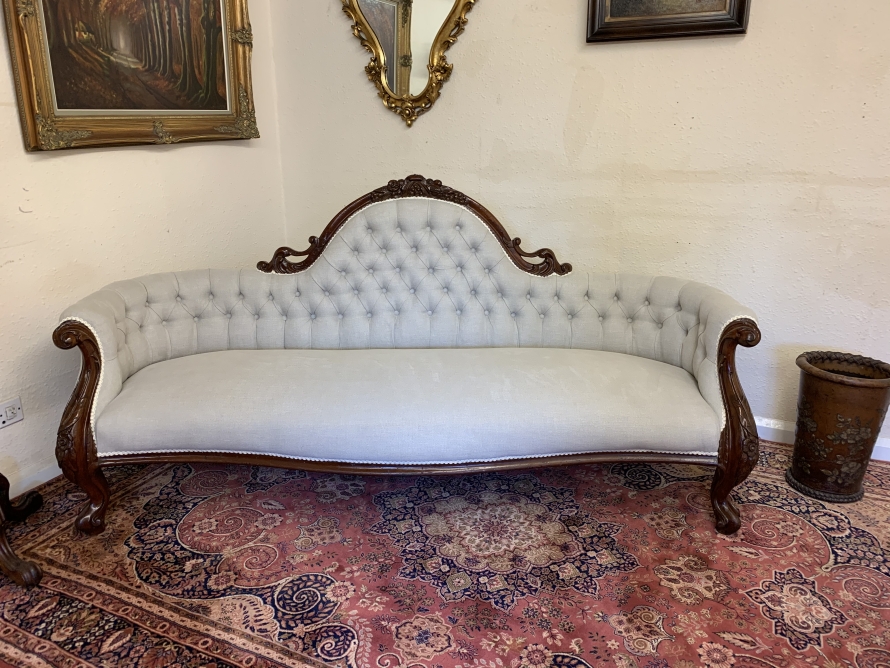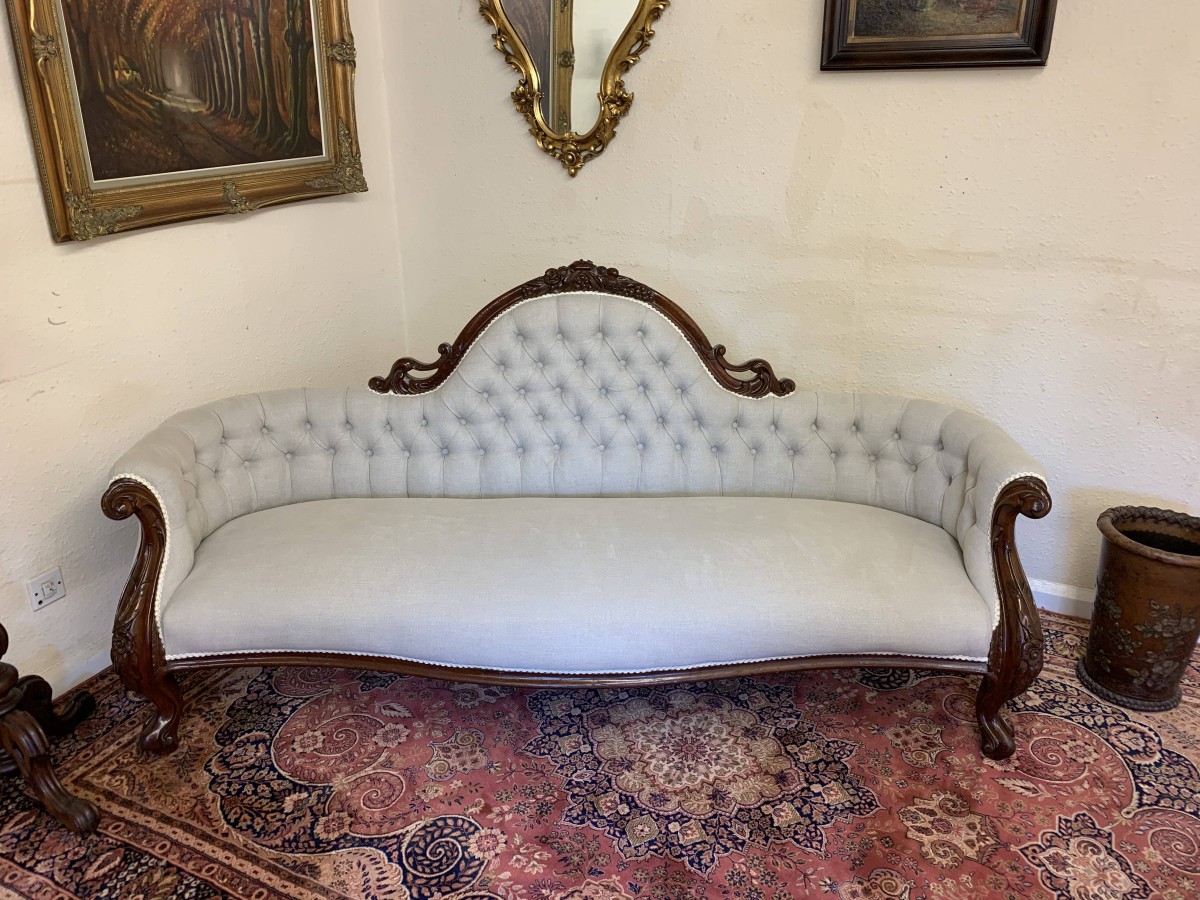 This stunning antique settee is in excellent condition and dates Circa 1865. The back rises to a fabulous central carving. Carved flowing arms, shaped skirt this fabulous settee stands on carved cabriole legs to the front. This newly reupholsterd settee has a deep buttoned back and cushioned serpentine outline seat. The neutral on trend fabric will blend with any interior.