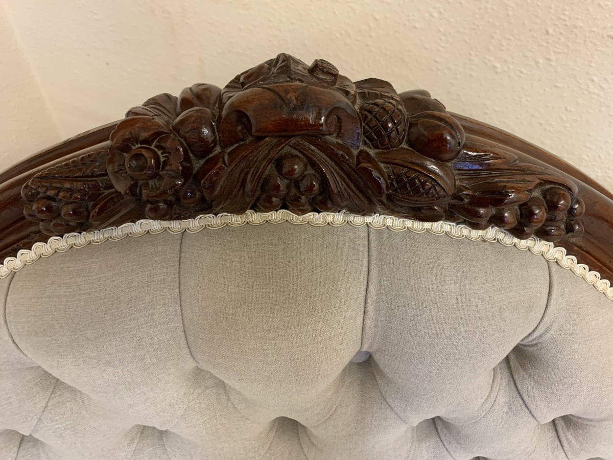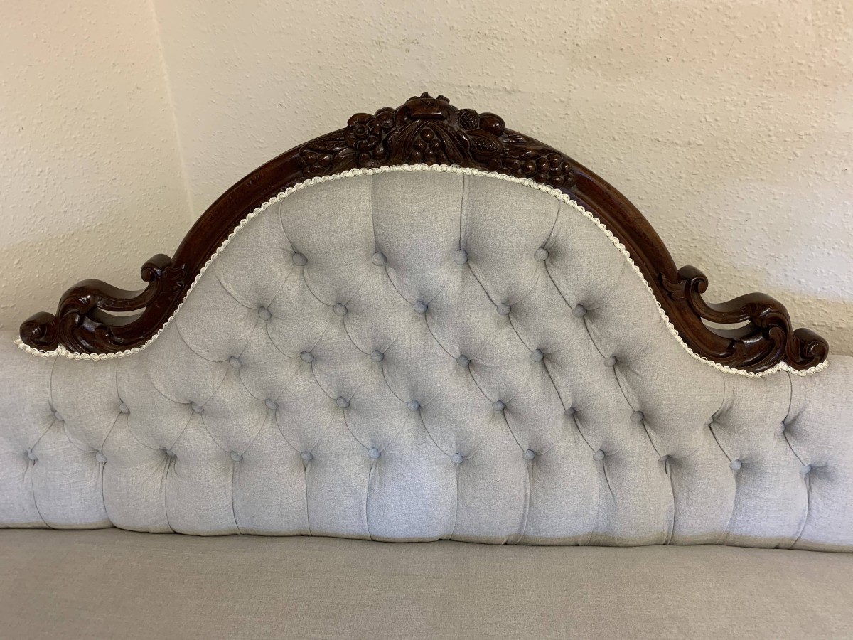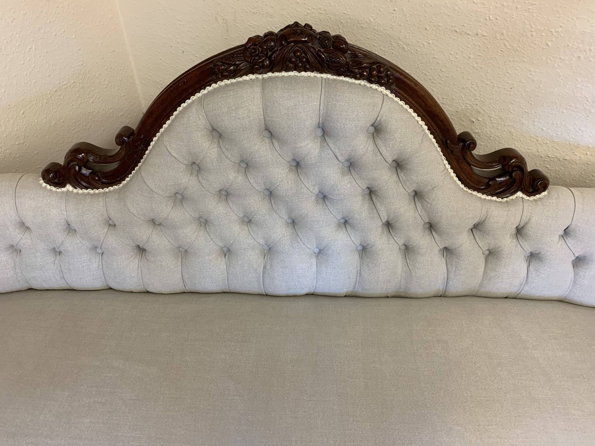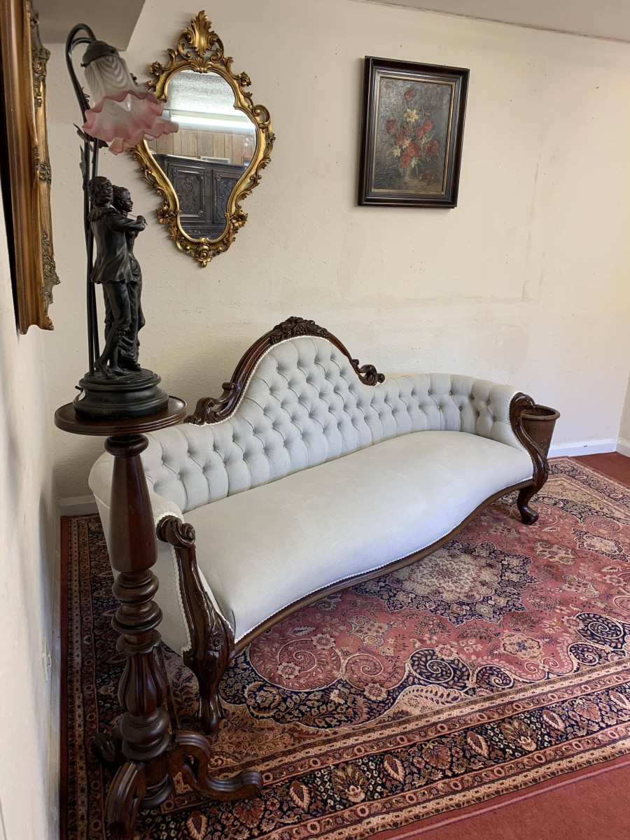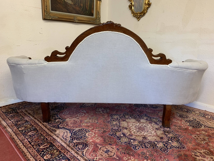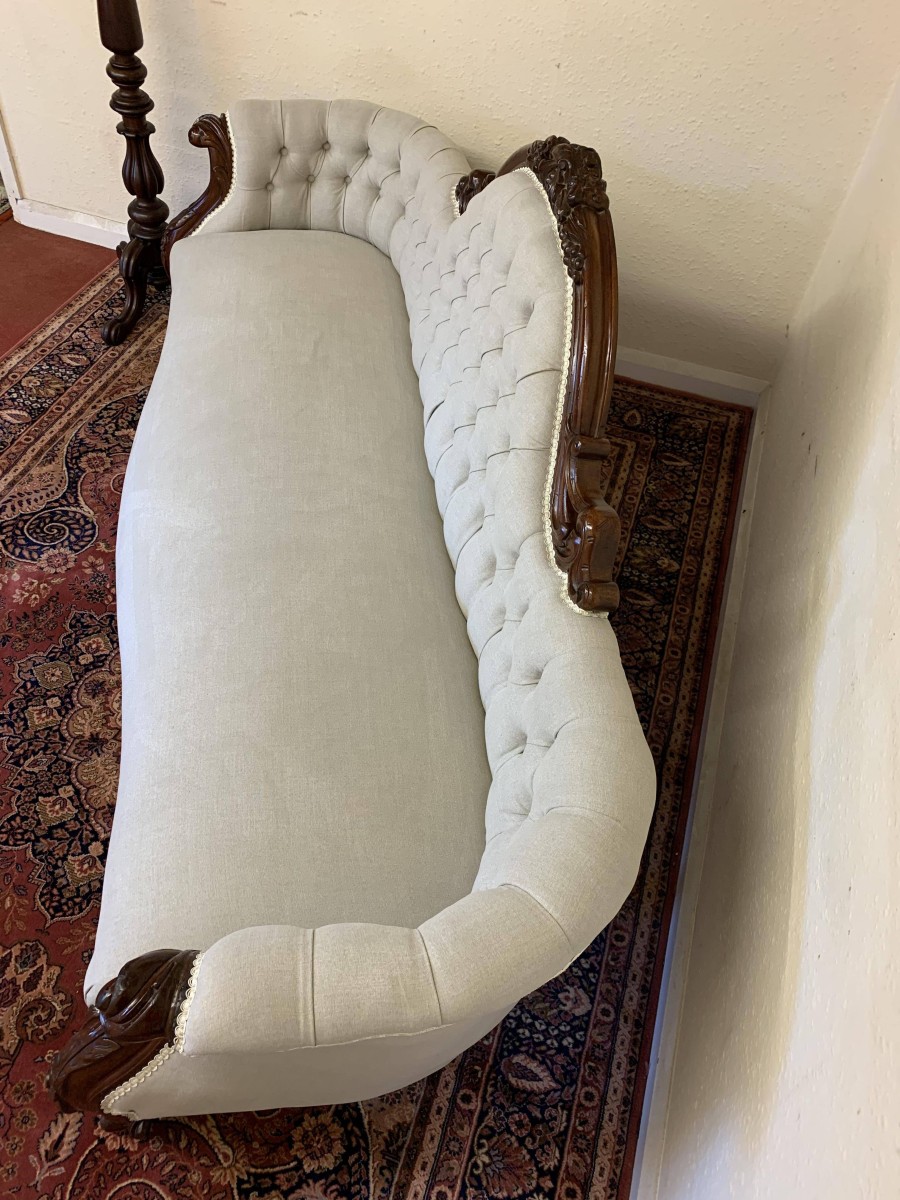 This stunning antique settee is in excellent condition and dates Circa 1865. The back rises to a fabulous central carving. Carved flowing arms, shaped skirt this fabulous settee stands on carved cabriole legs to the front. This newly reupholsterd settee has a deep buttoned back and cushioned serpentine outline seat. The neutral on trend fabric will blend with any interior.