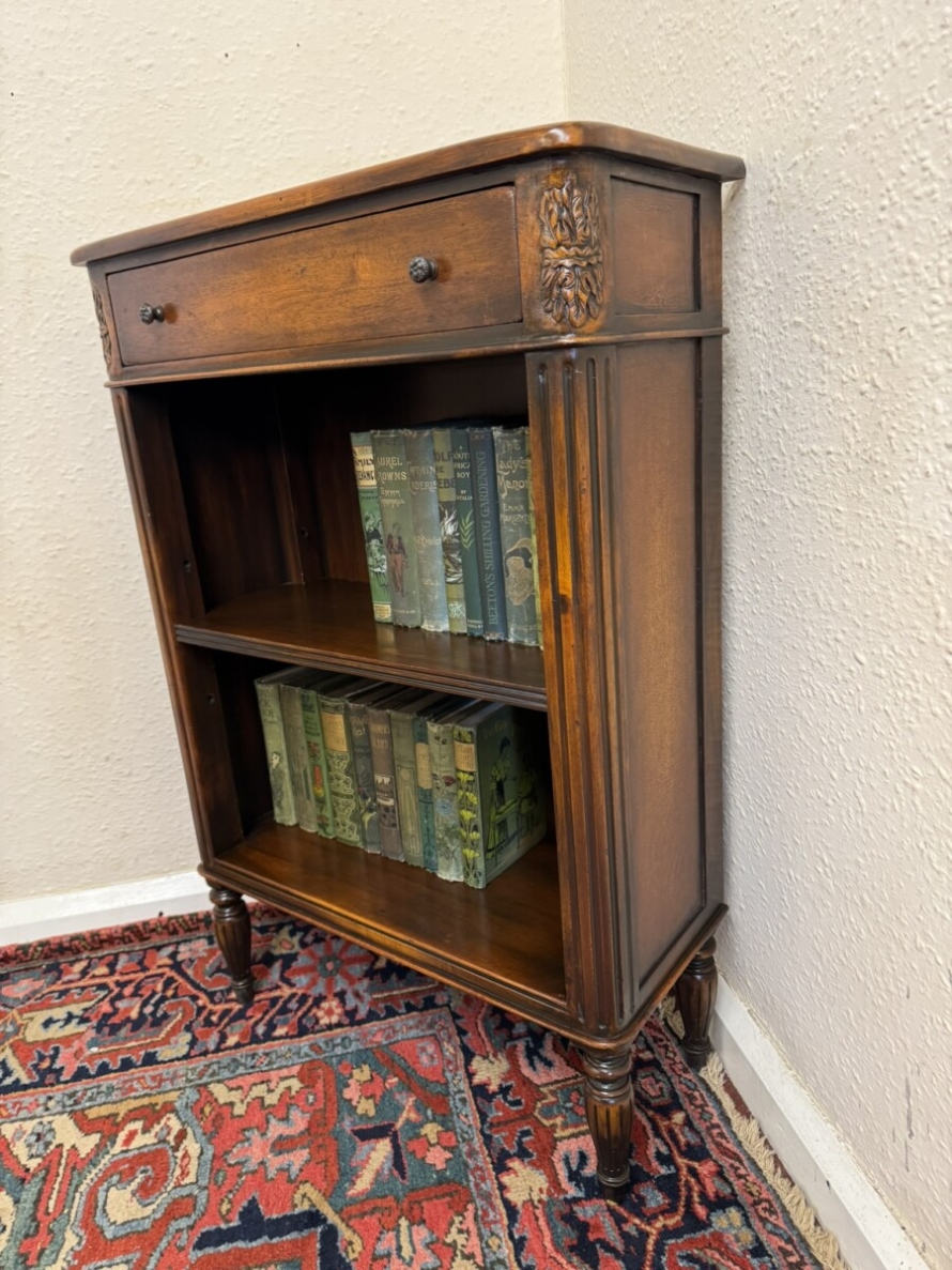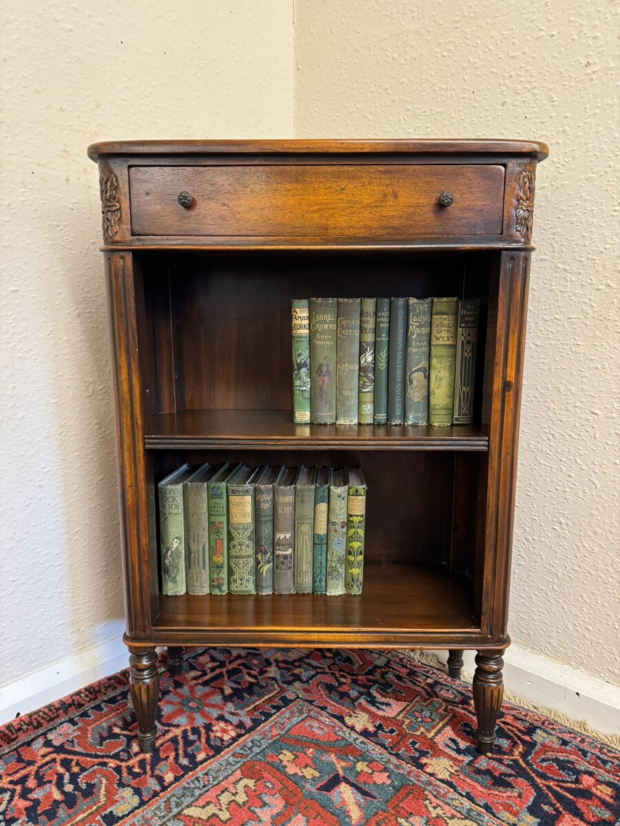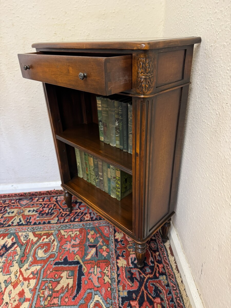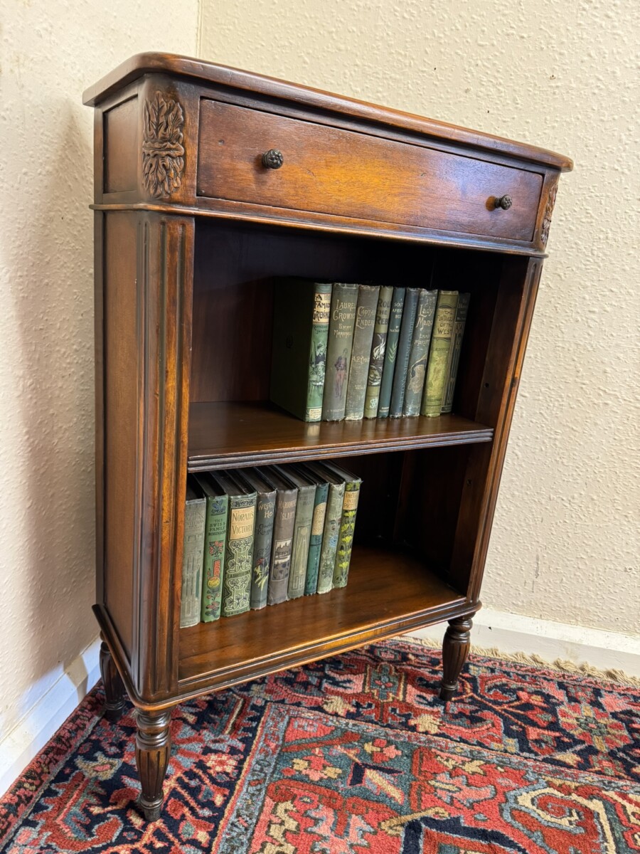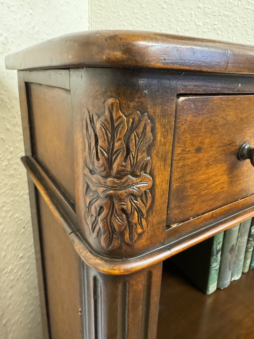 The oversailing top has rounded corners to the front, below is a drawer, the drawer having a pair of button handles. To the sides of the drawer are decorative carvings. Open book shelves below with adjustable and removable shelf. Recessed panelled sides and standing on four elegant turned legs with turned feet.