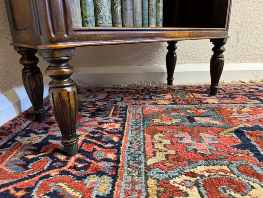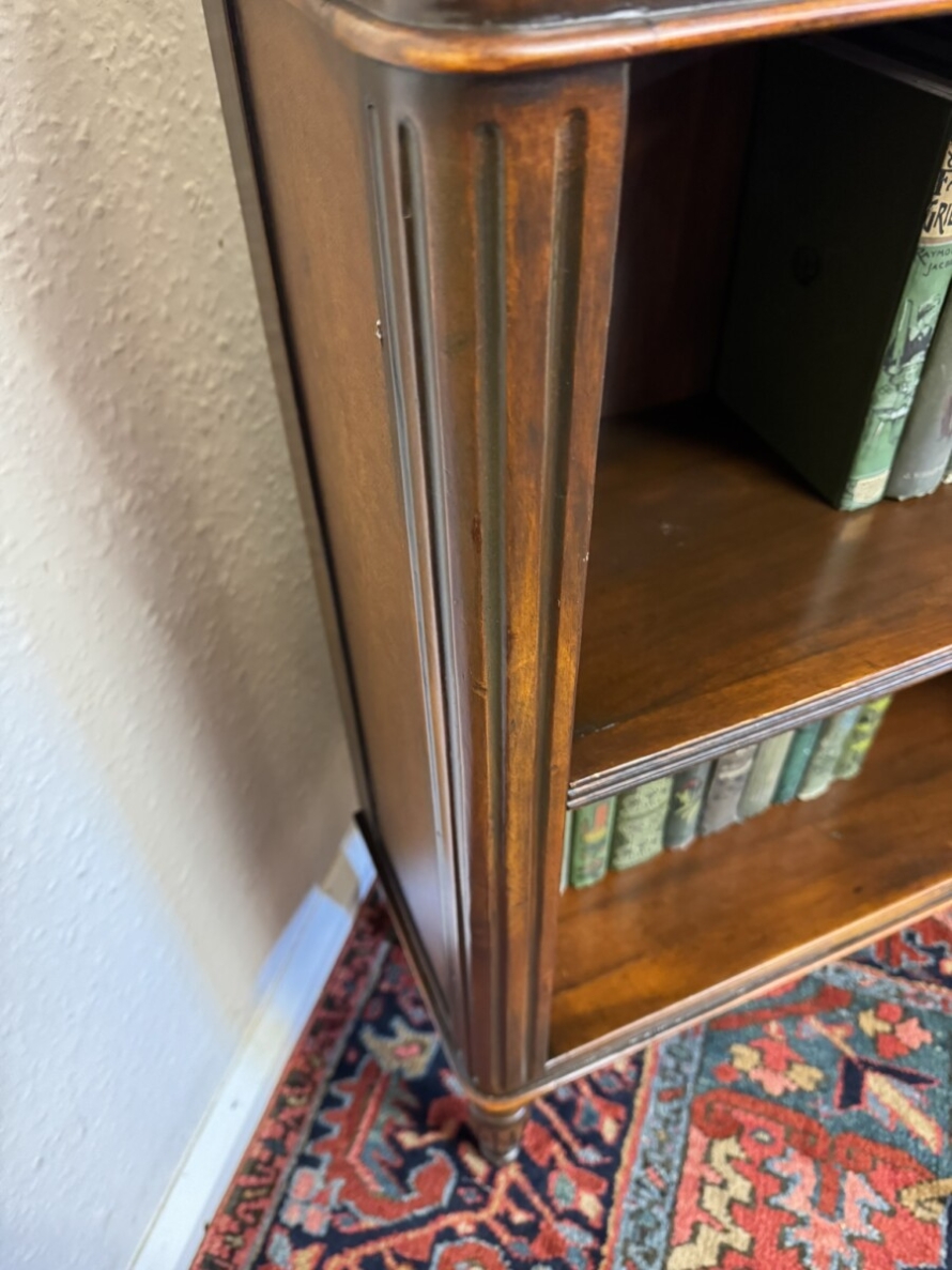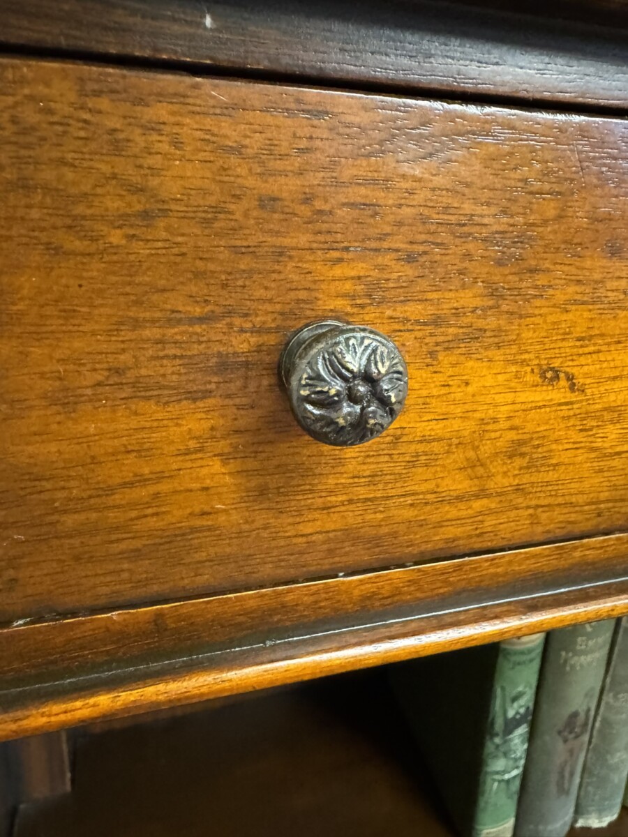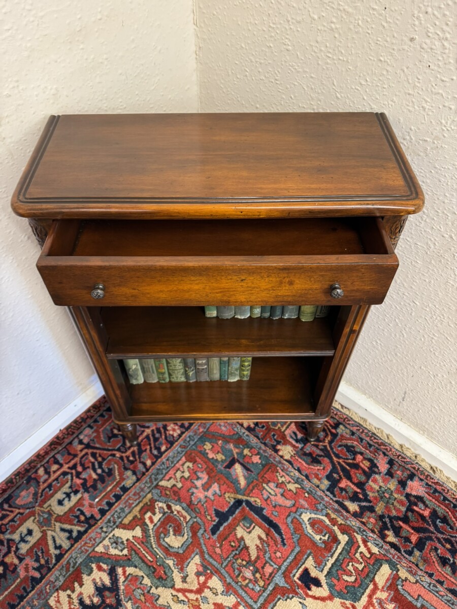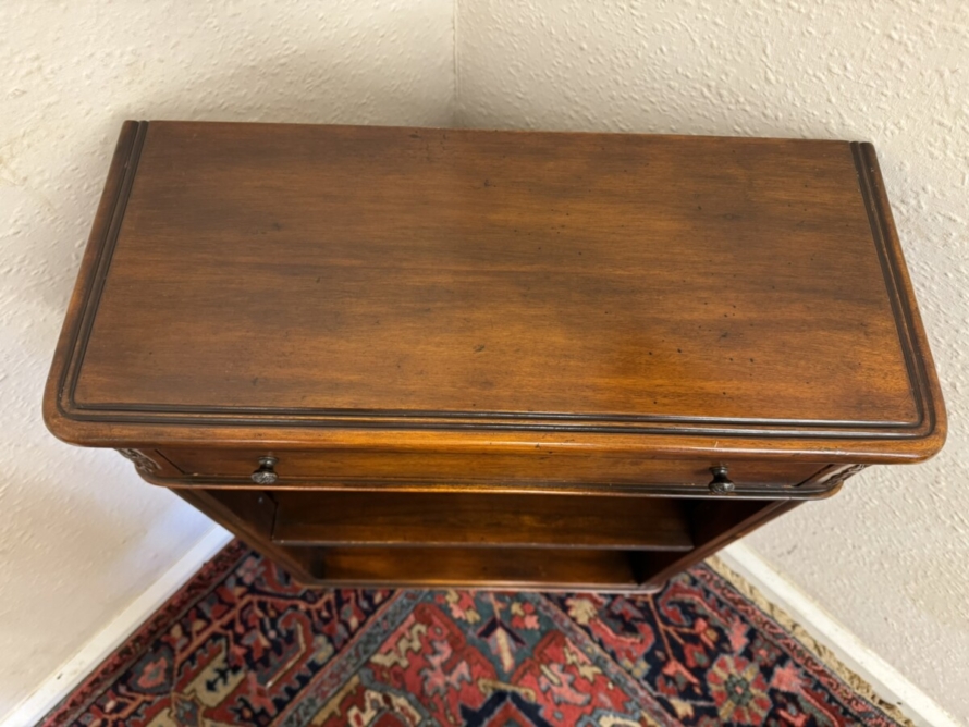 The oversailing top has rounded corners to the front, below is a drawer, the drawer having a pair of button handles. To the sides of the drawer are decorative carvings. Open book shelves below with adjustable and removable shelf. Recessed panelled sides and standing on four elegant turned legs with turned feet.