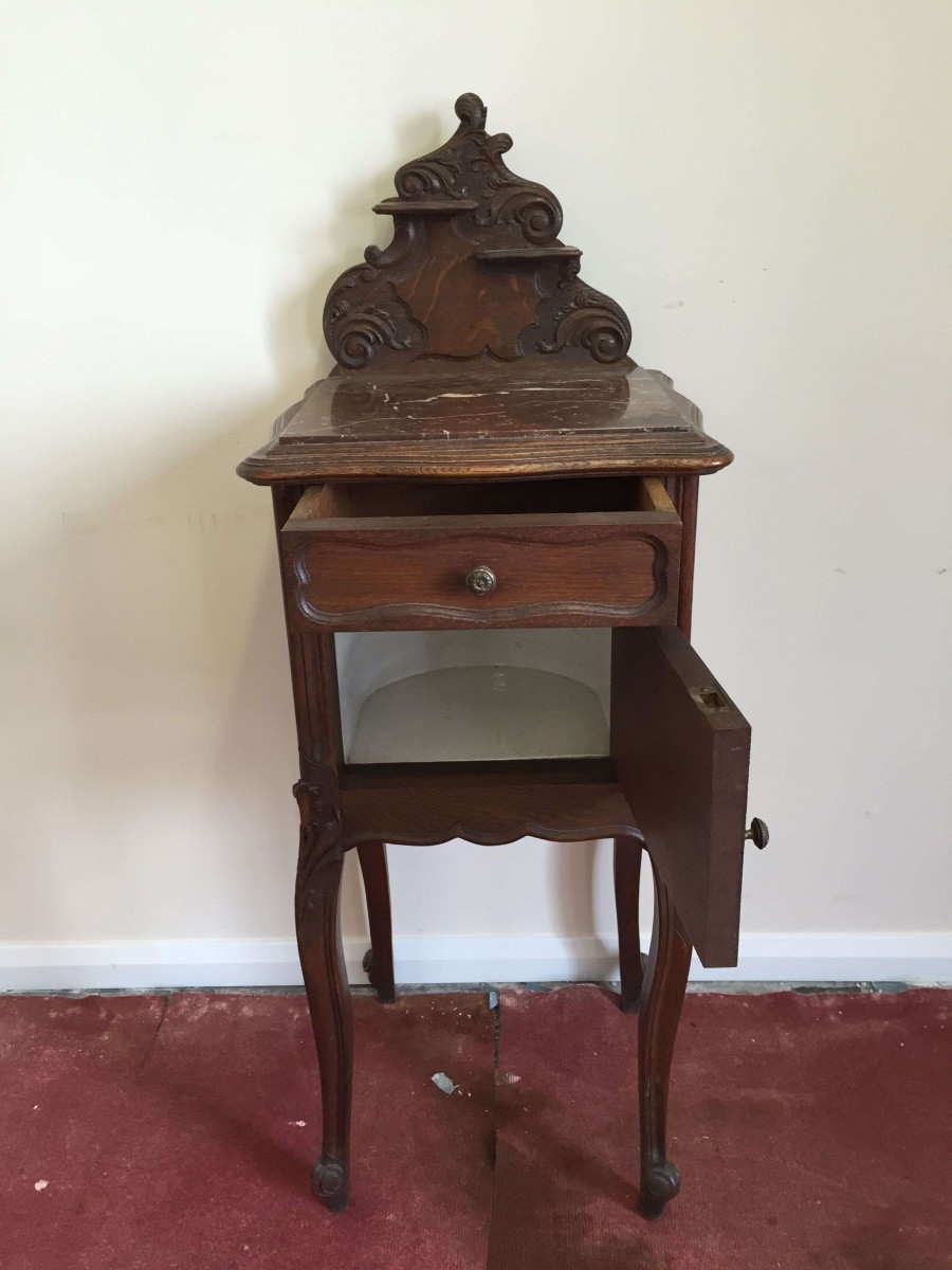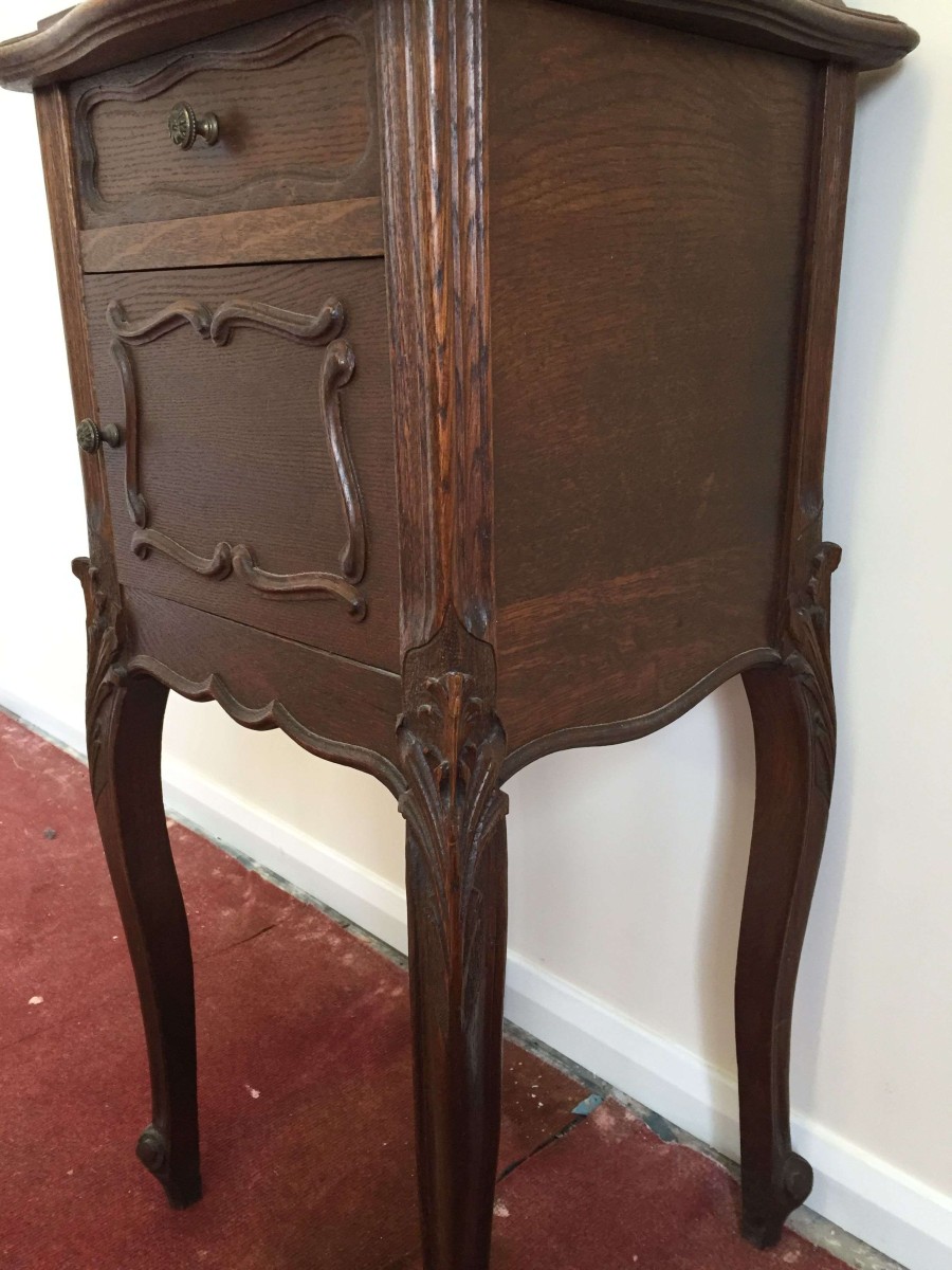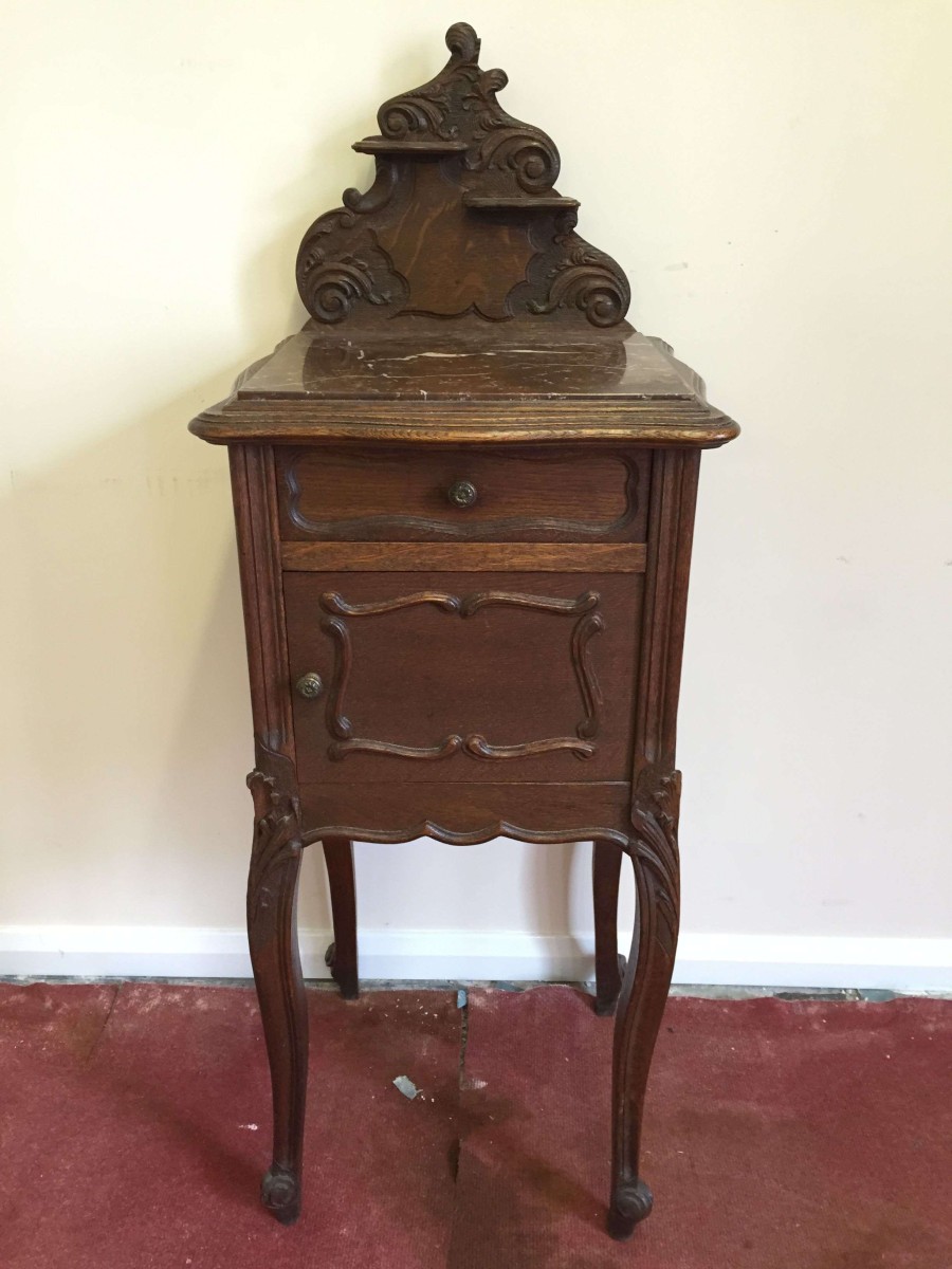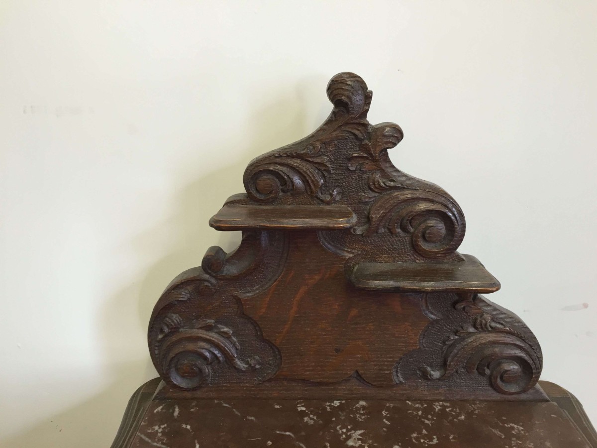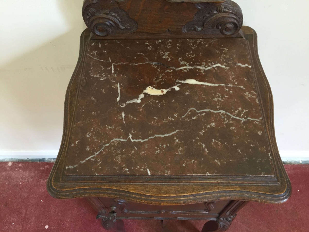 French carved oak, marble top, shaped back, four carved cabriole legs, drawer and cupboard