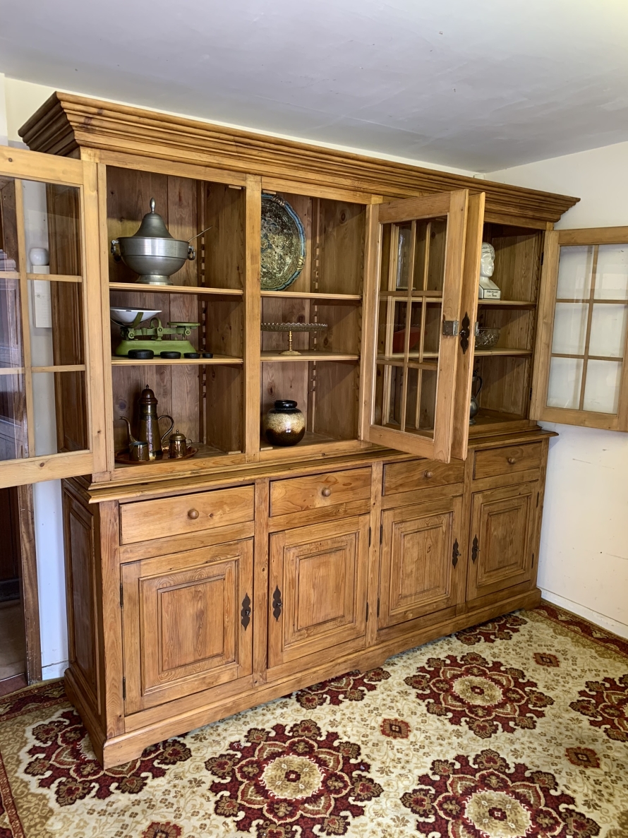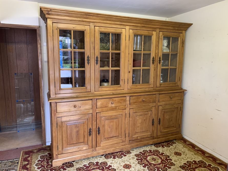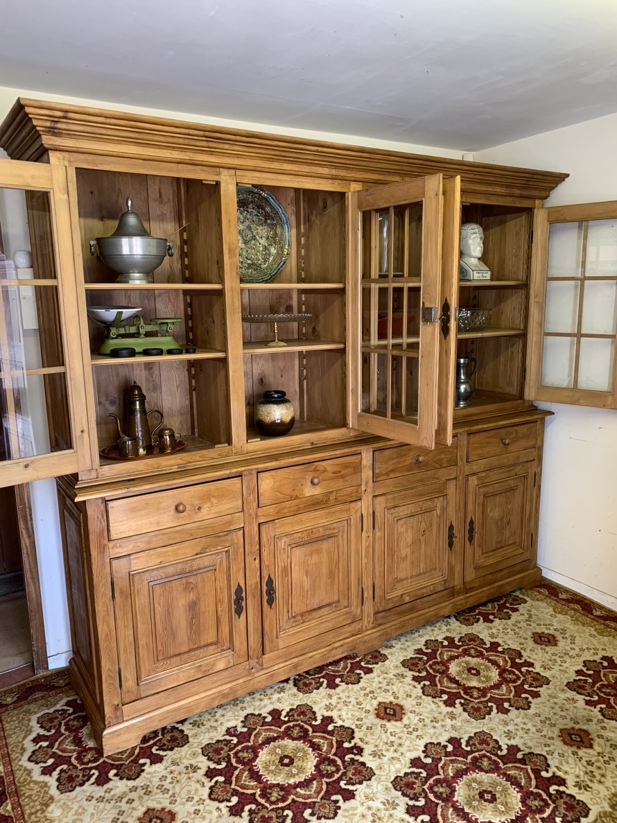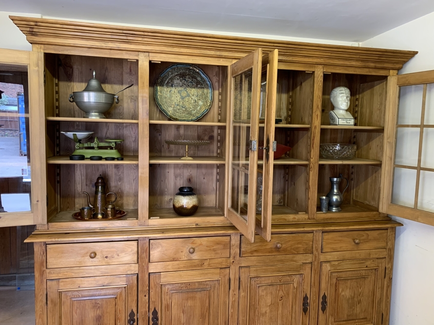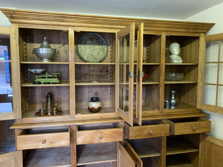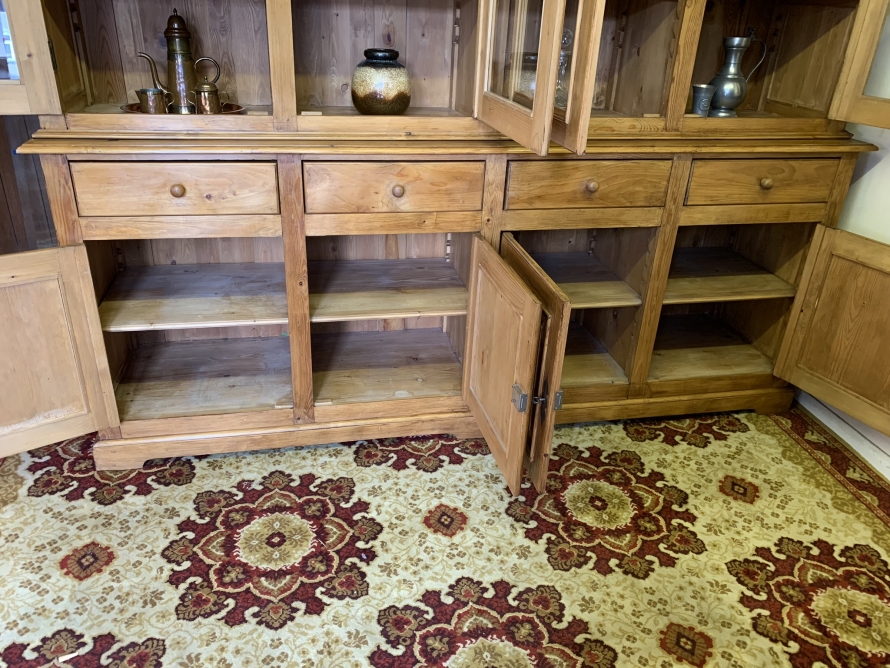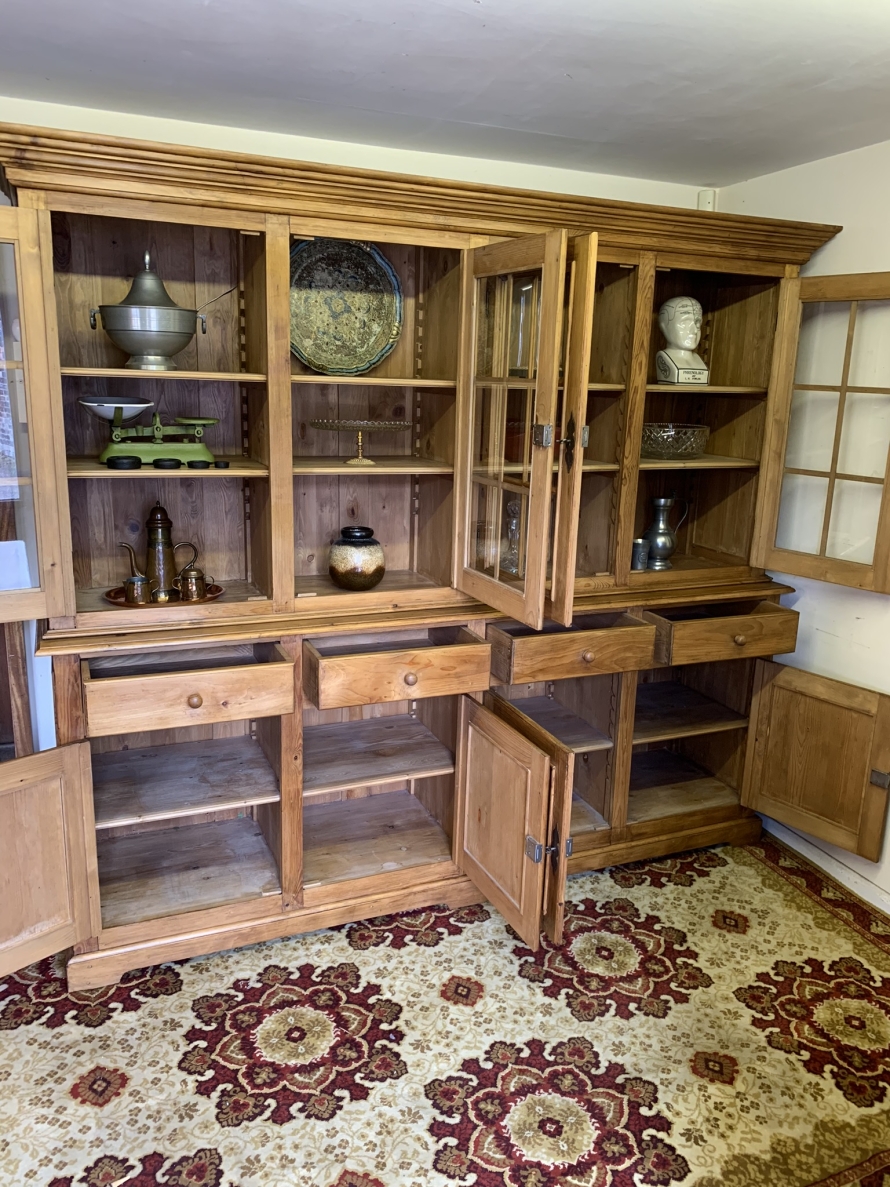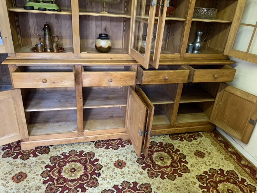 The stepped top sits above four lockable glazed doors, the doors open to reveal two adjustable and removable shelves. With four drawers below, each drawer having a turned knob handle. Below the drawers are four lockable fielded panelled cupboard doors, the doors open to reveal an adjustable and removable shelf. Fielded panelled sides and sitting on a bracket plinth base.