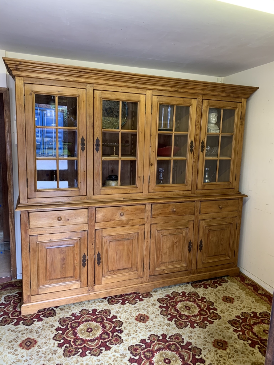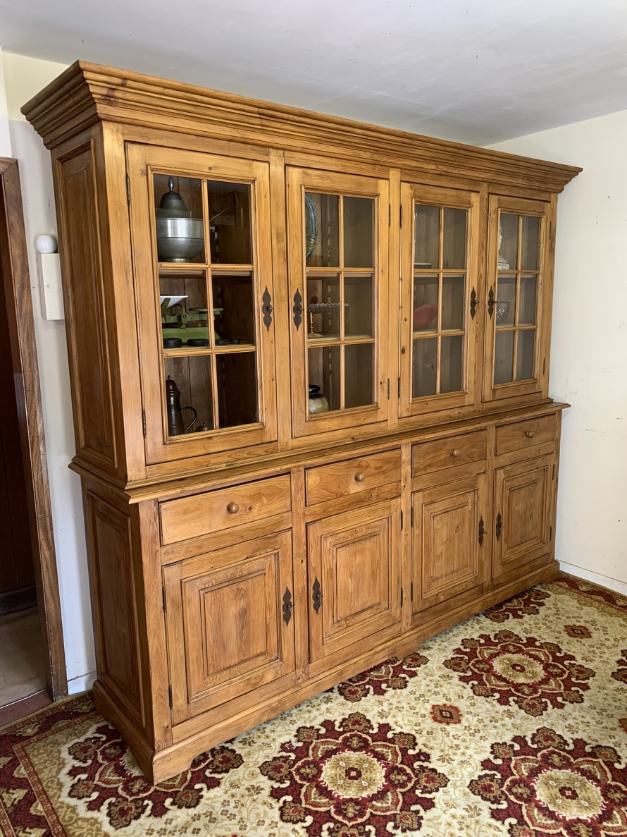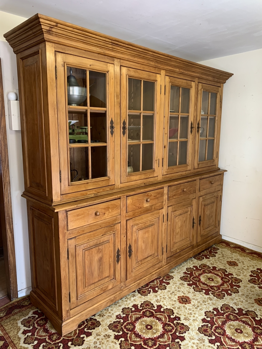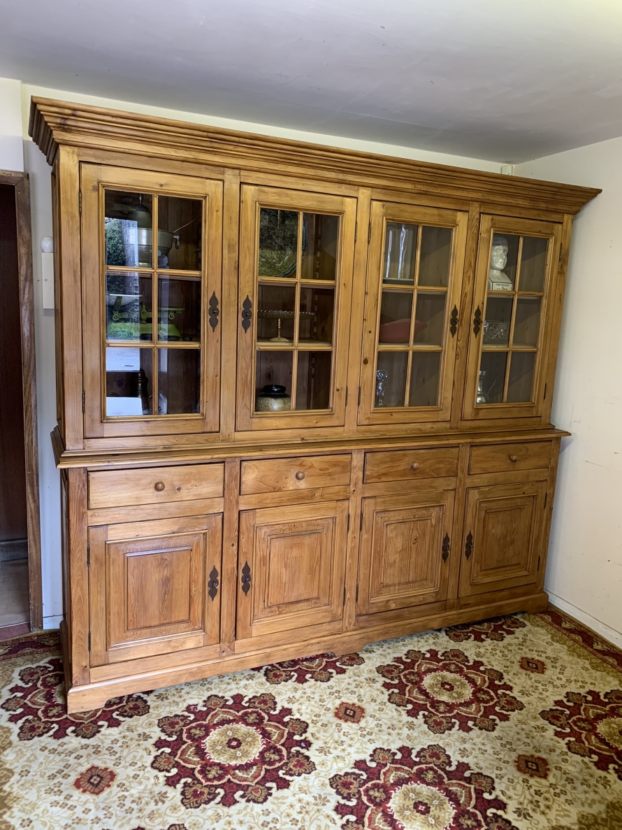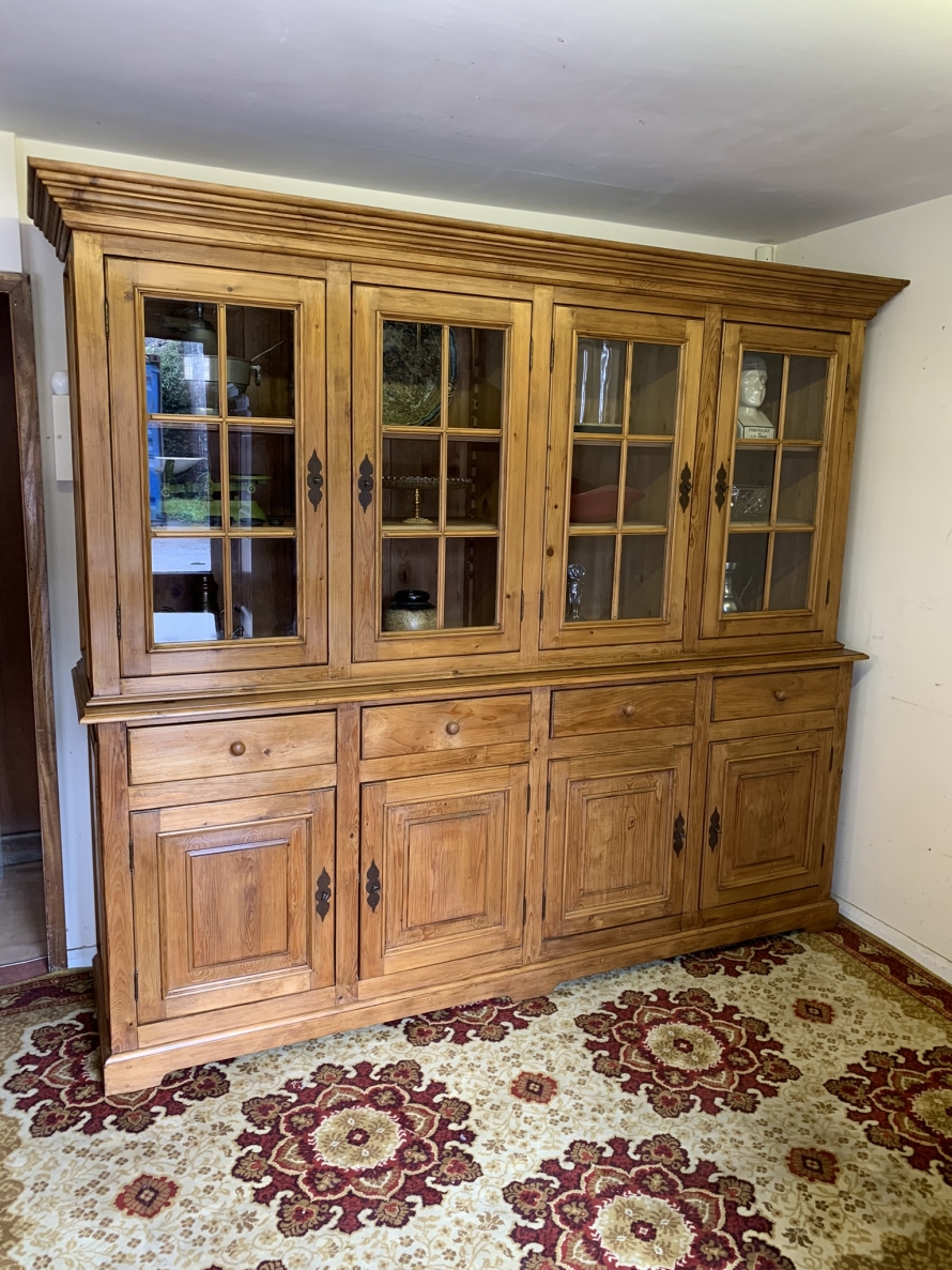 The stepped top sits above four lockable glazed doors, the doors open to reveal two adjustable and removable shelves. With four drawers below, each drawer having a turned knob handle. Below the drawers are four lockable fielded panelled cupboard doors, the doors open to reveal an adjustable and removable shelf. Fielded panelled sides and sitting on a bracket plinth base.