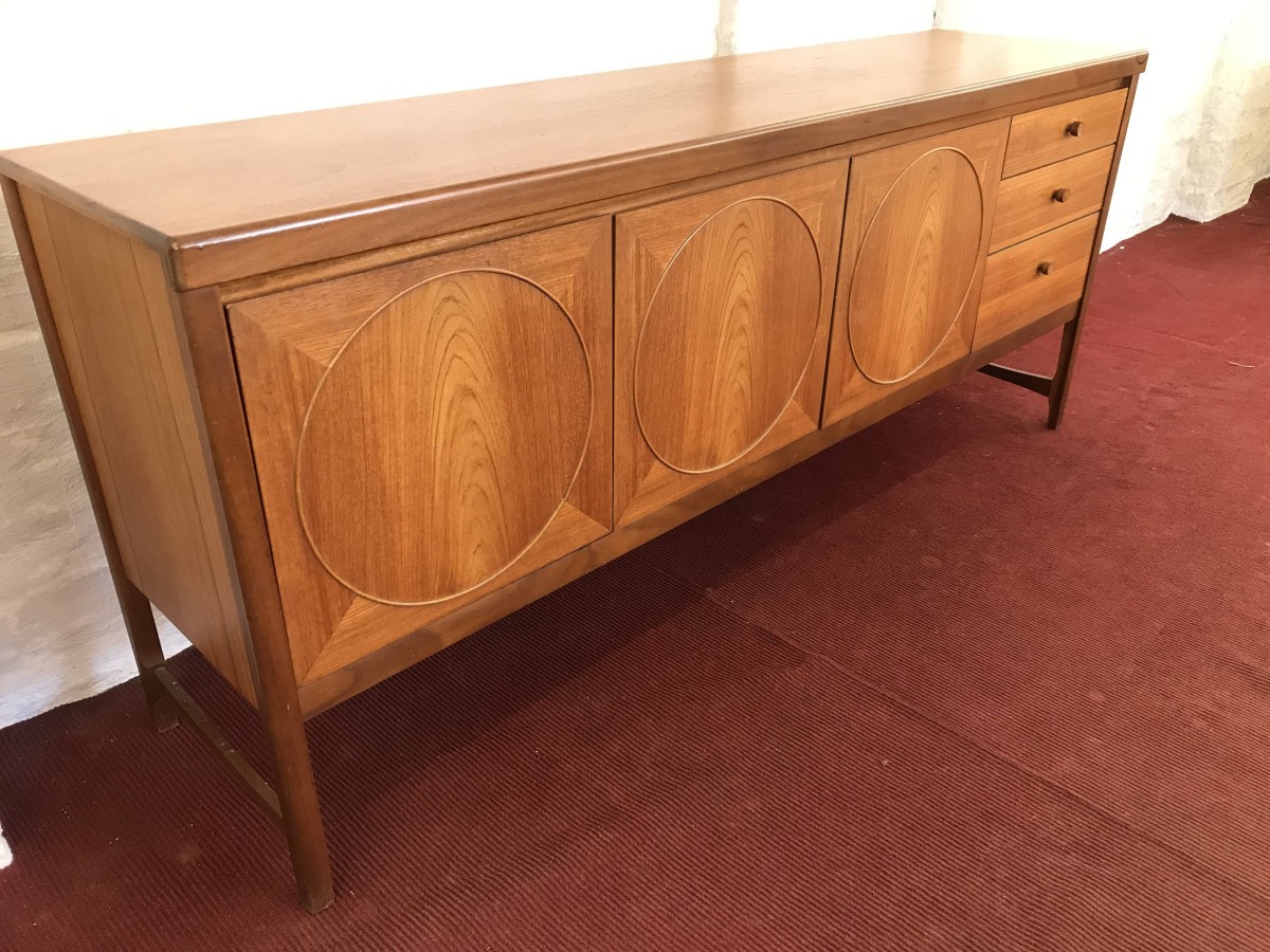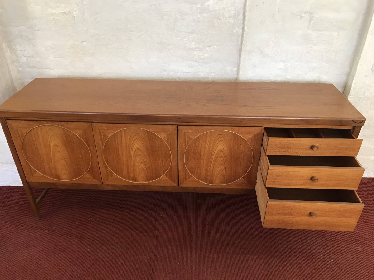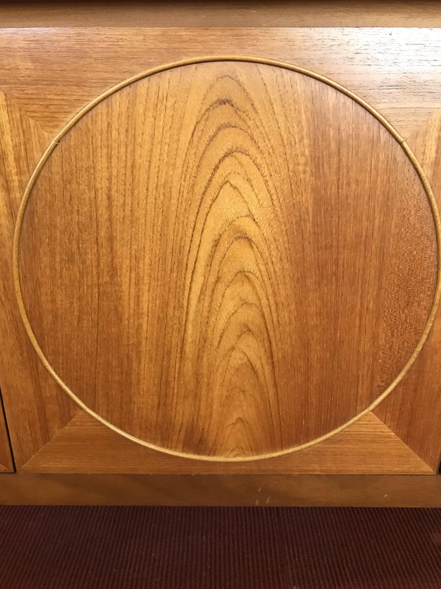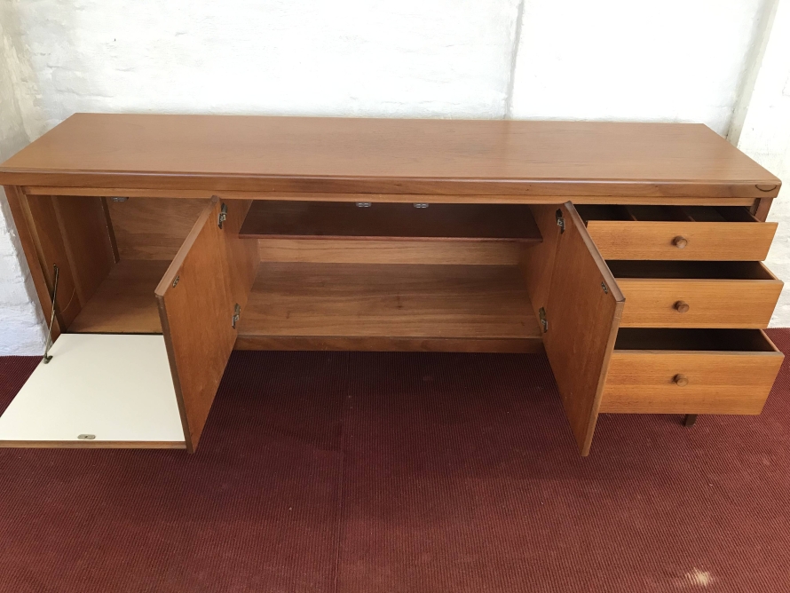 This mid-century teak sideboard/credenza features an inlaid veneer, drop down drinks cabinet, a large main compartment with a shelf, and three drawers graduating in size.