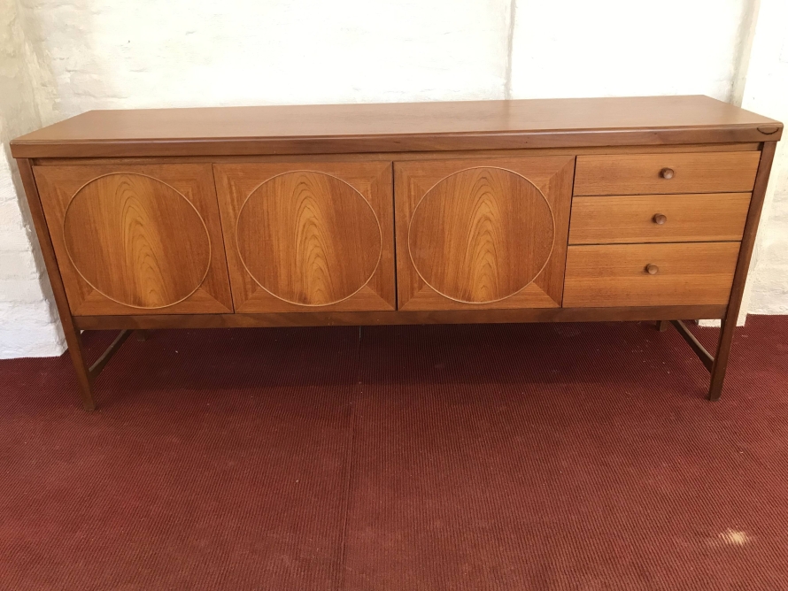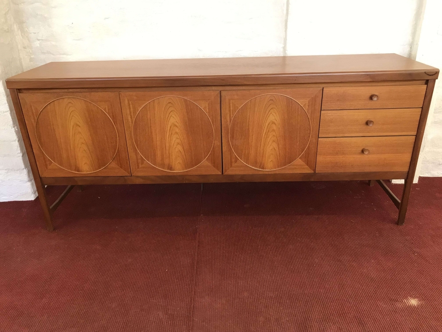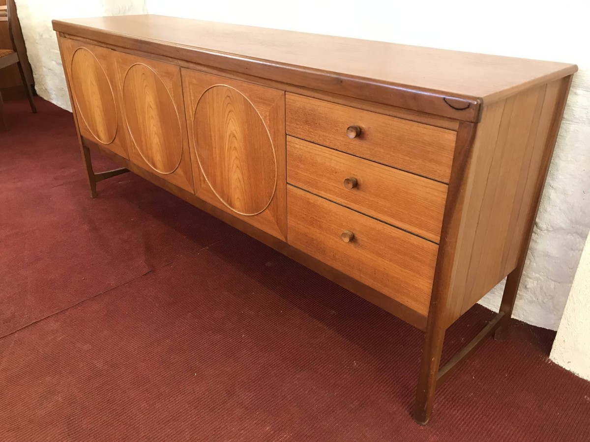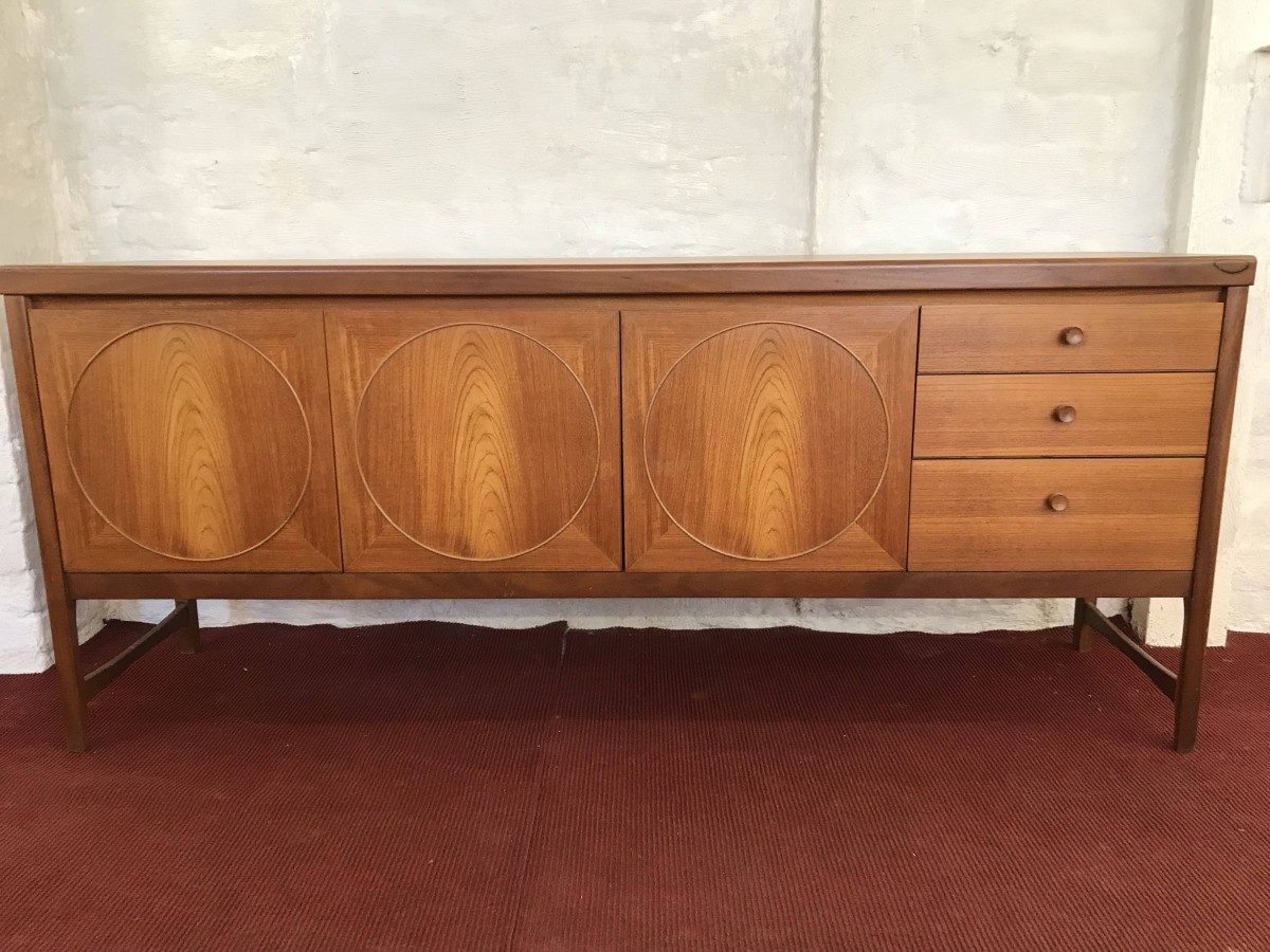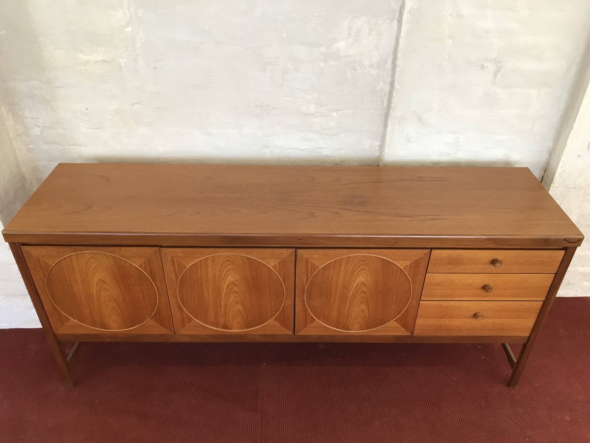 This mid-century teak sideboard/credenza features an inlaid veneer, drop down drinks cabinet, a large main compartment with a shelf, and three drawers graduating in size.